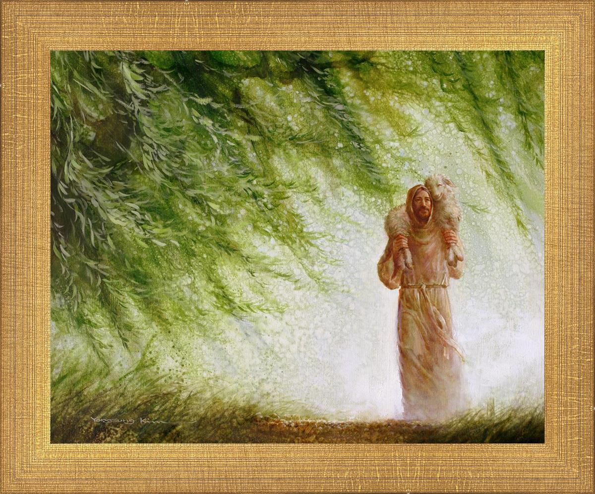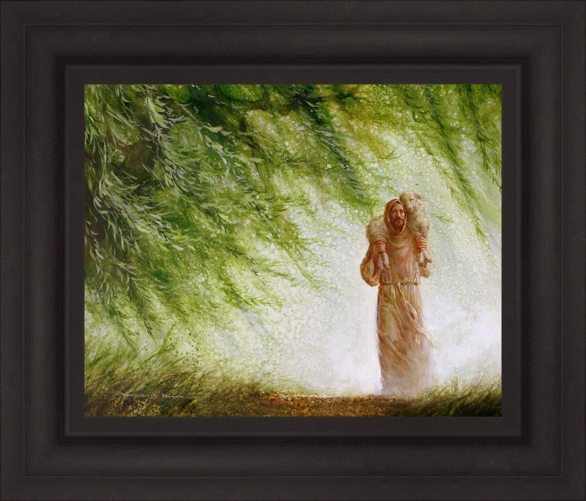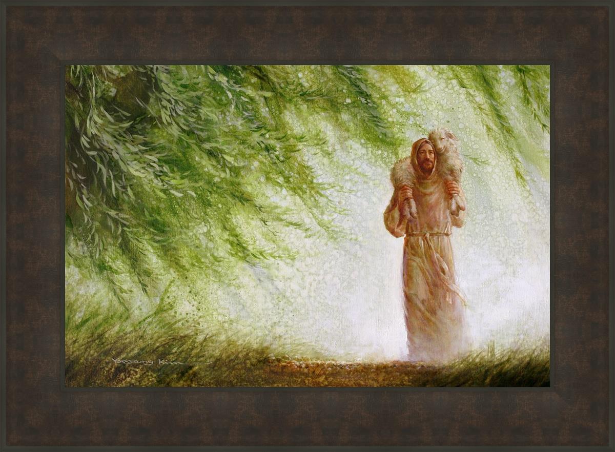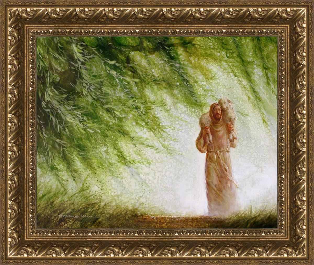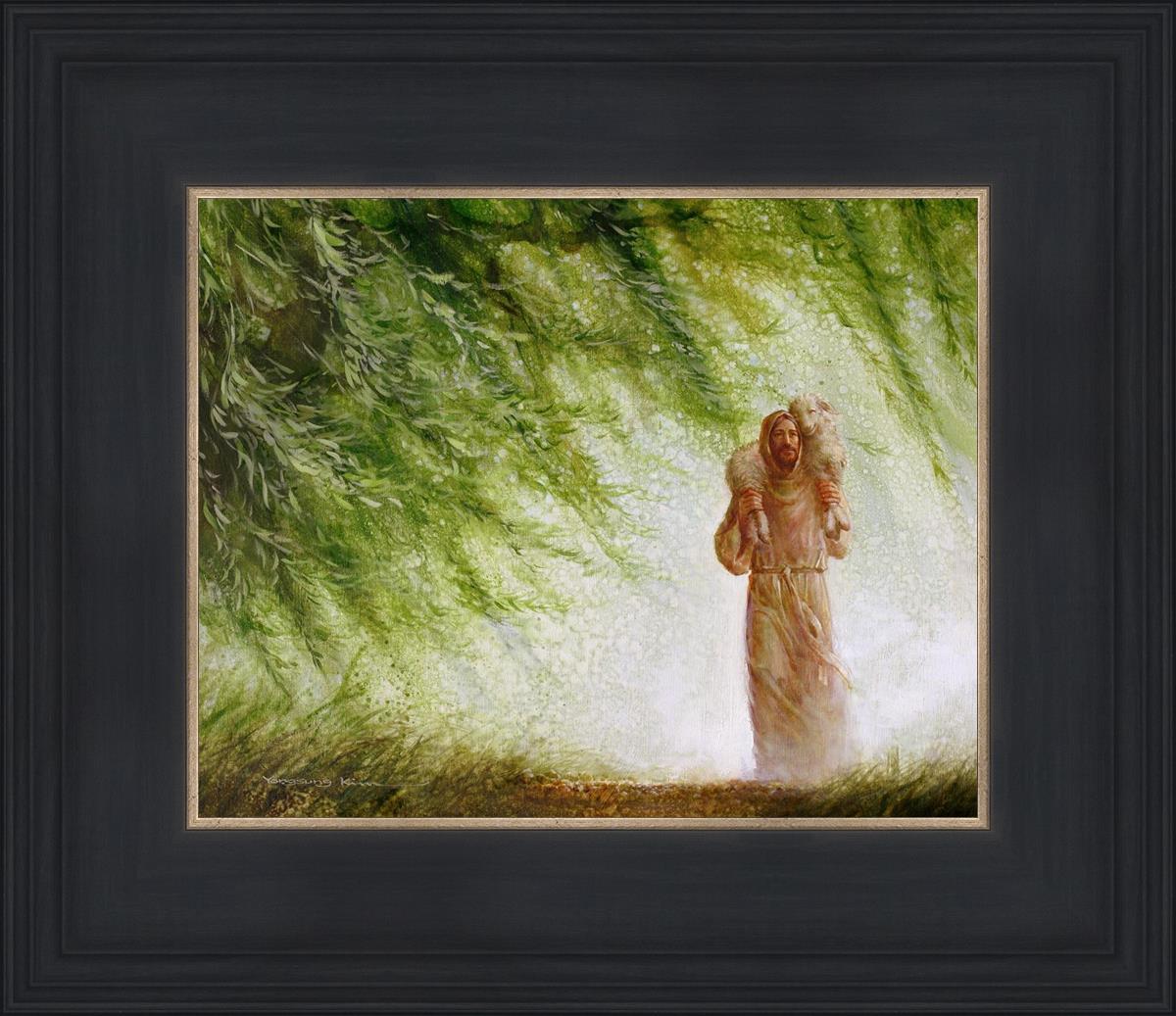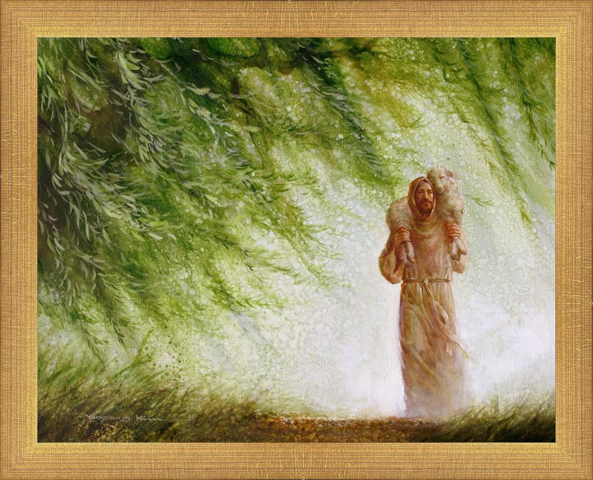 This painting powerfully captures a moment of protection and care, as Jesus Christ carries a lamb on His shoulders. The lamb represents the lost, the weary, and the broken, finding refuge in His embrace. Christ carrying the lamb on His shoulders serves as a visual metaphor for divine love and the promise that no one is ever too lost to be found. Carry On invites the viewer to reflect on the Savior's enduring presence and His loving support in times of difficulty, offering a message of hope, strength, and grace.