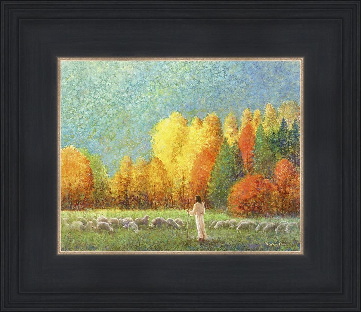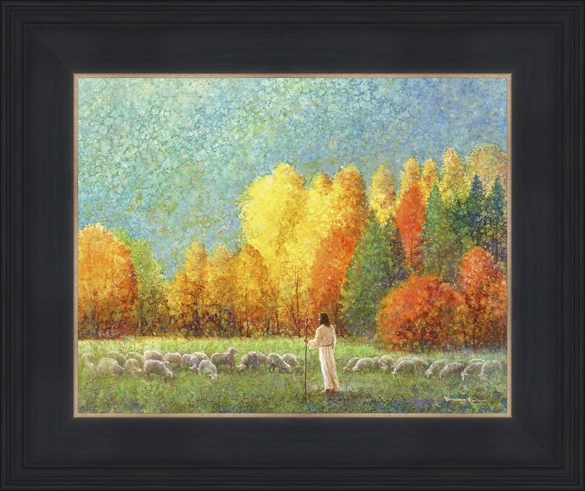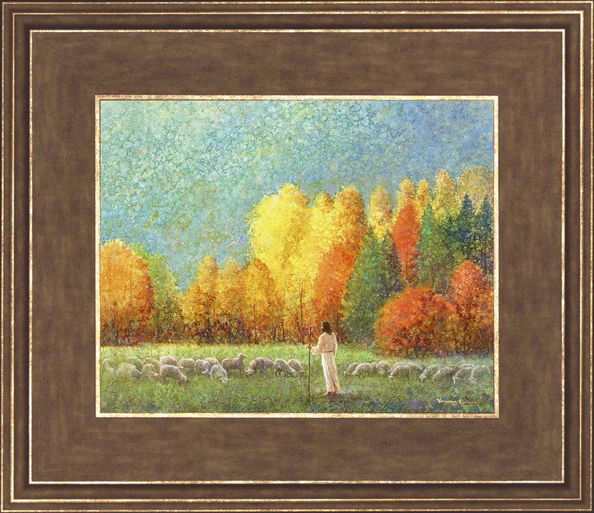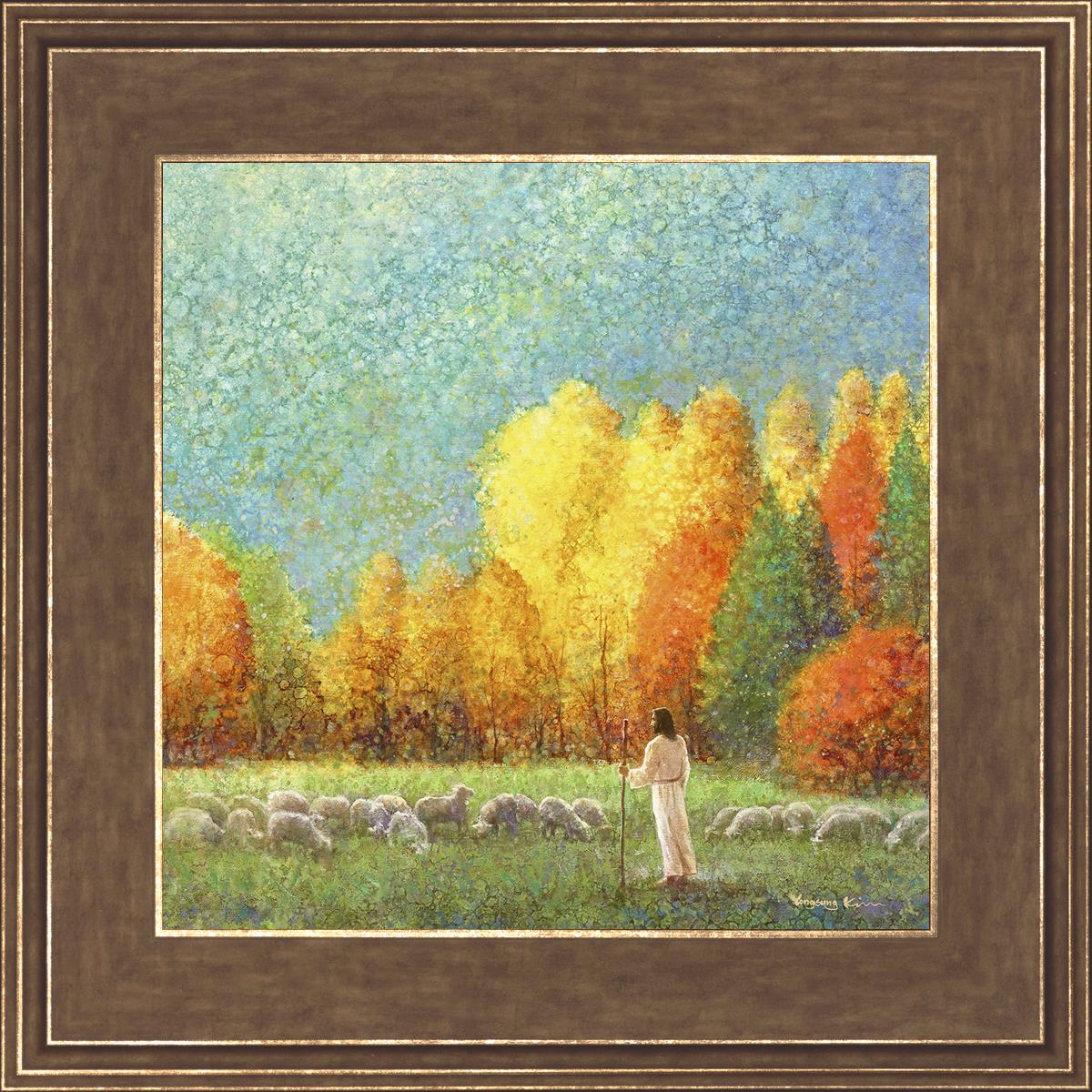 This painting shows Jesus Christ lovingly watching over His flock in a field bathed in warm, golden light. His gaze is both watchful and compassionate as He cares for His sheep. The artwork beautifully captures the natural beauty of the world while also conveying the divine protection that envelops all within it. The rich autumn colors contrast with the peaceful stillness of the scene, creating a sense of harmony between the changing seasons and the timeless, unchanging nature of His care. Changing Seasons serves as a poignant reminder that, though the seasons may change, Christ's love and care for us remain steadfast.