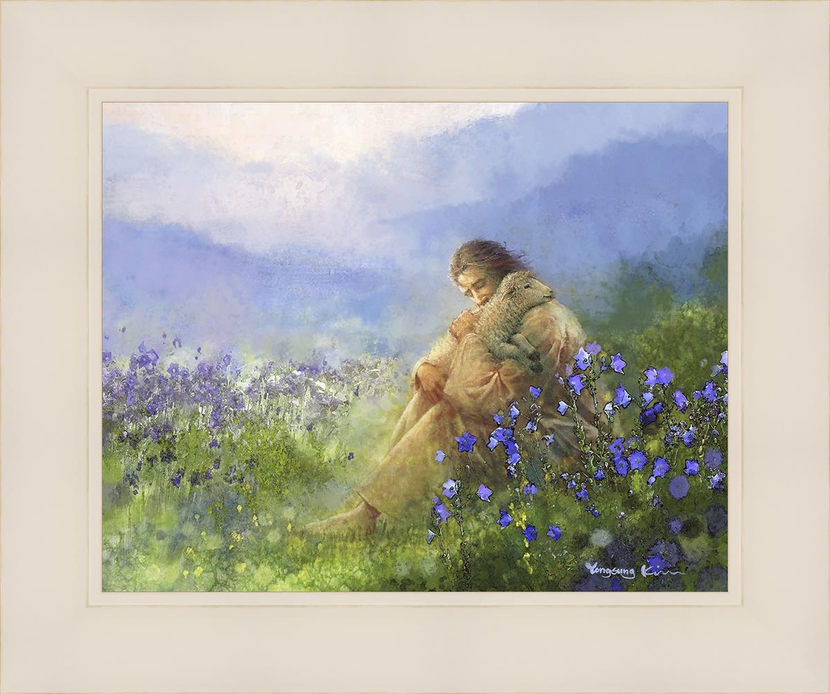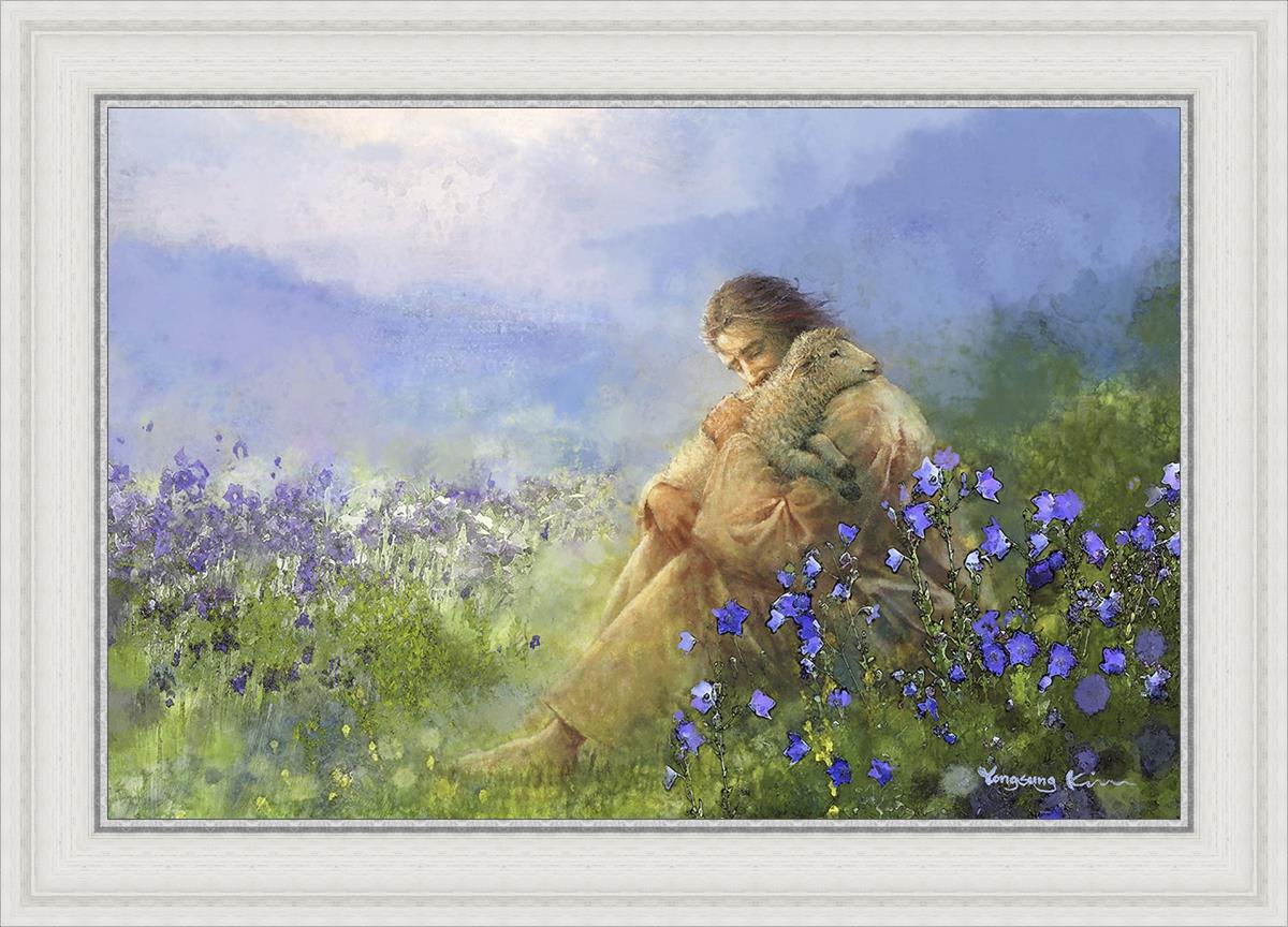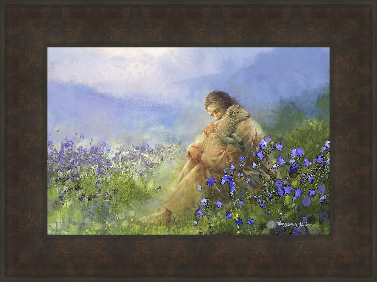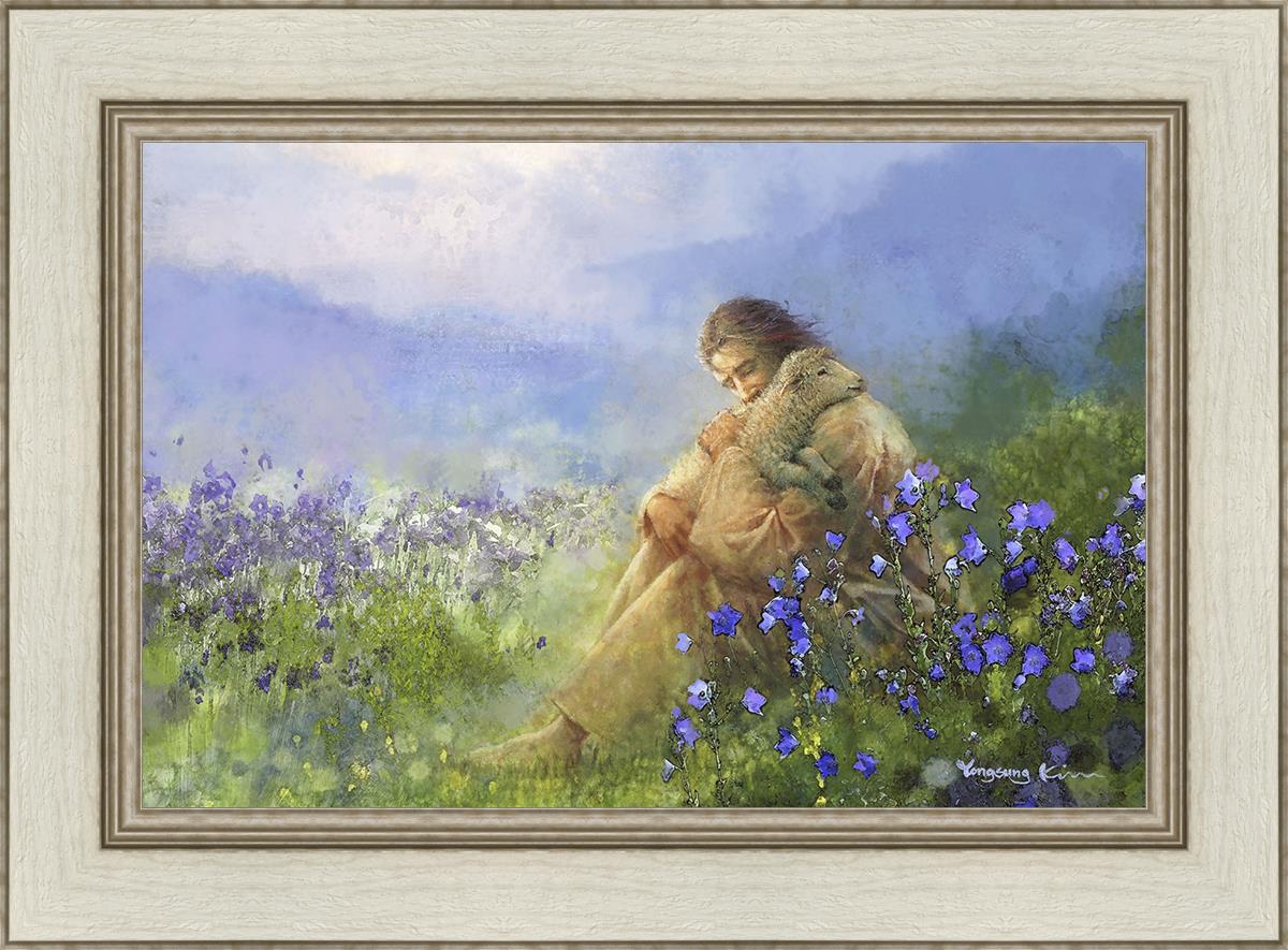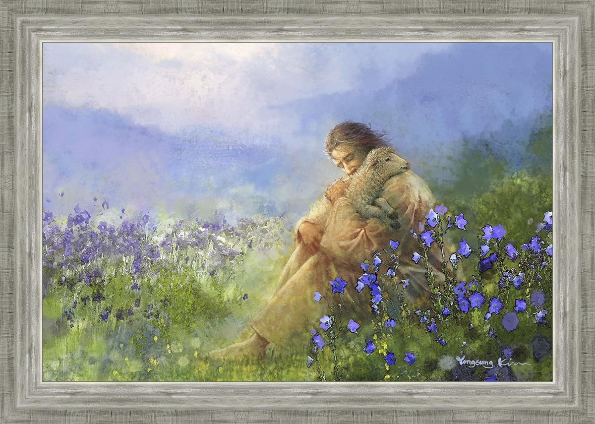 This painting portrays Jesus Christ seated in a field, gently cradling a lamb in His arms. Surrounded by vibrant purple flowers, the scene radiates tranquility and divine care. The lamb, a symbol of innocence and purity, nestles comfortably in Jesus' embrace, embodying His role as the Good Shepherd who offers comfort and protection. Through this tender moment, the painting beautifully captures Jesus as the Good Shepherd, offering solace and reassurance to all who seek Him.