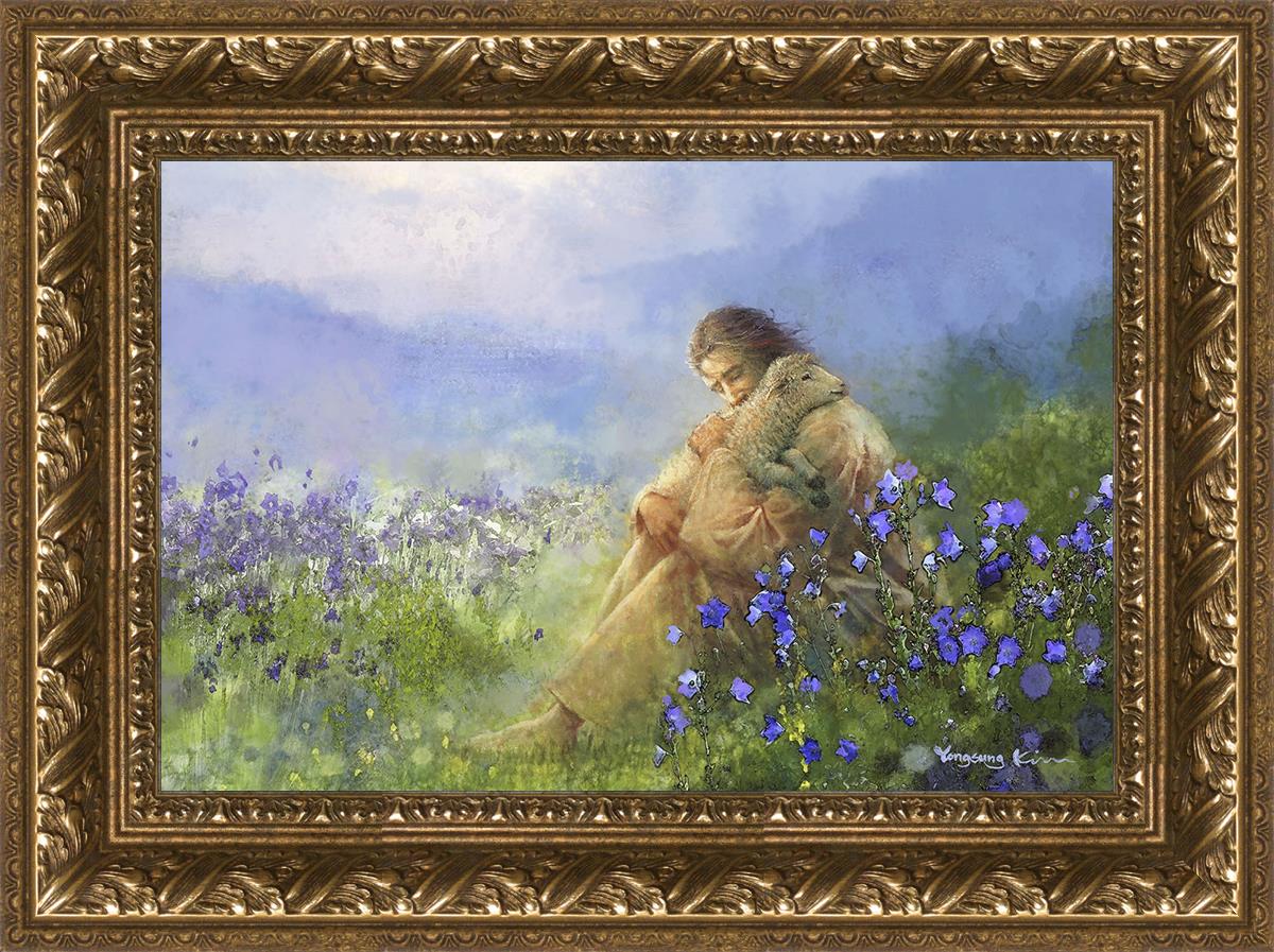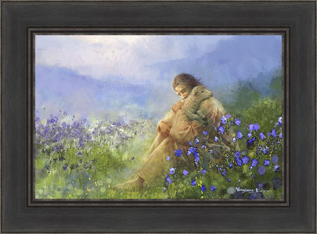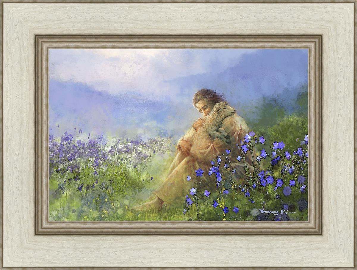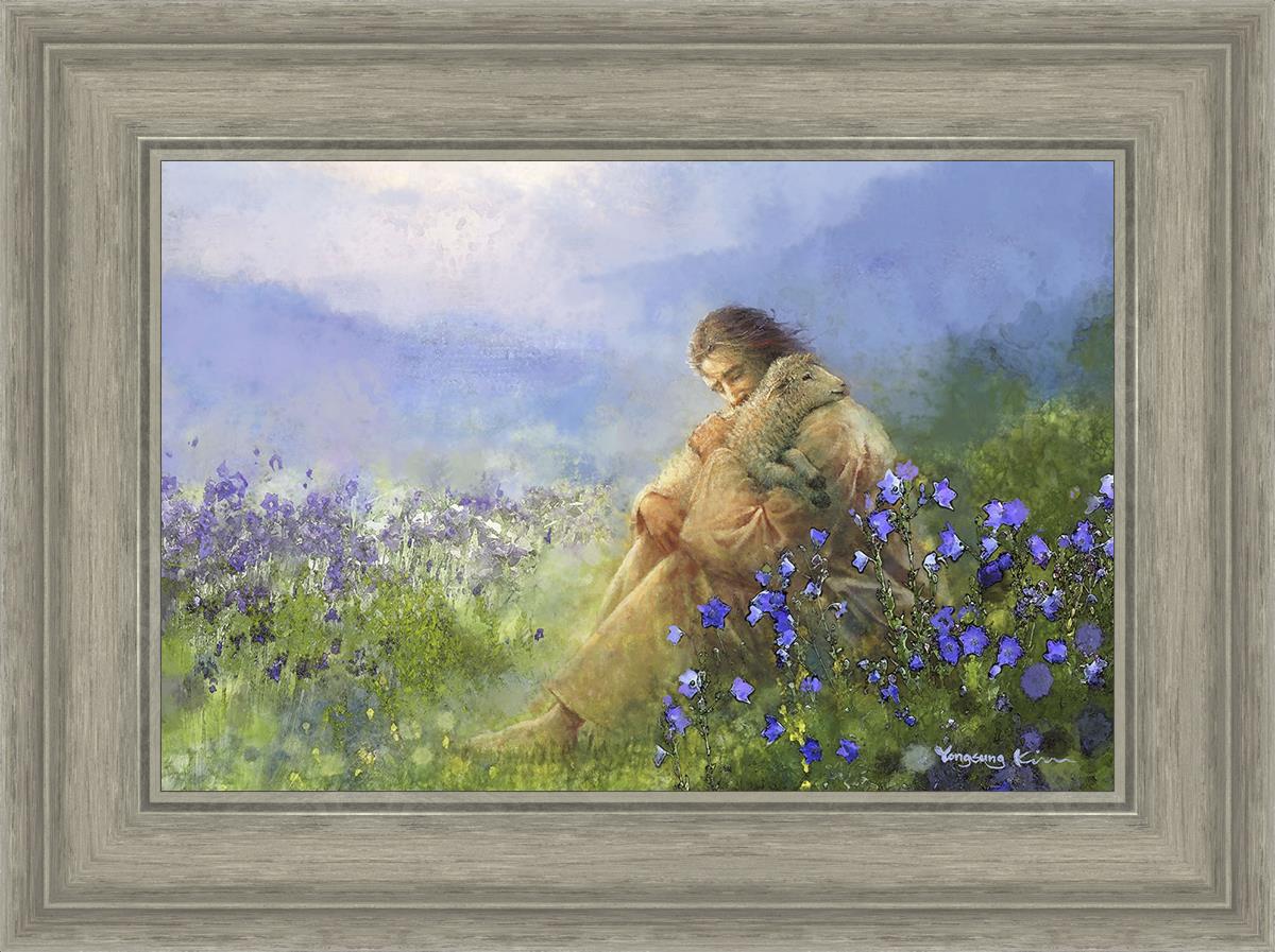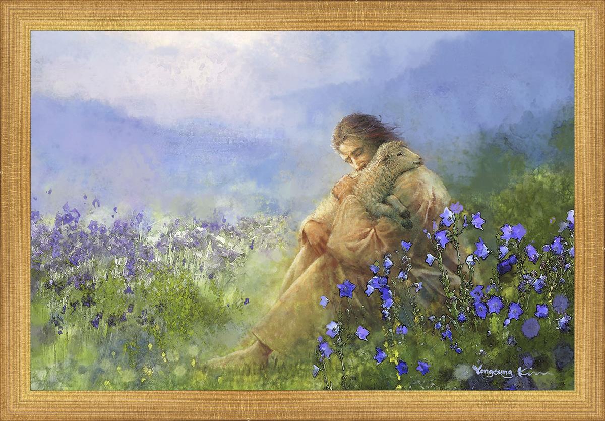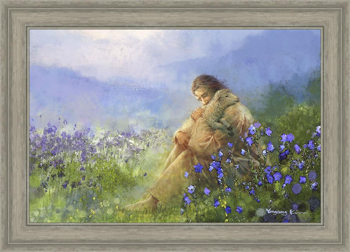 This painting portrays Jesus Christ seated in a field, gently cradling a lamb in His arms. Surrounded by vibrant purple flowers, the scene radiates tranquility and divine care. The lamb, a symbol of innocence and purity, nestles comfortably in Jesus' embrace, embodying His role as the Good Shepherd who offers comfort and protection. Through this tender moment, the painting beautifully captures Jesus as the Good Shepherd, offering solace and reassurance to all who seek Him.