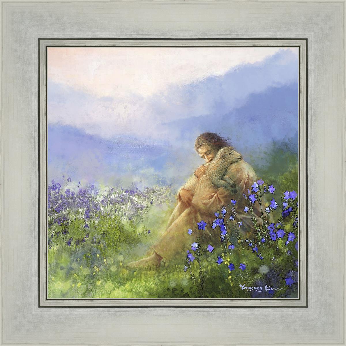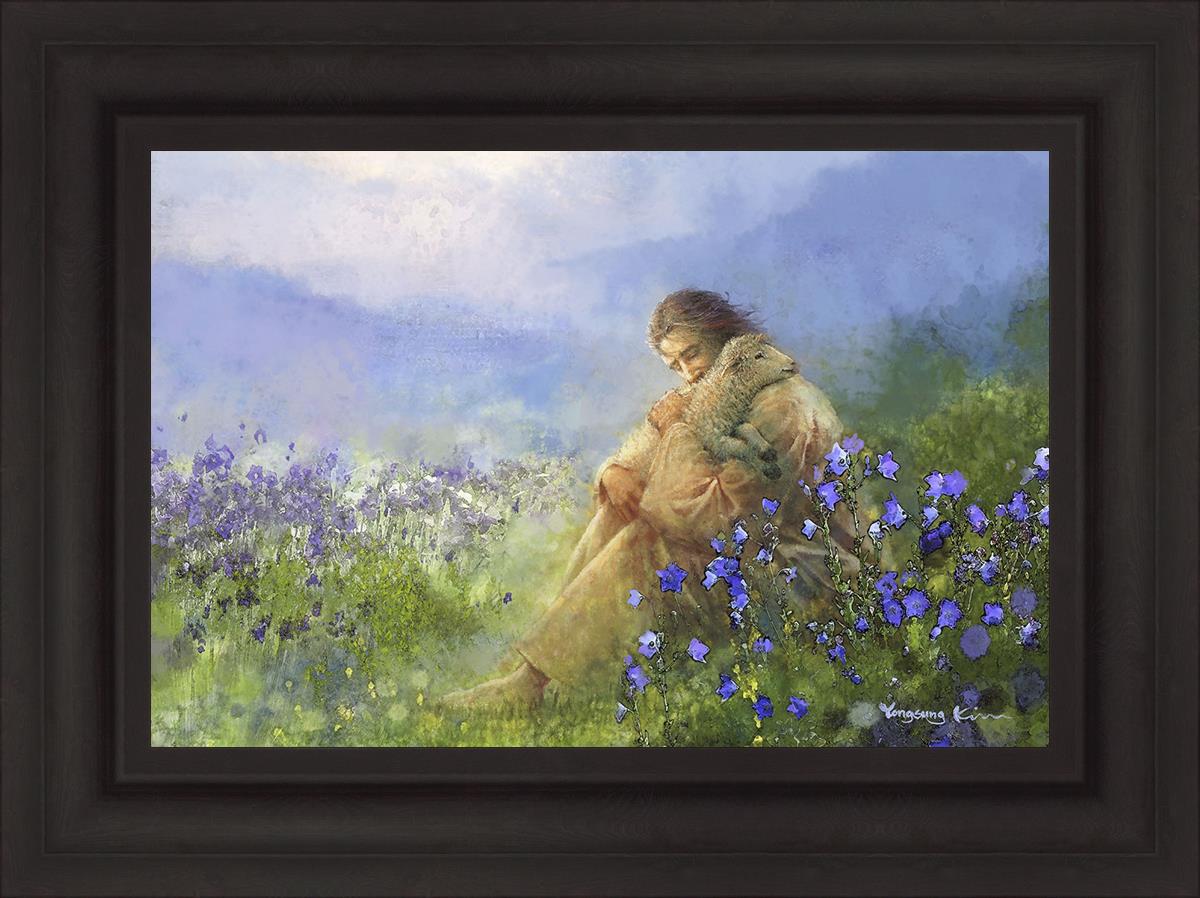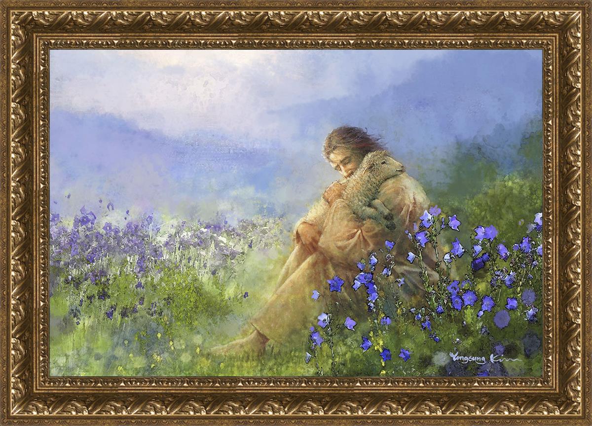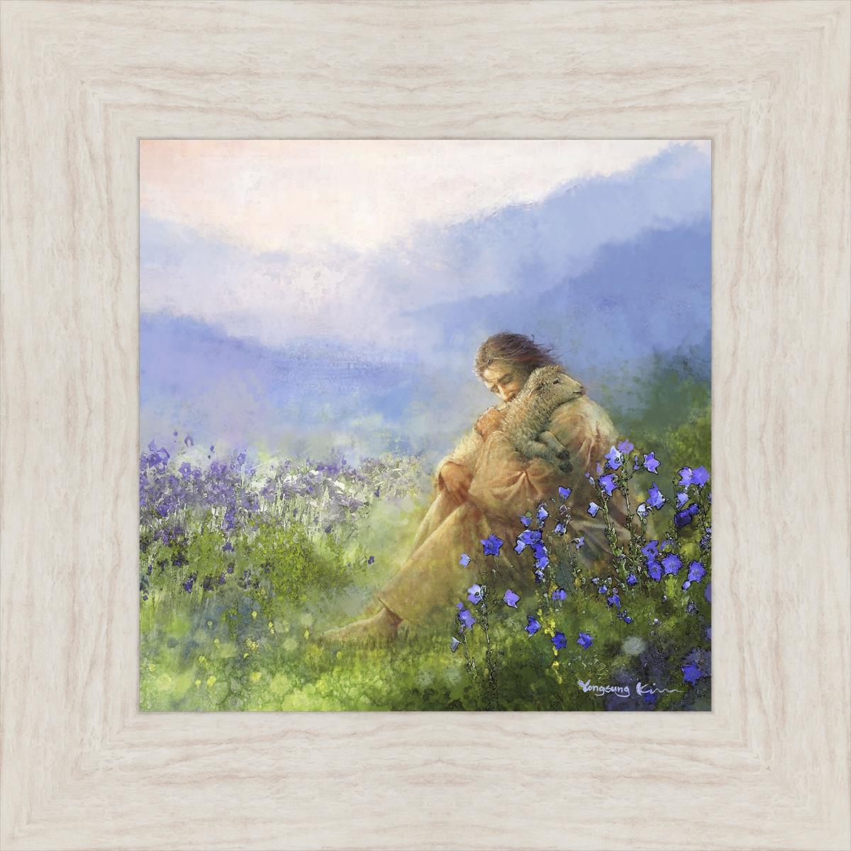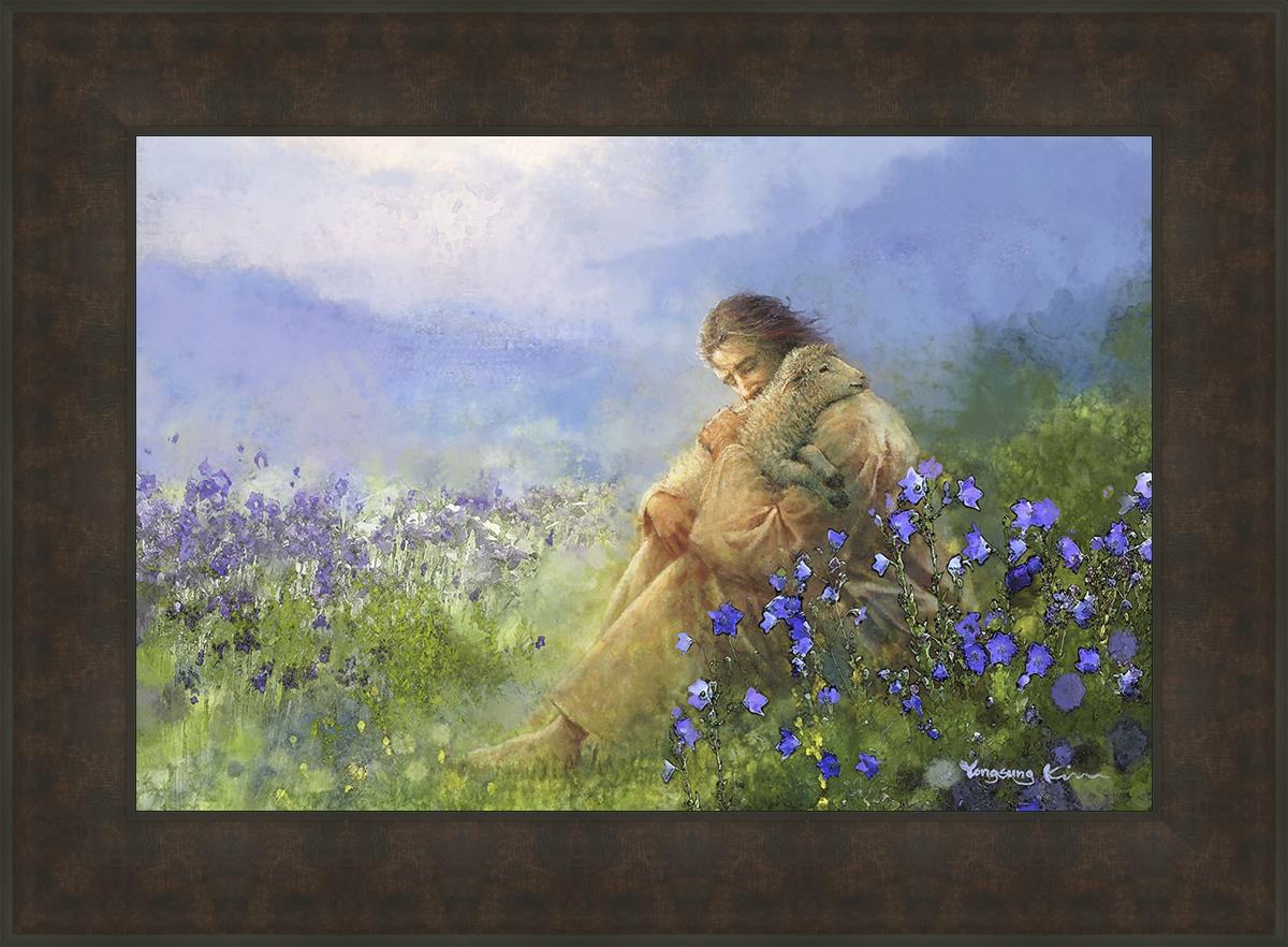 This painting portrays Jesus Christ seated in a field, gently cradling a lamb in His arms. Surrounded by vibrant purple flowers, the scene radiates tranquility and divine care. The lamb, a symbol of innocence and purity, nestles comfortably in Jesus' embrace, embodying His role as the Good Shepherd who offers comfort and protection. Through this tender moment, the painting beautifully captures Jesus as the Good Shepherd, offering solace and reassurance to all who seek Him.