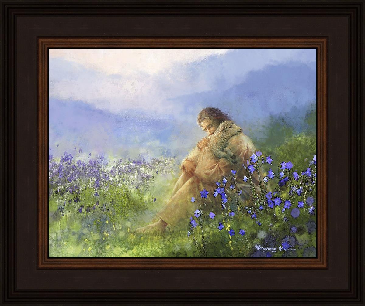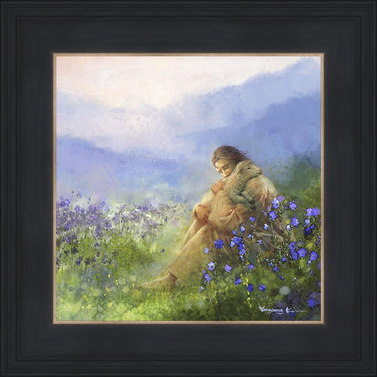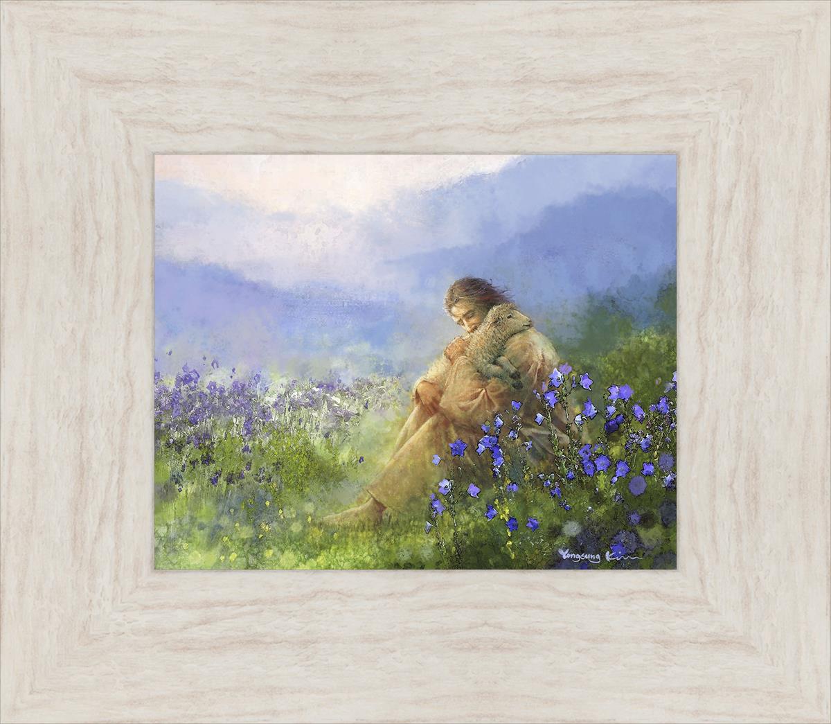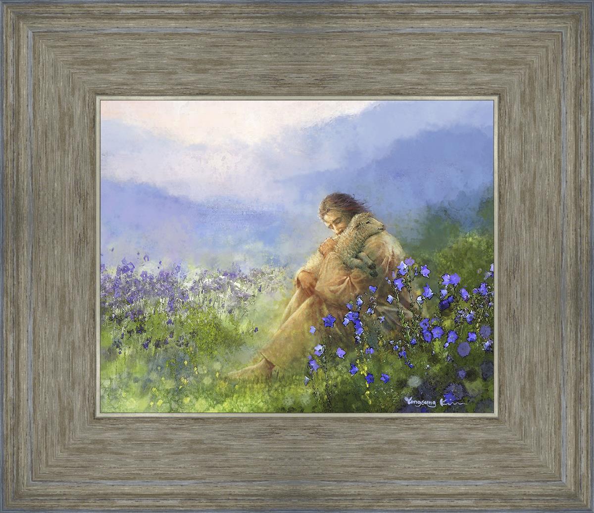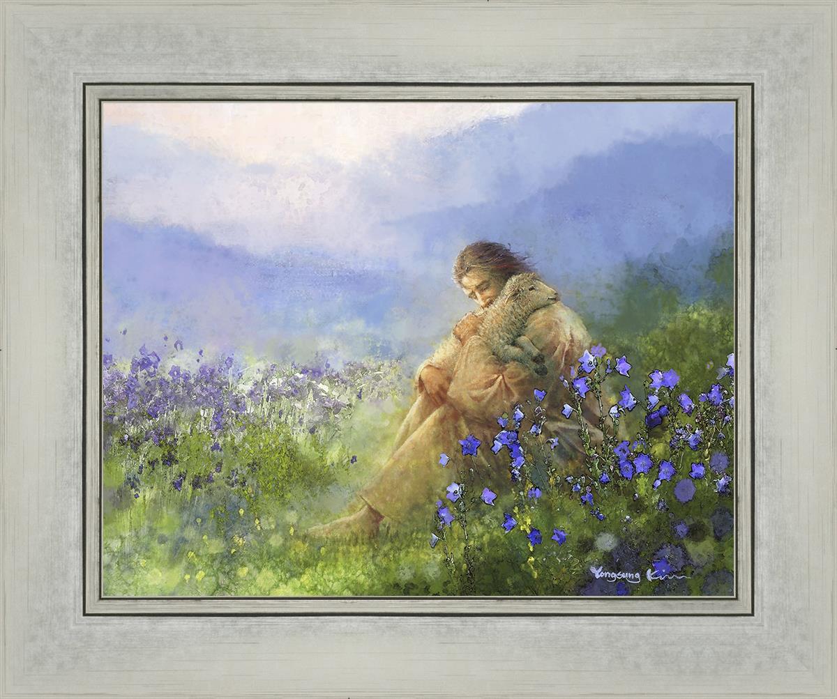 This painting portrays Jesus Christ seated in a field, gently cradling a lamb in His arms. Surrounded by vibrant purple flowers, the scene radiates tranquility and divine care. The lamb, a symbol of innocence and purity, nestles comfortably in Jesus' embrace, embodying His role as the Good Shepherd who offers comfort and protection. Through this tender moment, the painting beautifully captures Jesus as the Good Shepherd, offering solace and reassurance to all who seek Him.