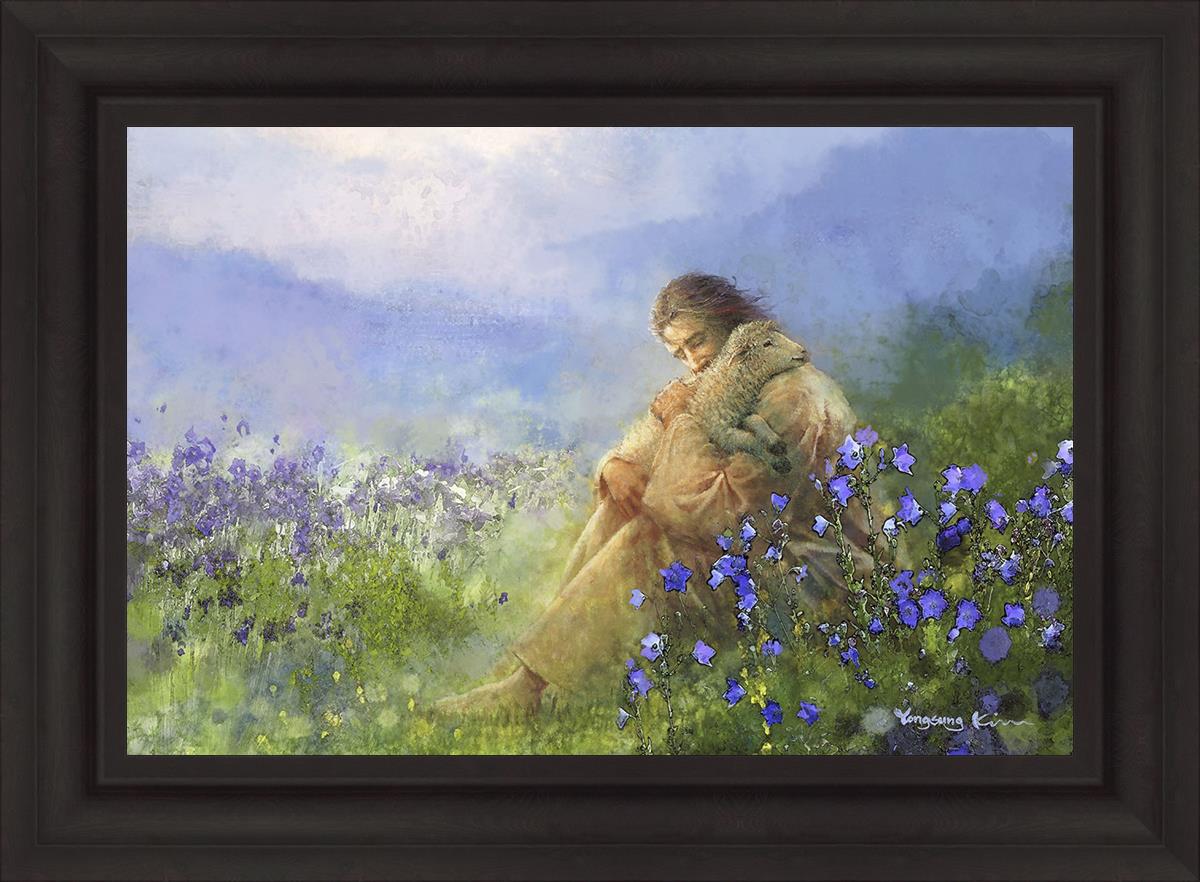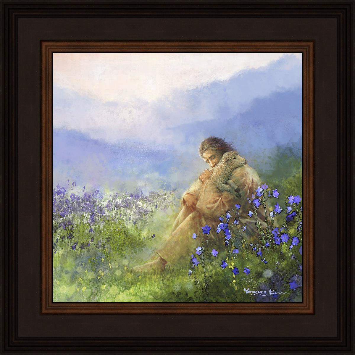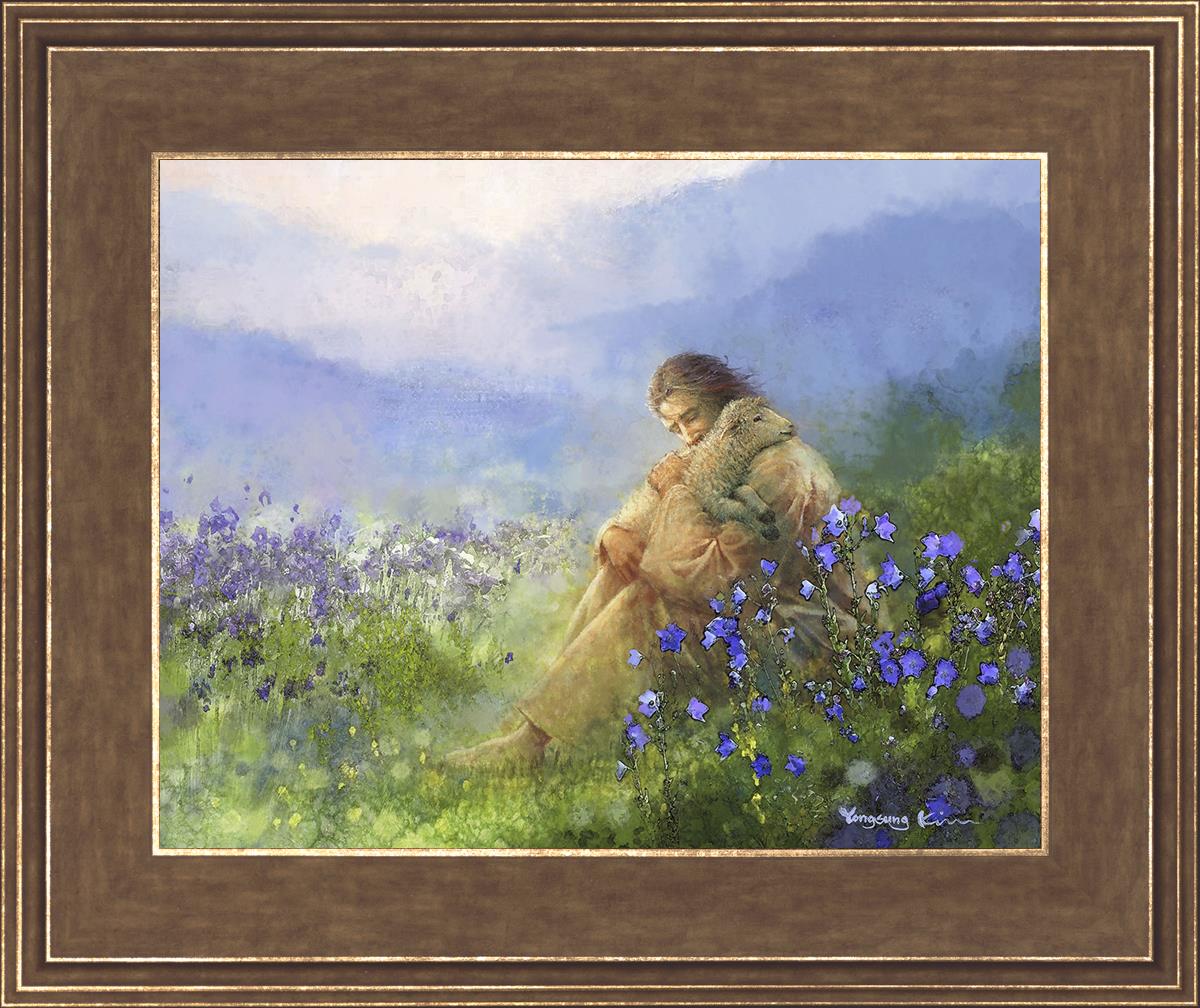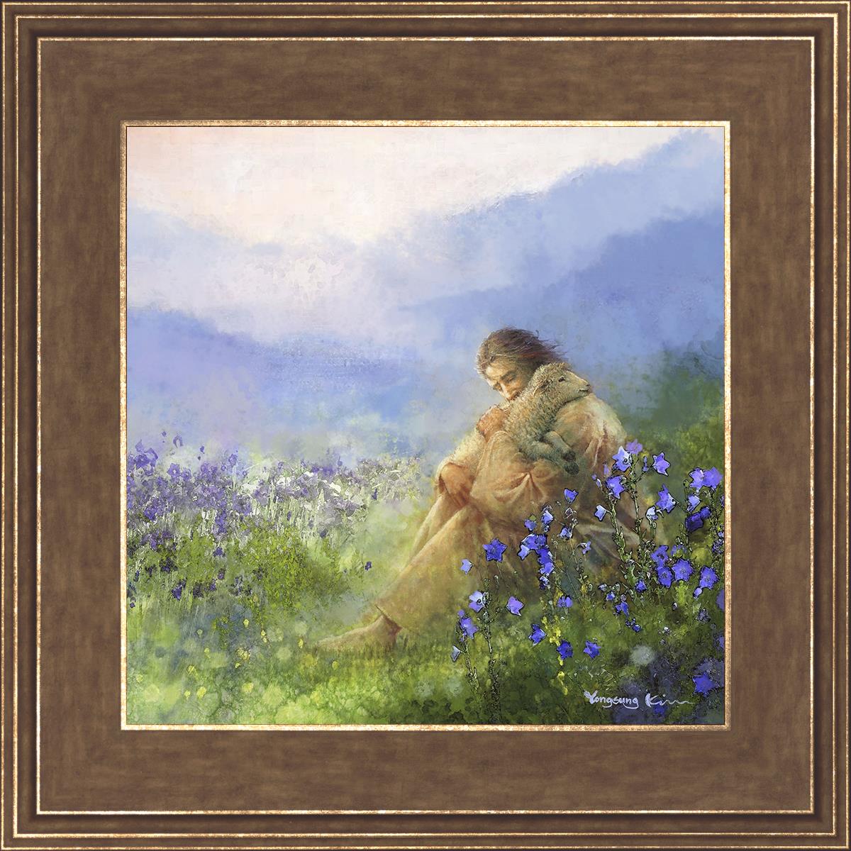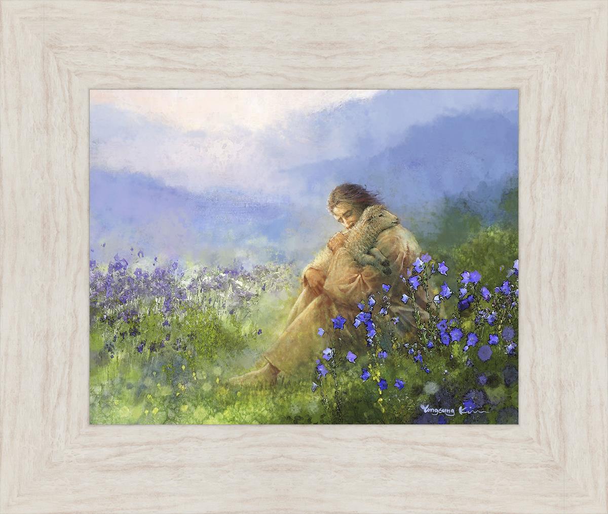 This painting portrays Jesus Christ seated in a field, gently cradling a lamb in His arms. Surrounded by vibrant purple flowers, the scene radiates tranquility and divine care. The lamb, a symbol of innocence and purity, nestles comfortably in Jesus' embrace, embodying His role as the Good Shepherd who offers comfort and protection. Through this tender moment, the painting beautifully captures Jesus as the Good Shepherd, offering solace and reassurance to all who seek Him.