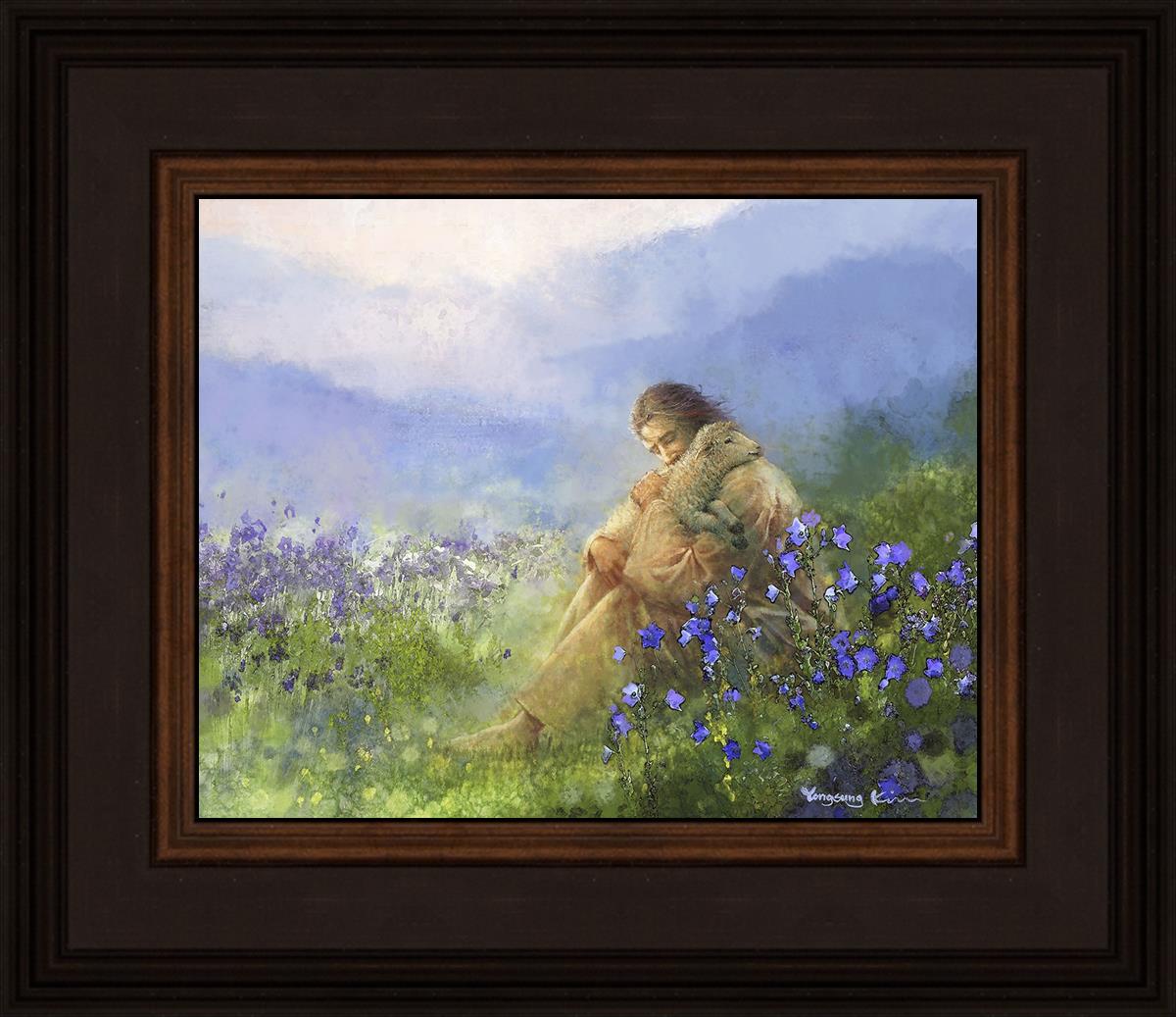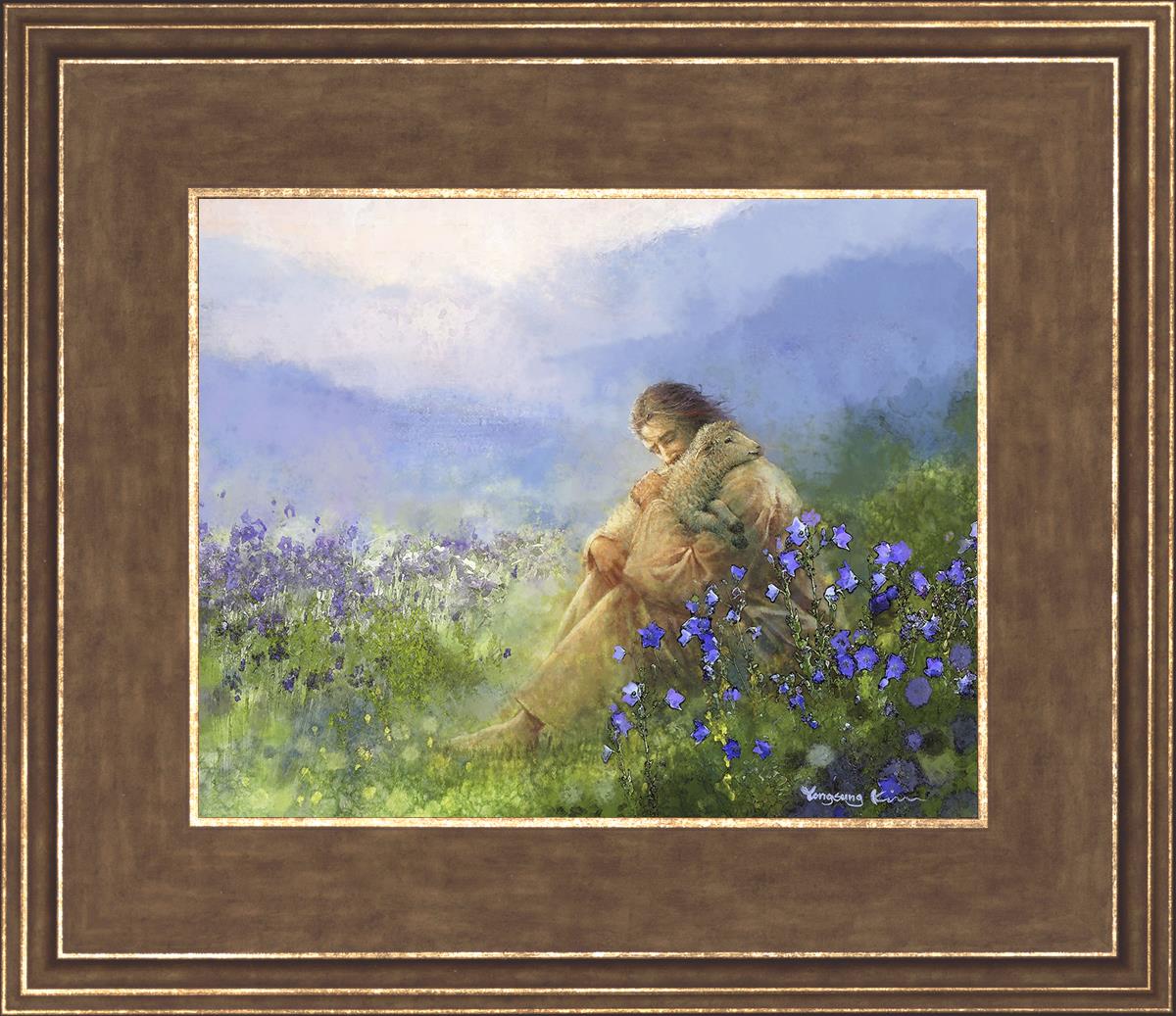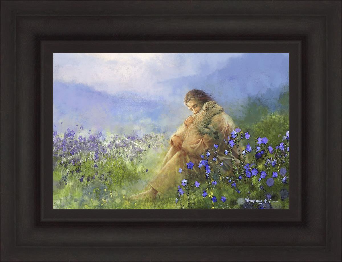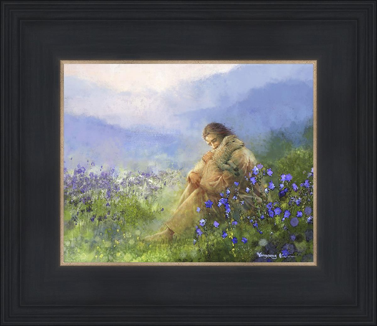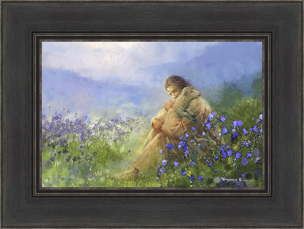 This painting portrays Jesus Christ seated in a field, gently cradling a lamb in His arms. Surrounded by vibrant purple flowers, the scene radiates tranquility and divine care. The lamb, a symbol of innocence and purity, nestles comfortably in Jesus' embrace, embodying His role as the Good Shepherd who offers comfort and protection. Through this tender moment, the painting beautifully captures Jesus as the Good Shepherd, offering solace and reassurance to all who seek Him.