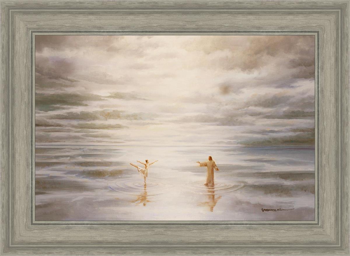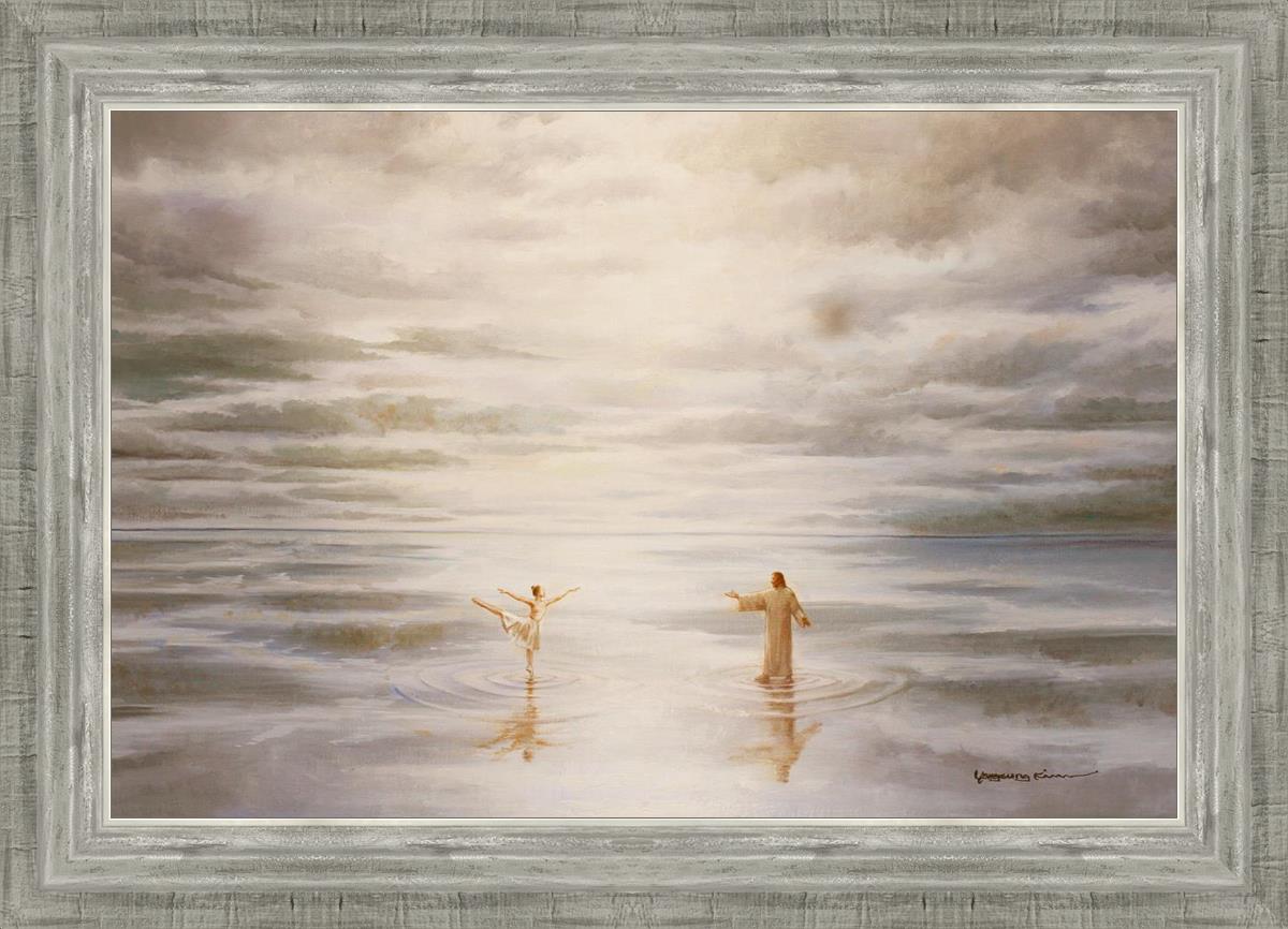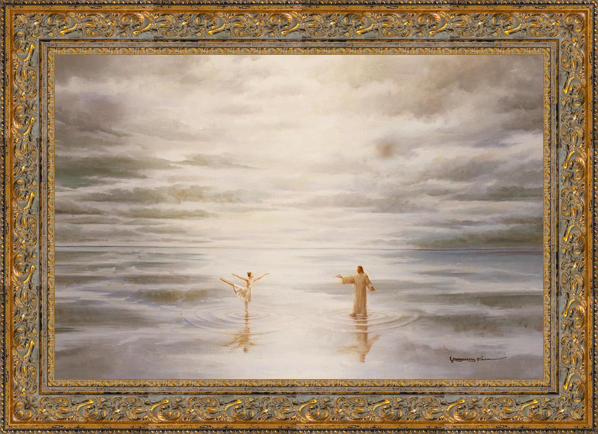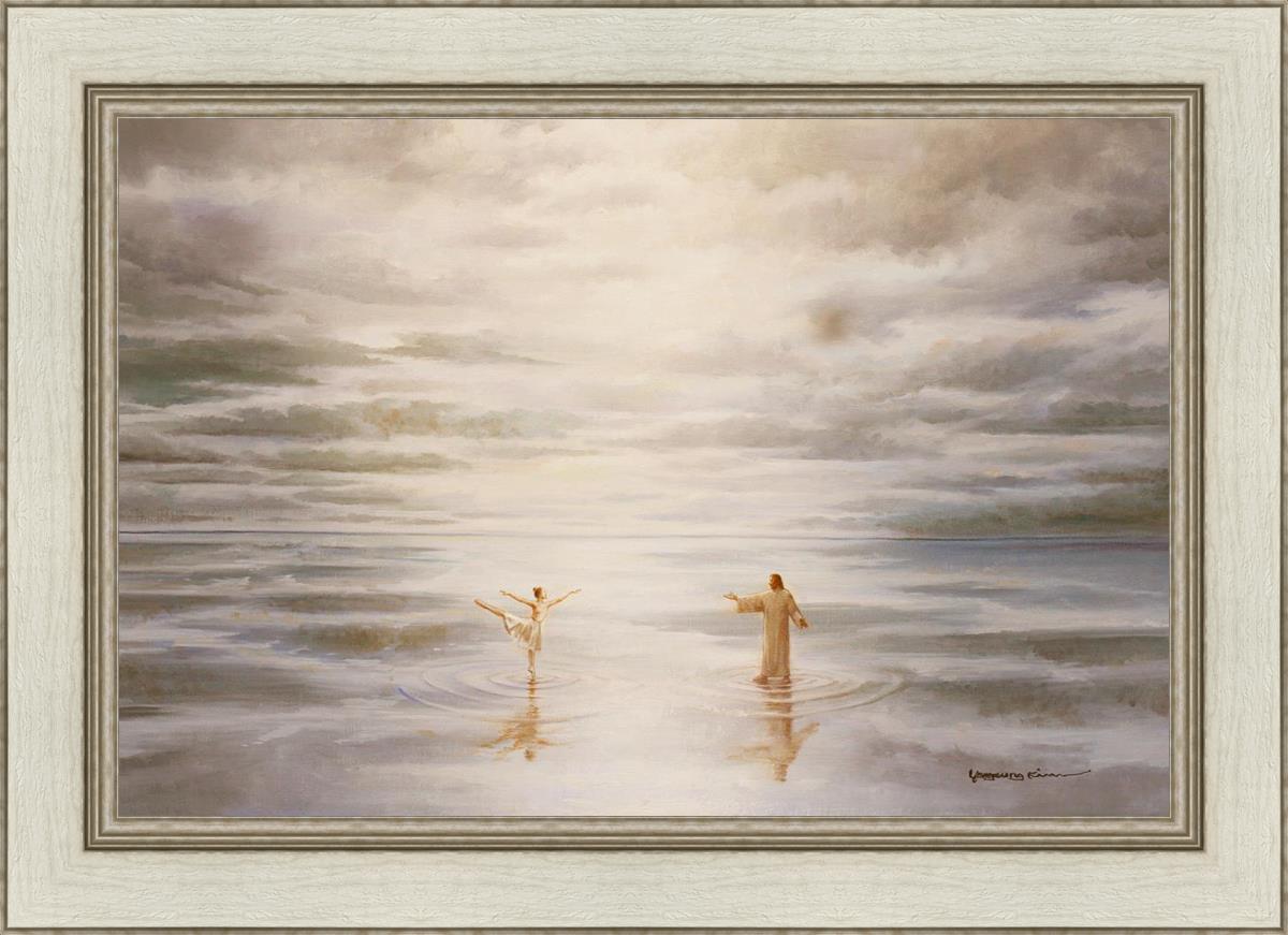 This painting features Jesus Christ and a young ballerina, depicted dancing on the surface of a peaceful body of water. Above them, the sky is a soft, muted grey, with still clouds casting a peaceful light over the figures below. This subtle, quiet backdrop enhances the sense of stillness and spiritual serenity, focusing attention on the intimate moment shared between the two figures. The painting's ethereal, dreamlike nature invites the viewer to not only appreciate the beauty of the moment but also to reflect on the deeper themes of faith, grace, and the joy of divine connection.