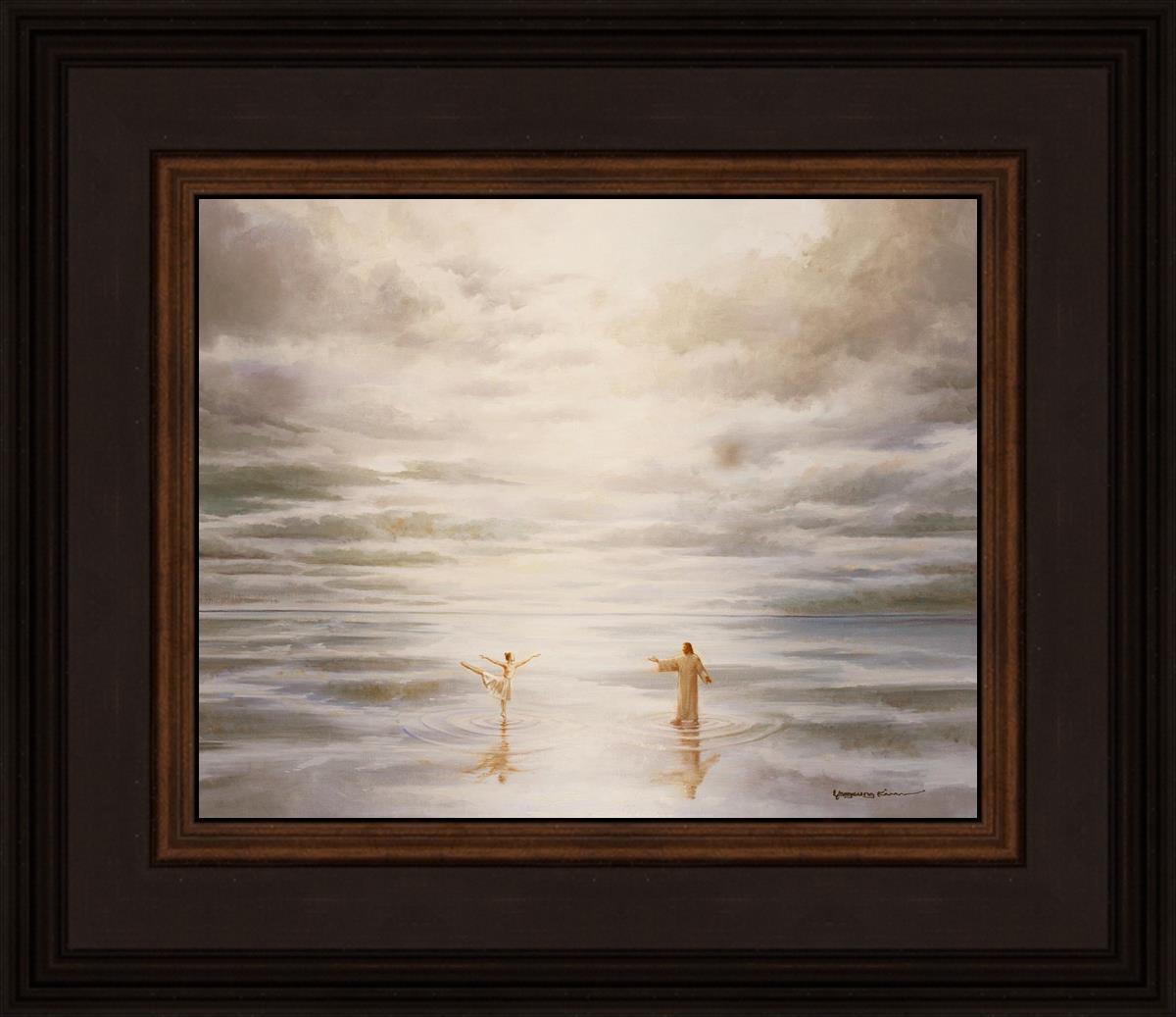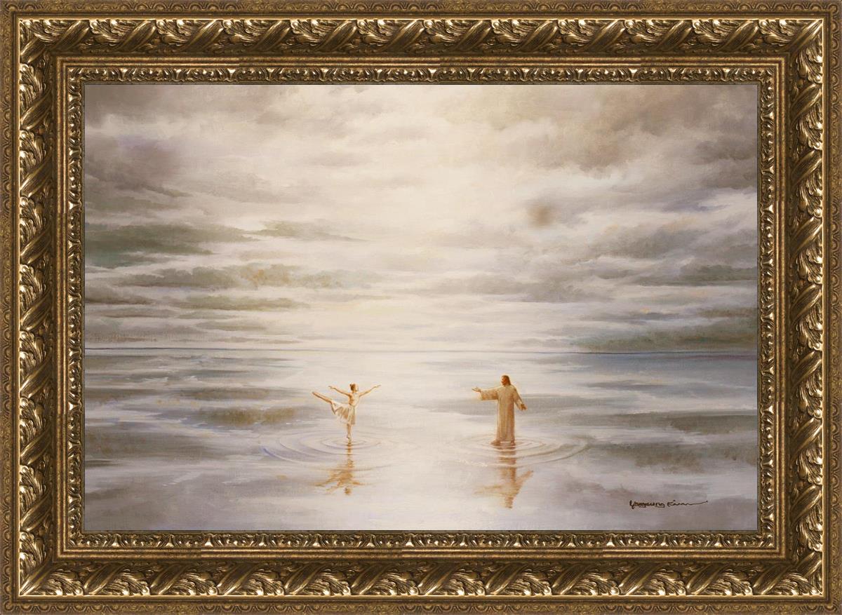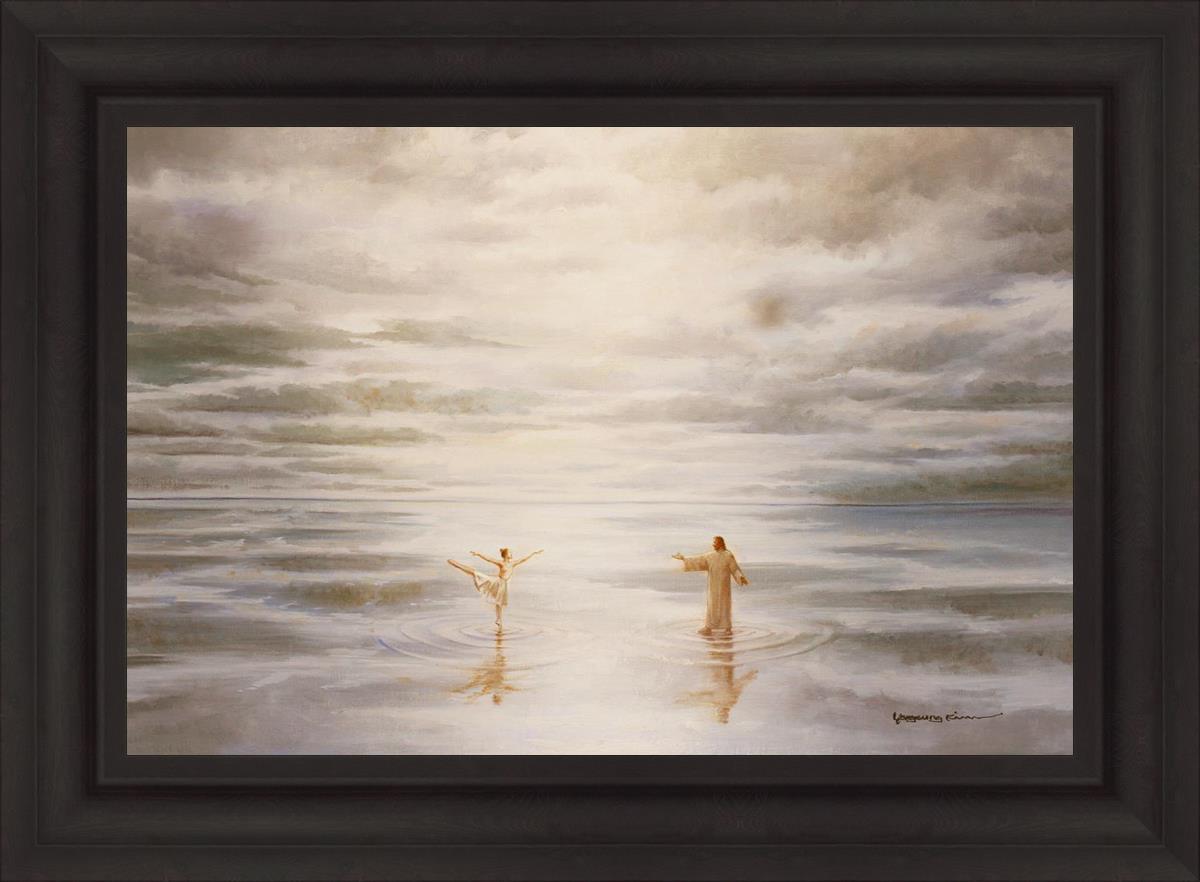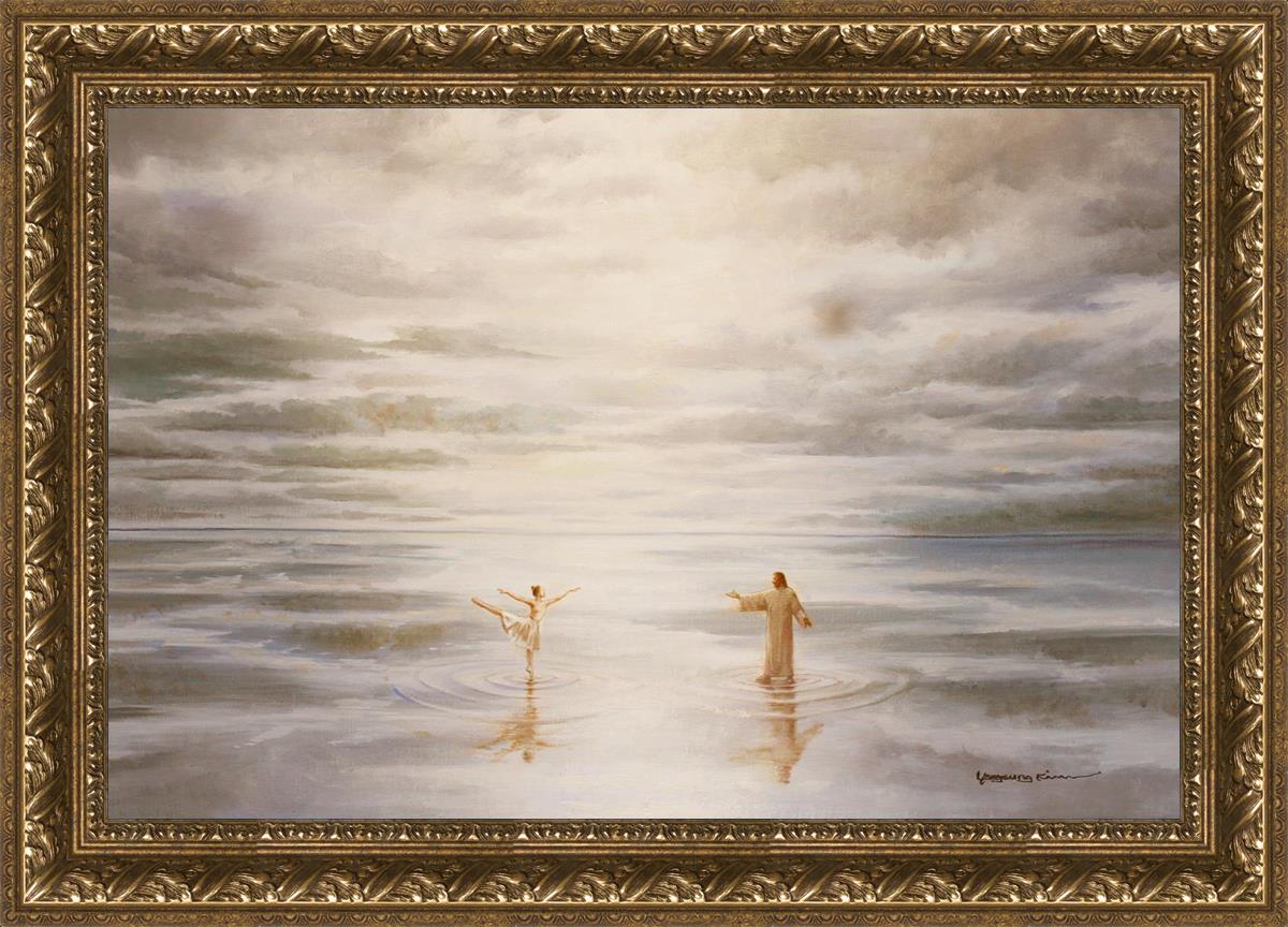 This painting features Jesus Christ and a young ballerina, depicted dancing on the surface of a peaceful body of water. Above them, the sky is a soft, muted grey, with still clouds casting a peaceful light over the figures below. This subtle, quiet backdrop enhances the sense of stillness and spiritual serenity, focusing attention on the intimate moment shared between the two figures. The painting's ethereal, dreamlike nature invites the viewer to not only appreciate the beauty of the moment but also to reflect on the deeper themes of faith, grace, and the joy of divine connection.
