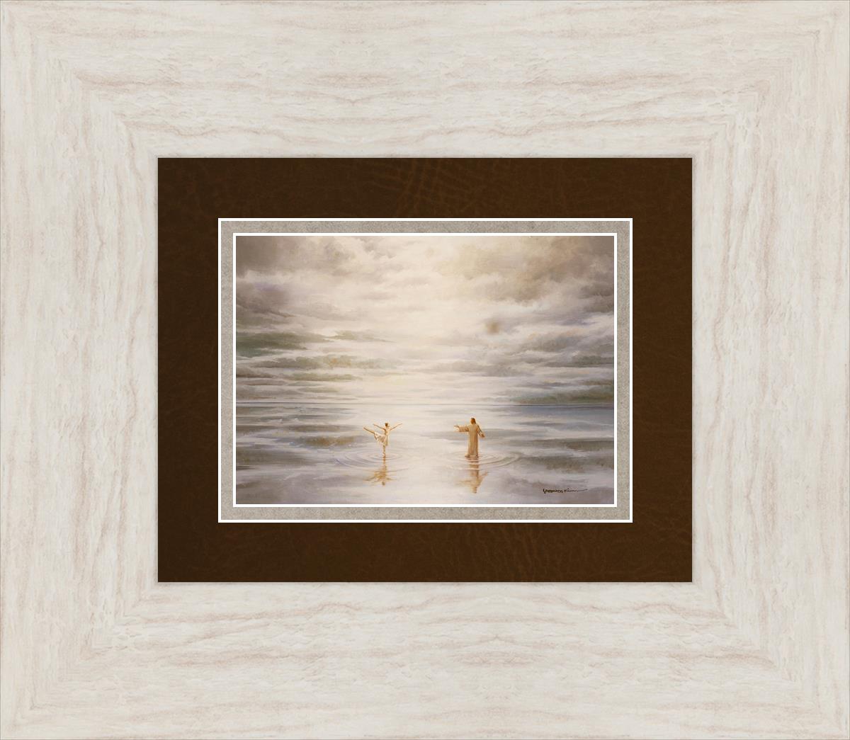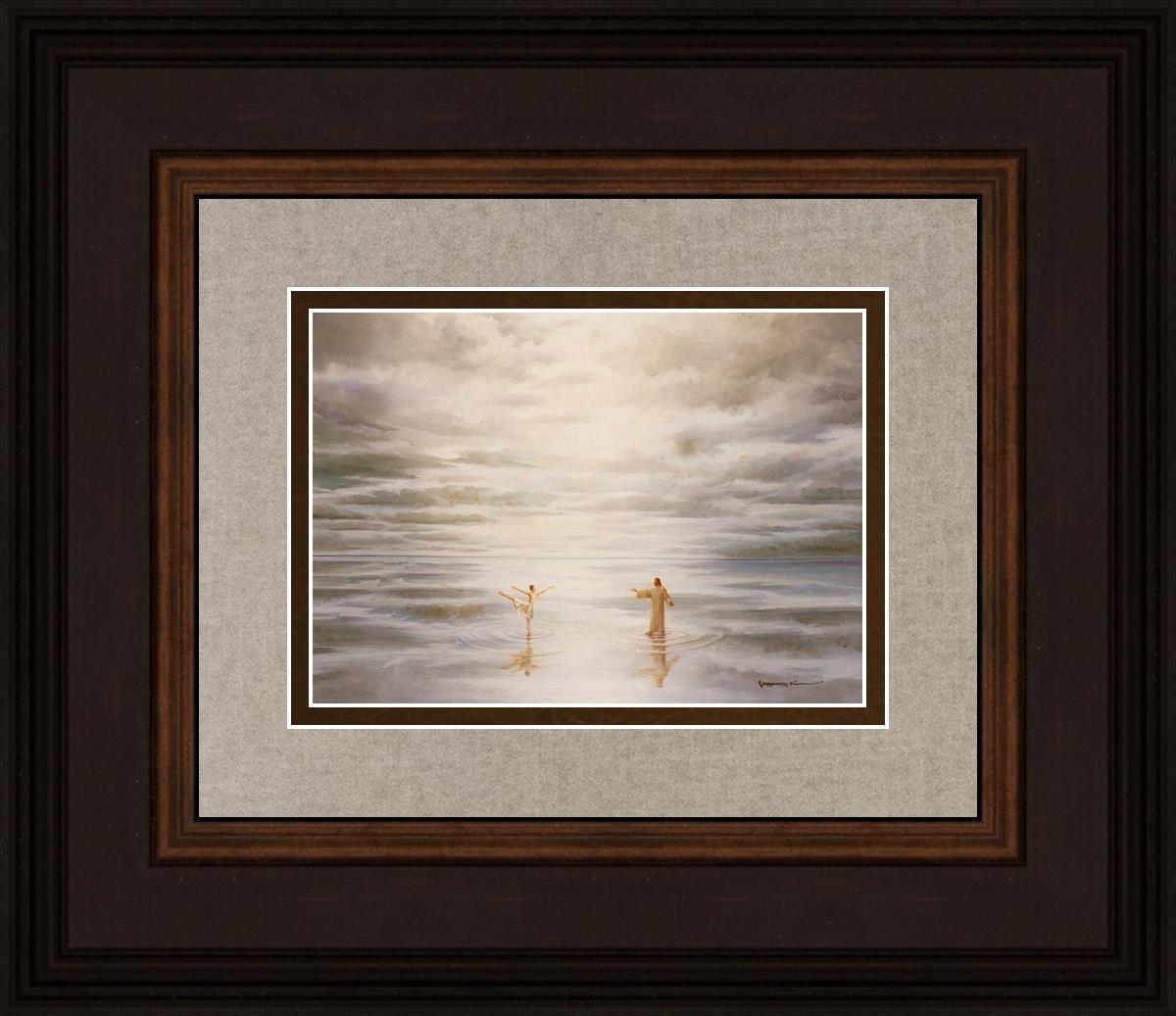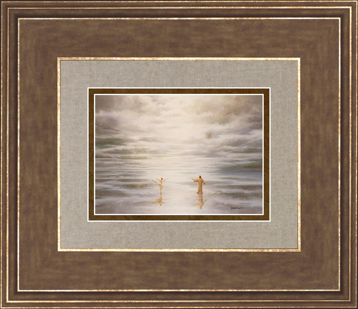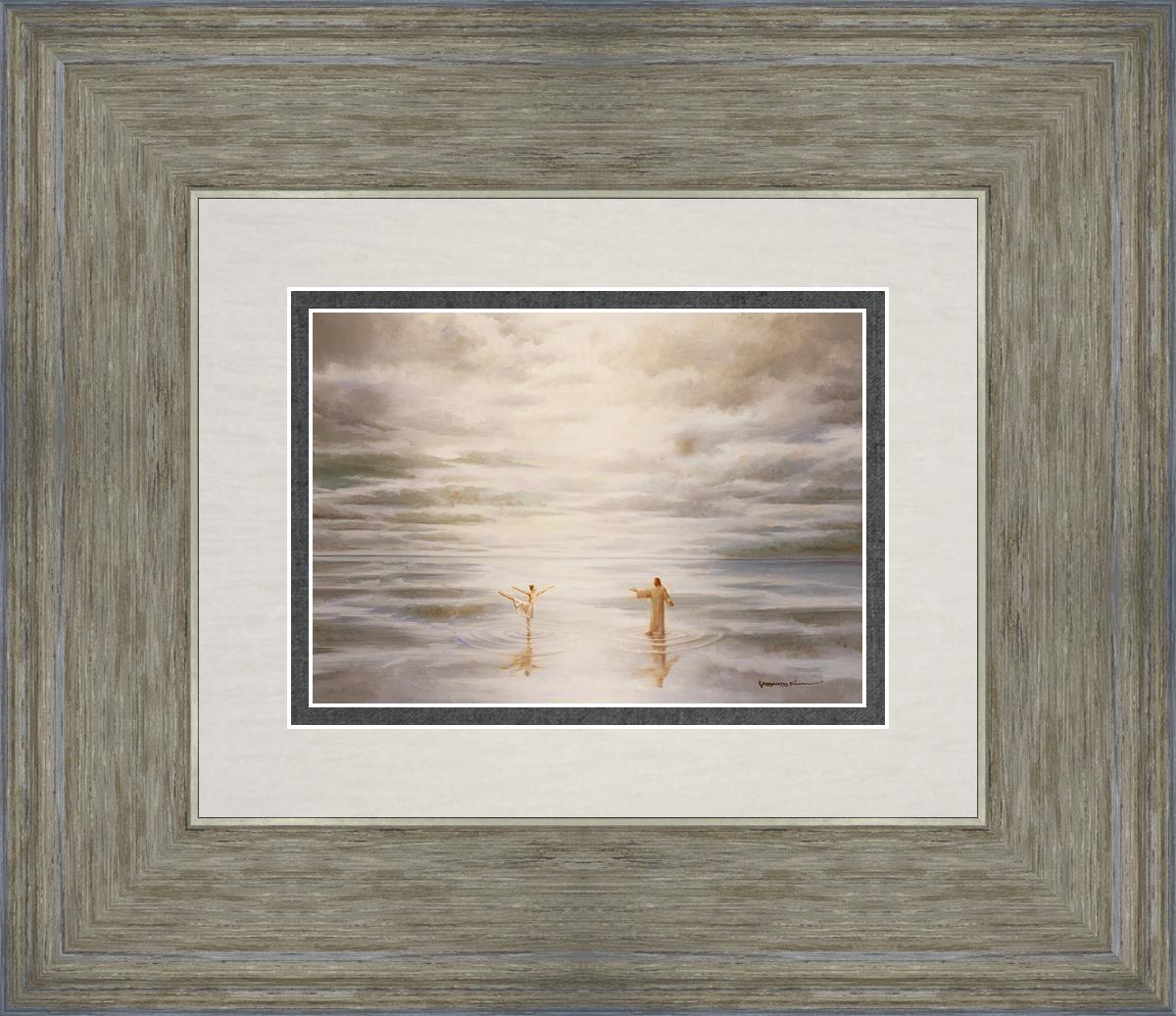 This painting features Jesus Christ and a young ballerina, depicted dancing on the surface of a peaceful body of water. Above them, the sky is a soft, muted grey, with still clouds casting a peaceful light over the figures below. This subtle, quiet backdrop enhances the sense of stillness and spiritual serenity, focusing attention on the intimate moment shared between the two figures. The painting's ethereal, dreamlike nature invites the viewer to not only appreciate the beauty of the moment but also to reflect on the deeper themes of faith, grace, and the joy of divine connection.