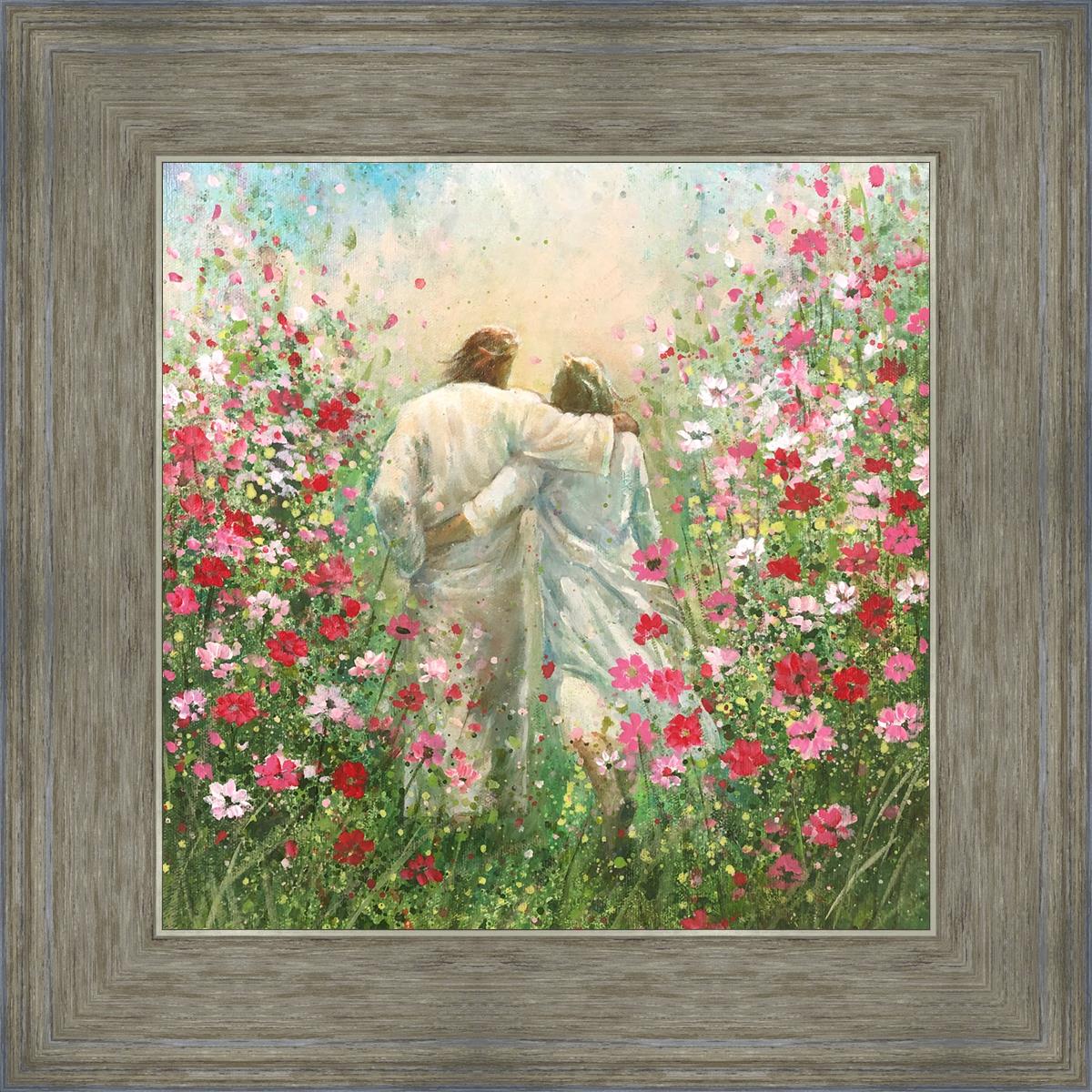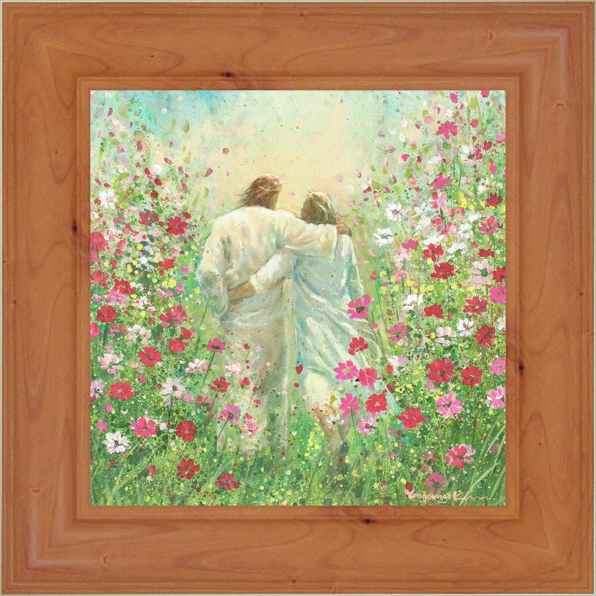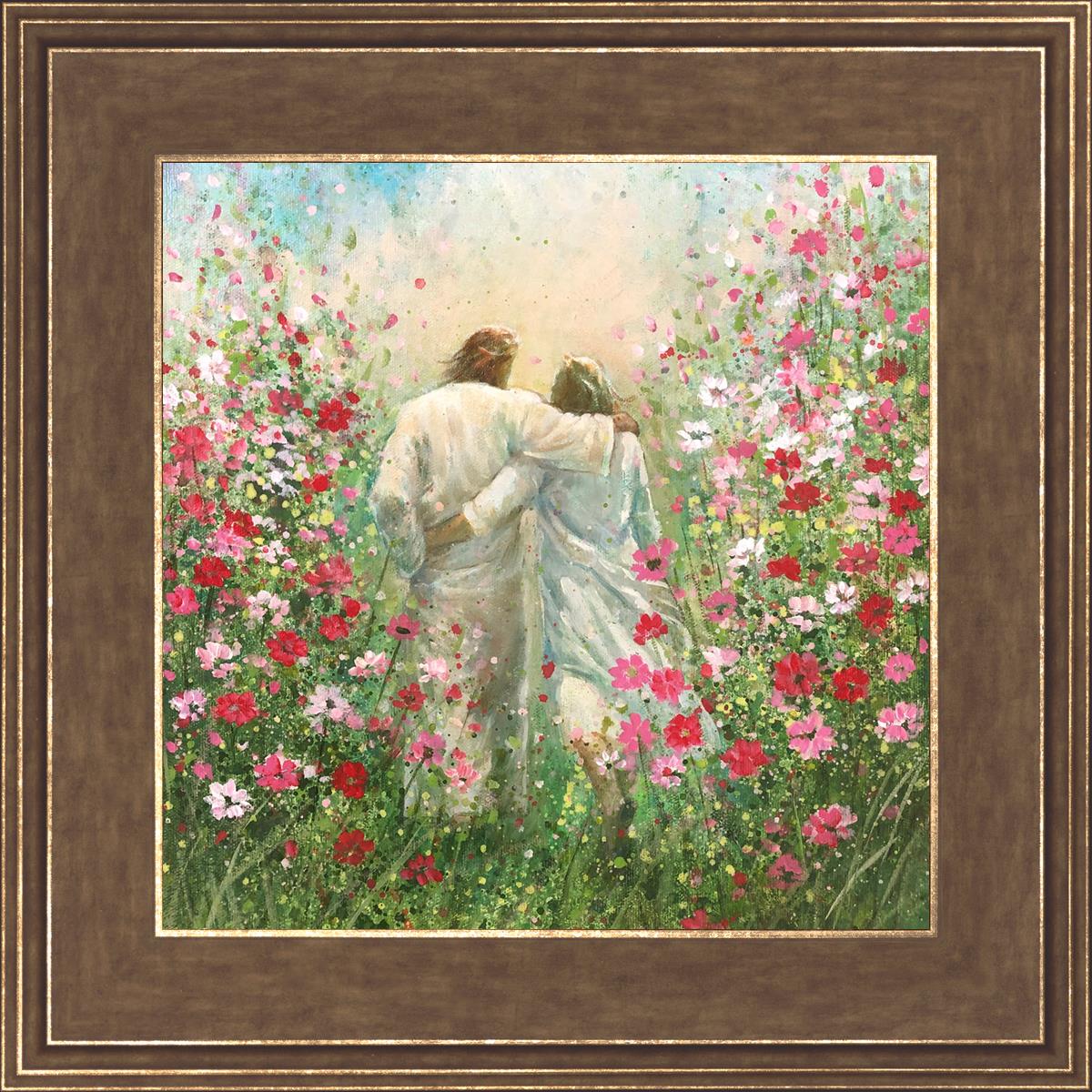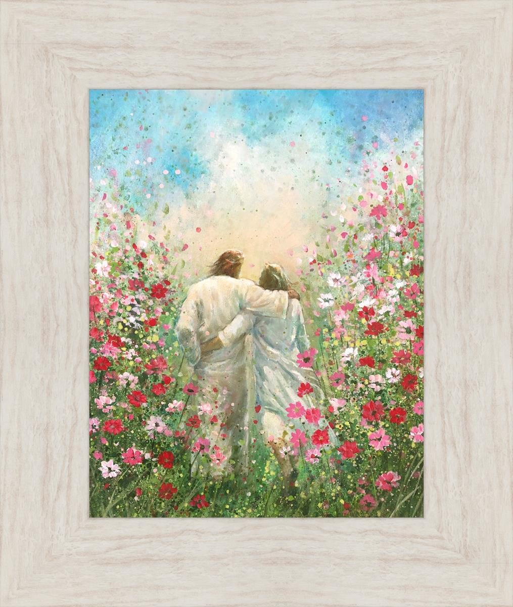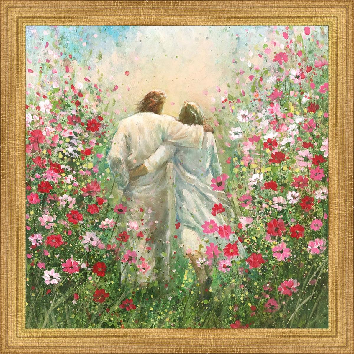 In this peaceful scene, Jesus Christ, depicted in His signature robes, walks arm in arm with a follower dressed in white garments. Together, they stroll through a vibrant field of bright flowers. Jesus appears to be offering wise counsel, His words conveying comfort and encouragement. The follower, listening intently, stands in a posture of quiet reverence, indicating their trust in His guidance. The surrounding landscape adds a sense of renewal and hope, symbolizing the spiritual growth and blossoming faith nurtured through divine companionship. Divine Companion invites the viewer to reflect on the beauty of a personal relationship with Christ, offering a message of faith, peace, and the transformative power of spiritual companionship.
