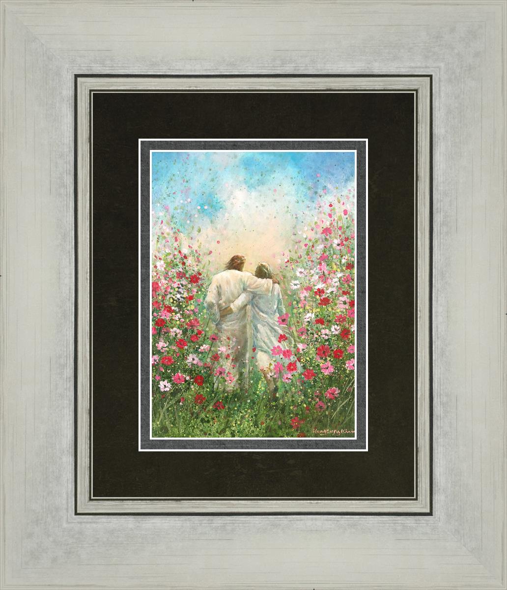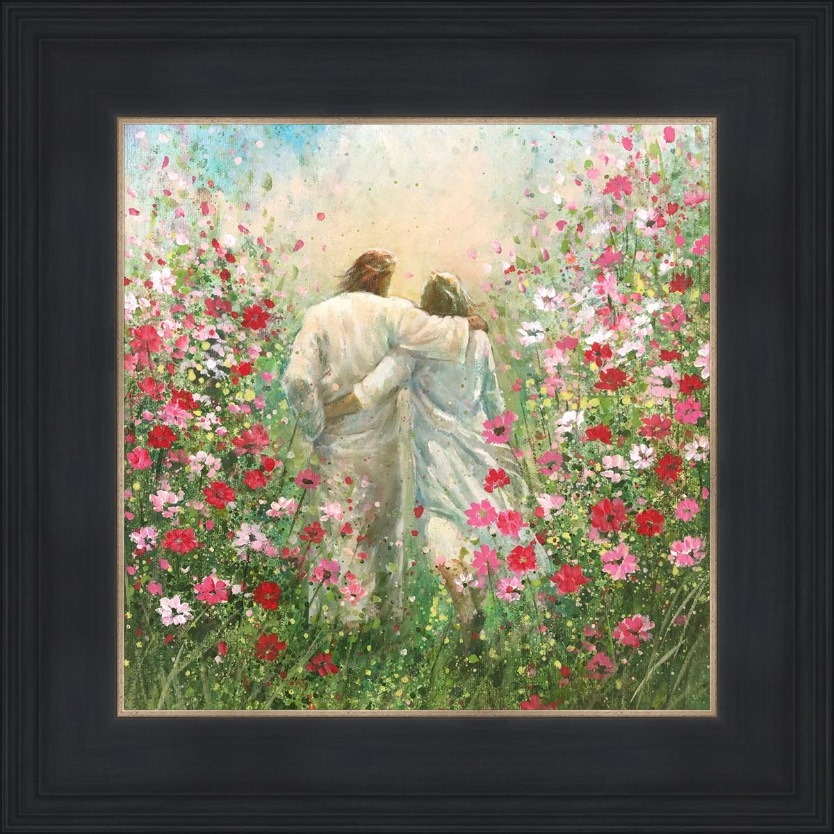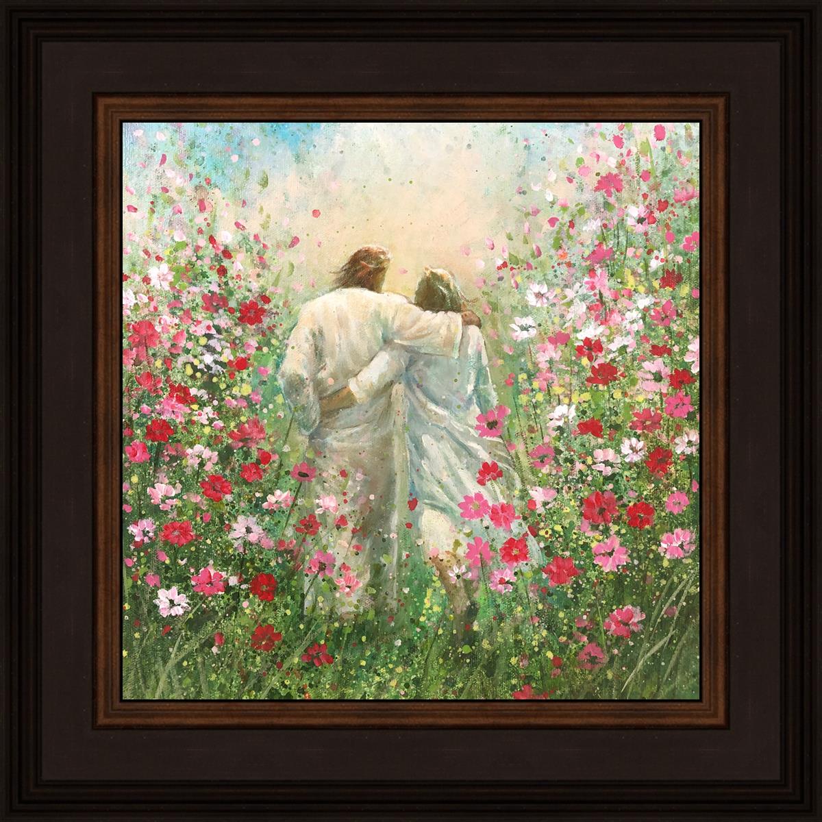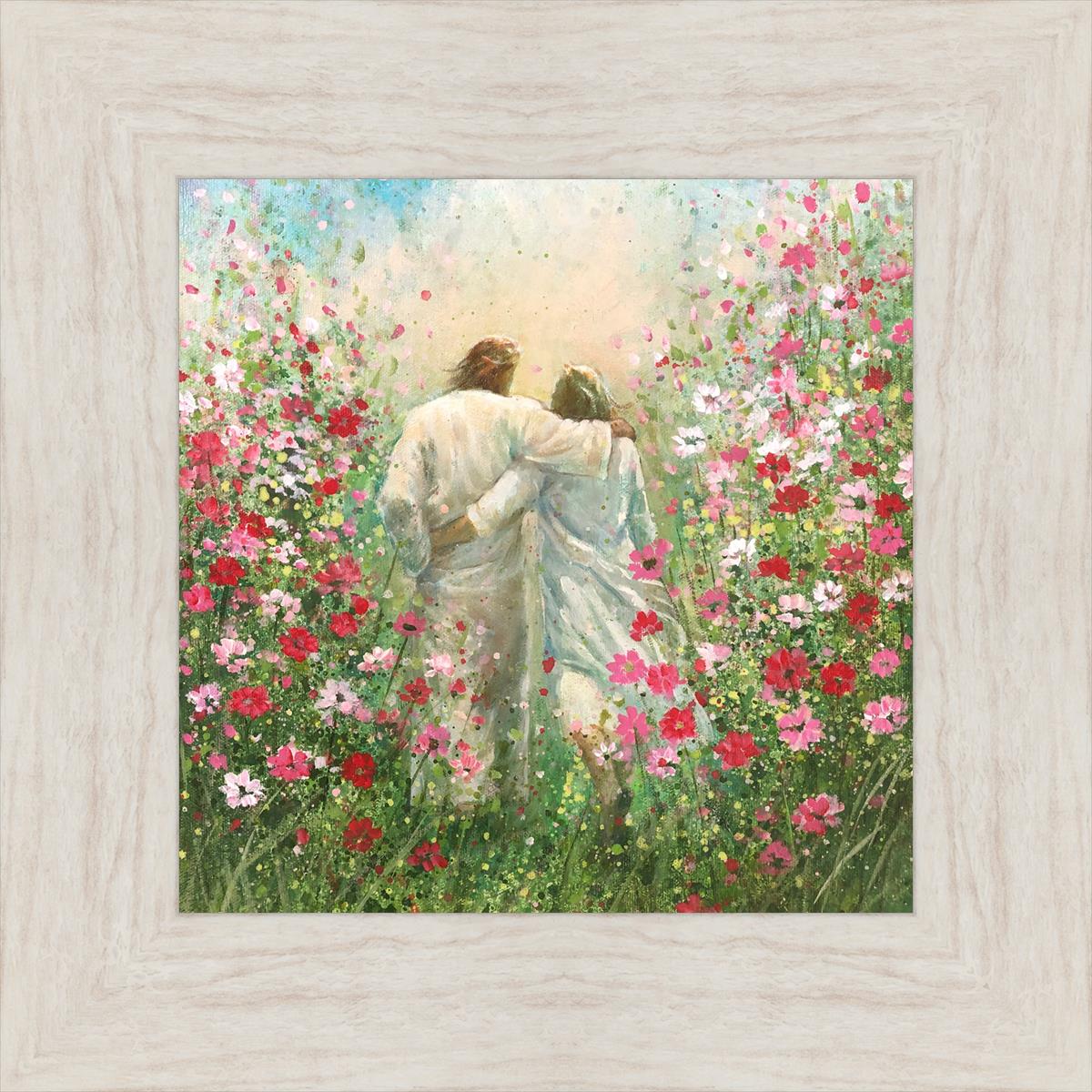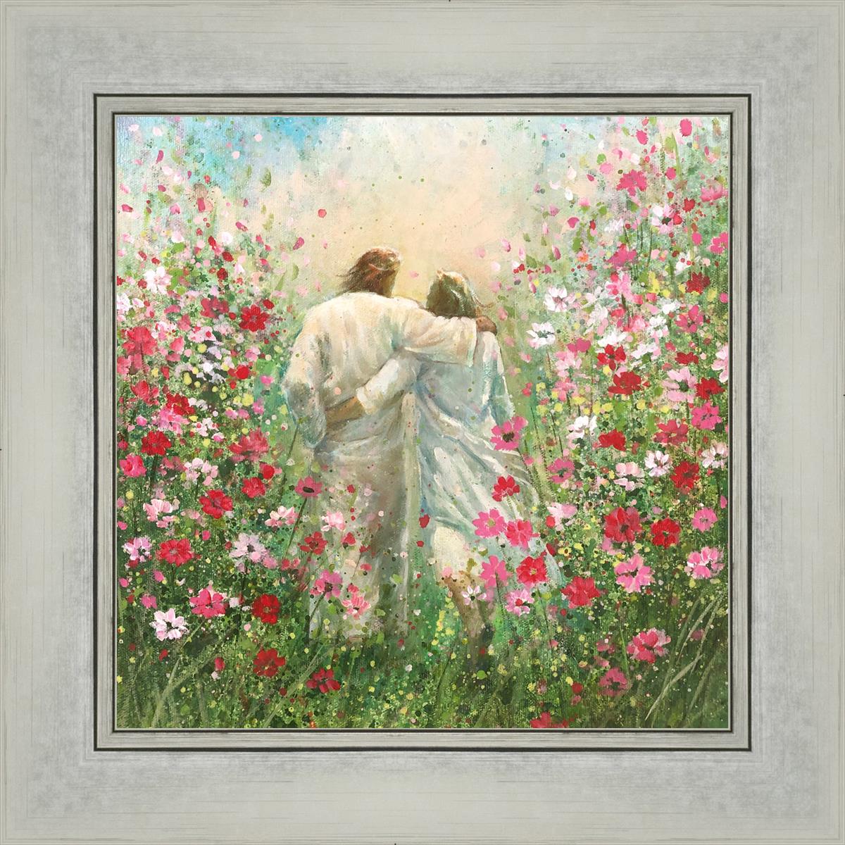 In this peaceful scene, Jesus Christ, depicted in His signature robes, walks arm in arm with a follower dressed in white garments. Together, they stroll through a vibrant field of bright flowers. Jesus appears to be offering wise counsel, His words conveying comfort and encouragement. The follower, listening intently, stands in a posture of quiet reverence, indicating their trust in His guidance. The surrounding landscape adds a sense of renewal and hope, symbolizing the spiritual growth and blossoming faith nurtured through divine companionship. Divine Companion invites the viewer to reflect on the beauty of a personal relationship with Christ, offering a message of faith, peace, and the transformative power of spiritual companionship.