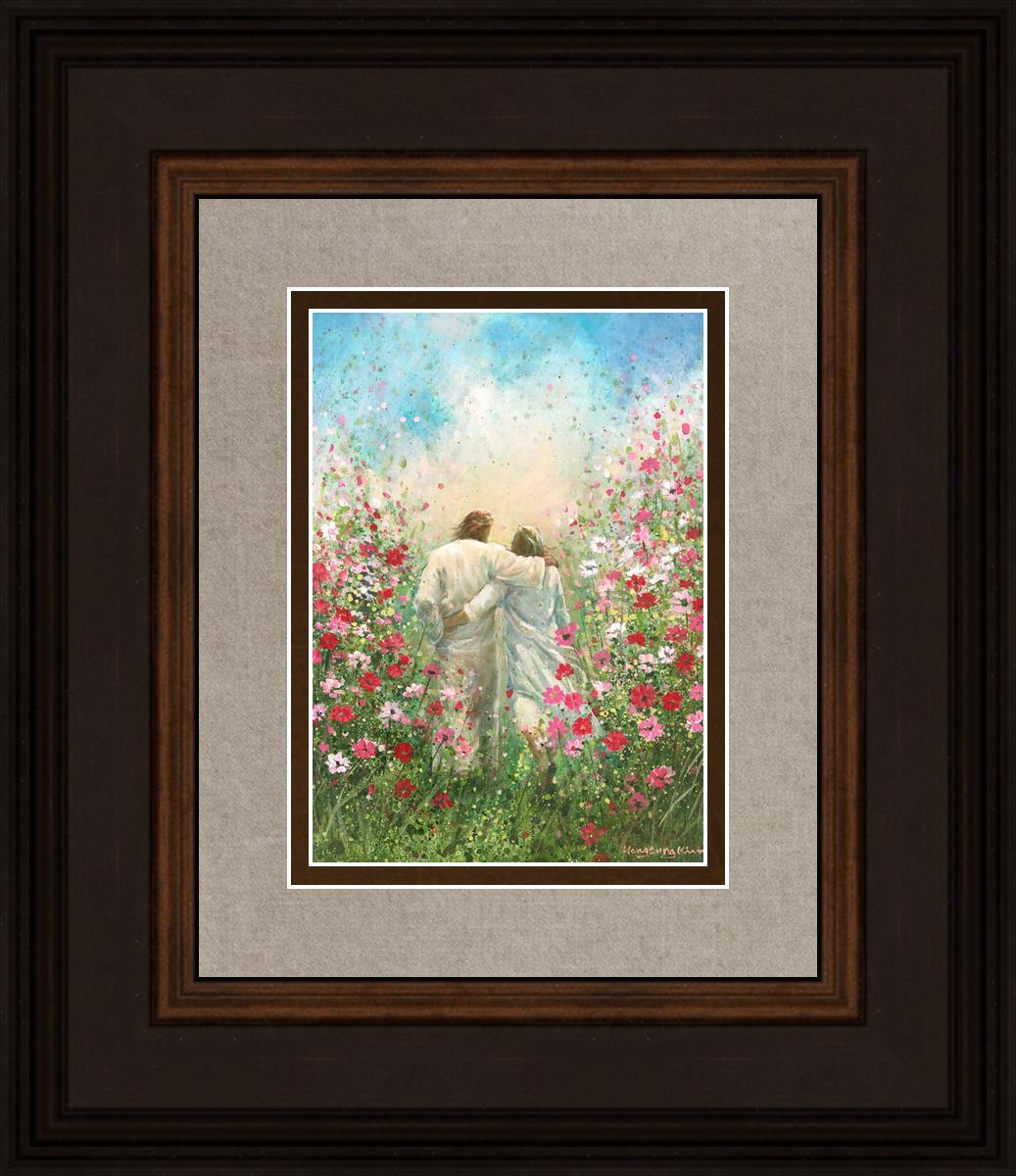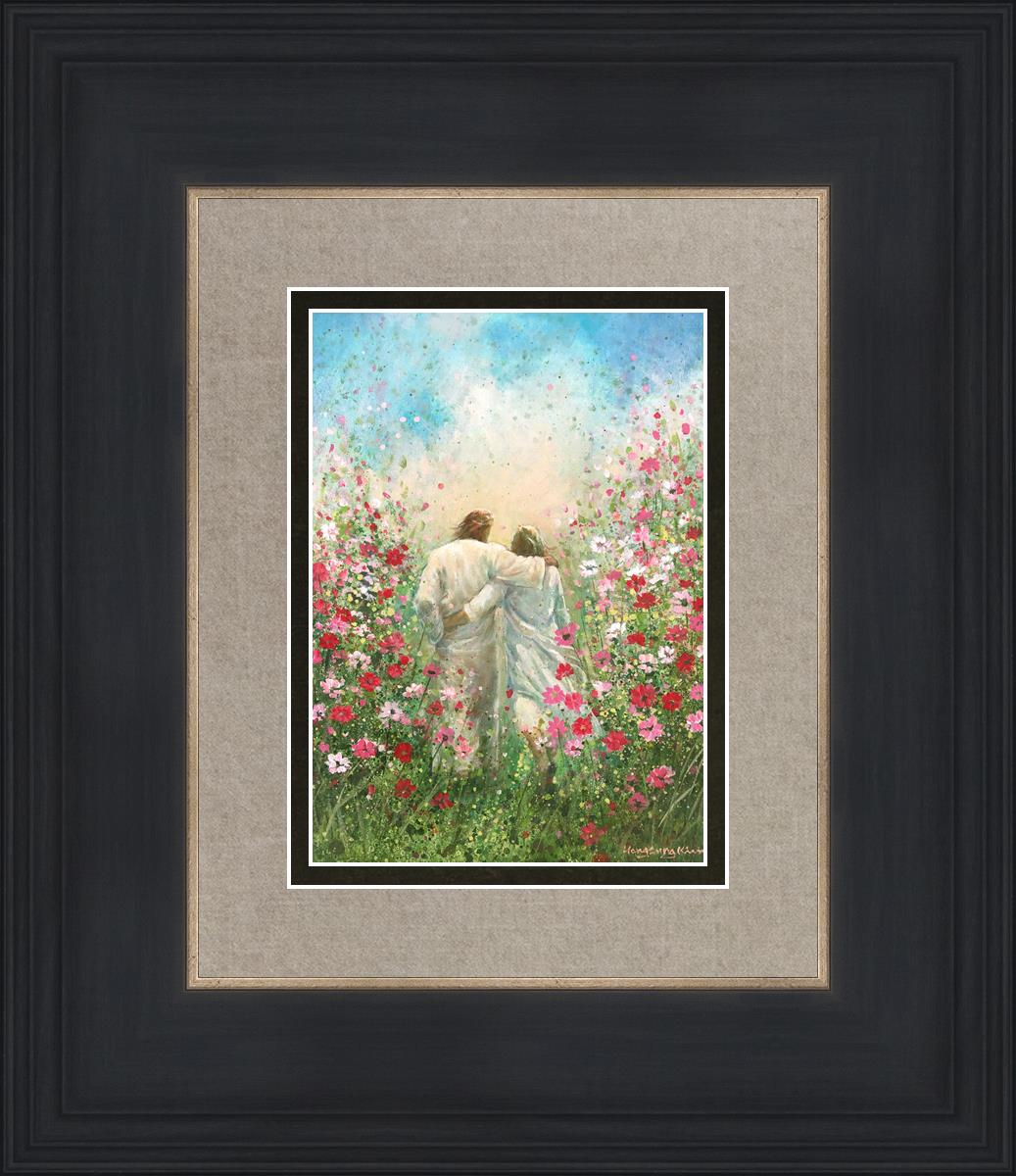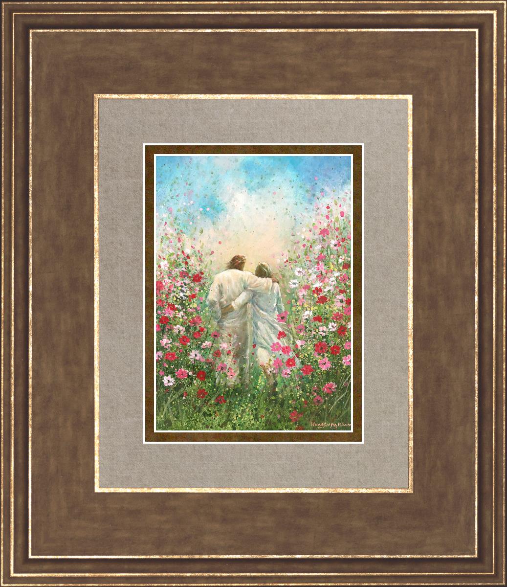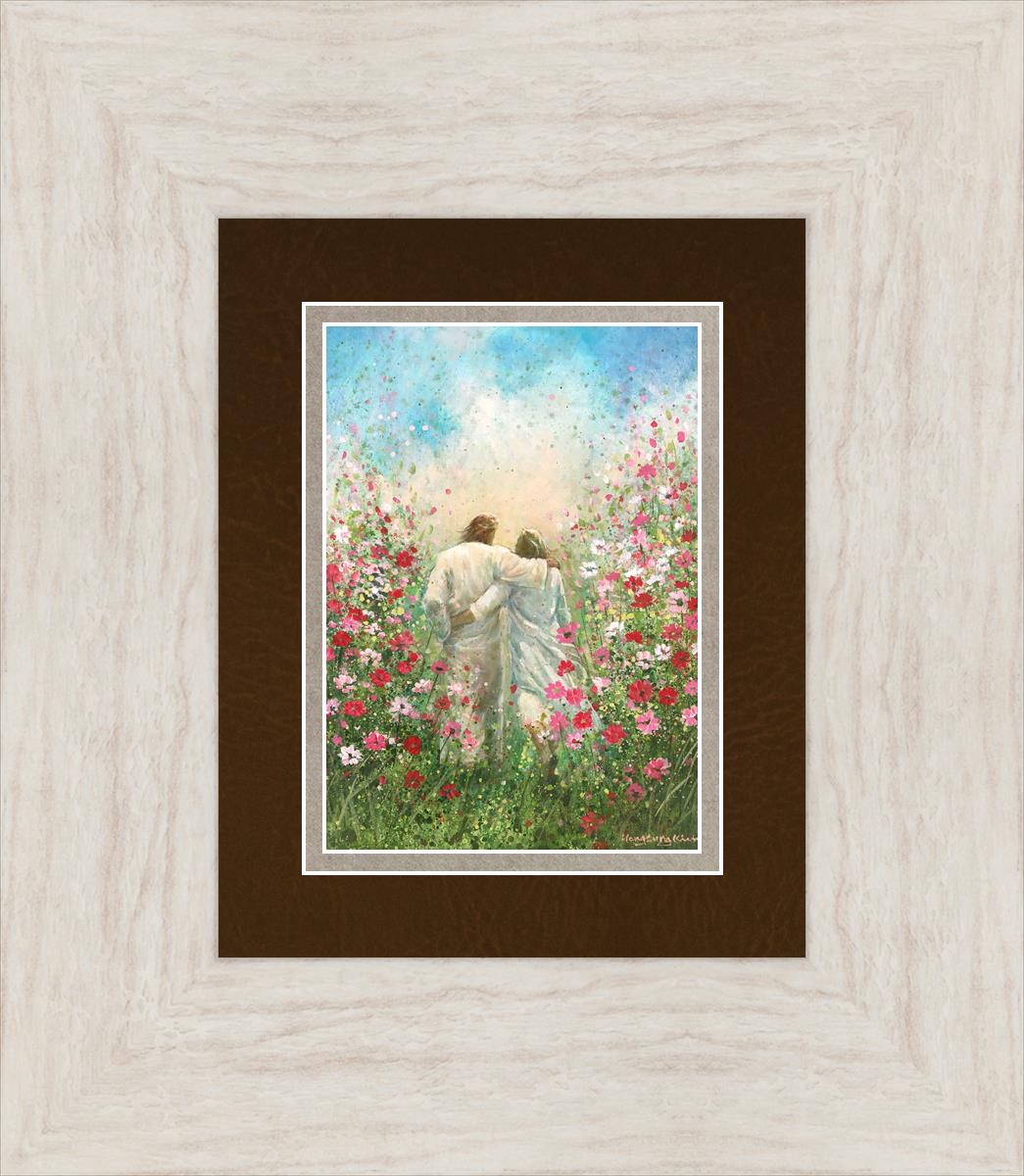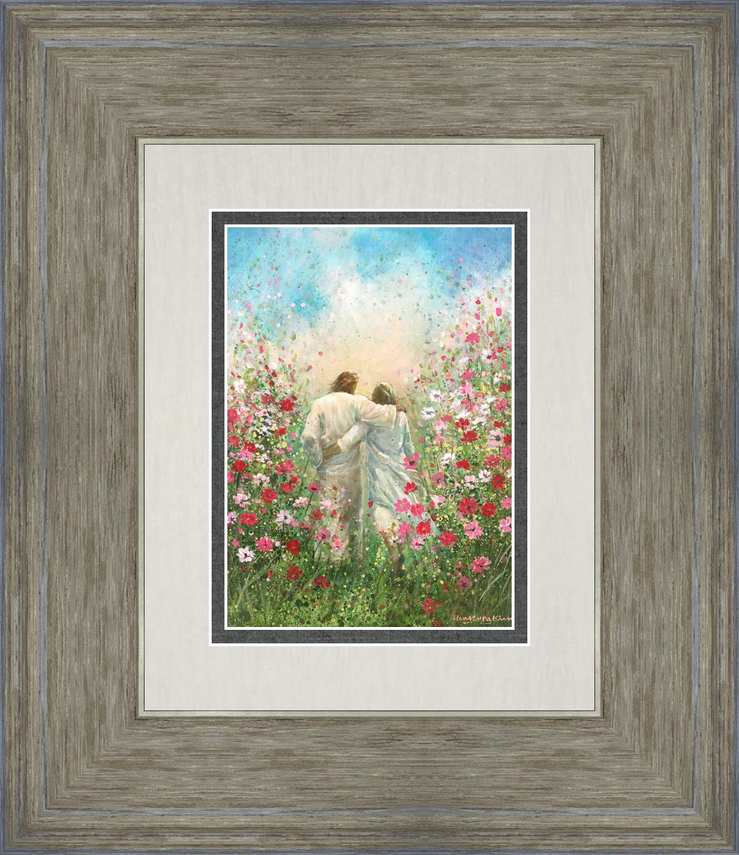 In this peaceful scene, Jesus Christ, depicted in His signature robes, walks arm in arm with a follower dressed in white garments. Together, they stroll through a vibrant field of bright flowers. Jesus appears to be offering wise counsel, His words conveying comfort and encouragement. The follower, listening intently, stands in a posture of quiet reverence, indicating their trust in His guidance. The surrounding landscape adds a sense of renewal and hope, symbolizing the spiritual growth and blossoming faith nurtured through divine companionship. Divine Companion invites the viewer to reflect on the beauty of a personal relationship with Christ, offering a message of faith, peace, and the transformative power of spiritual companionship.