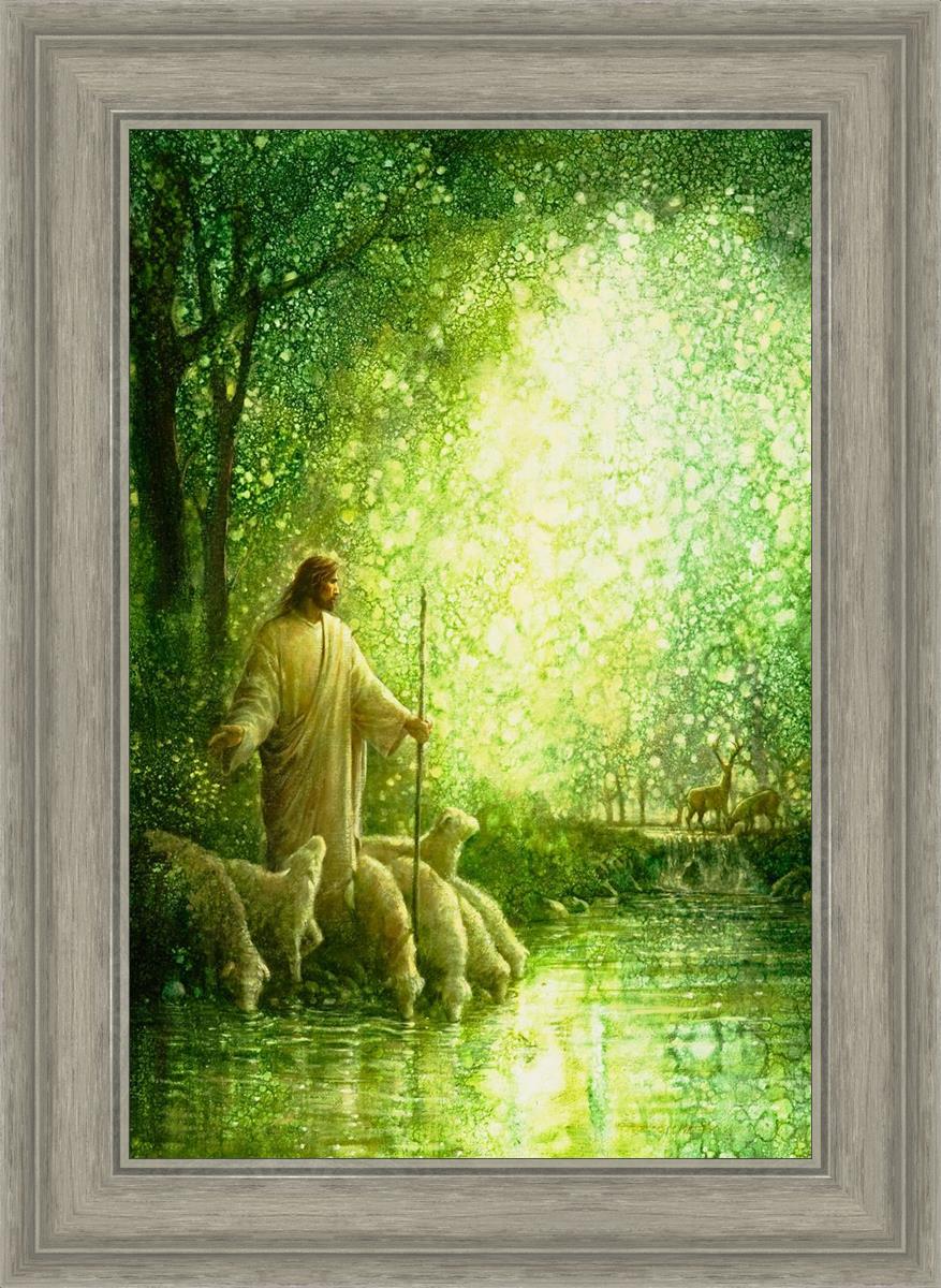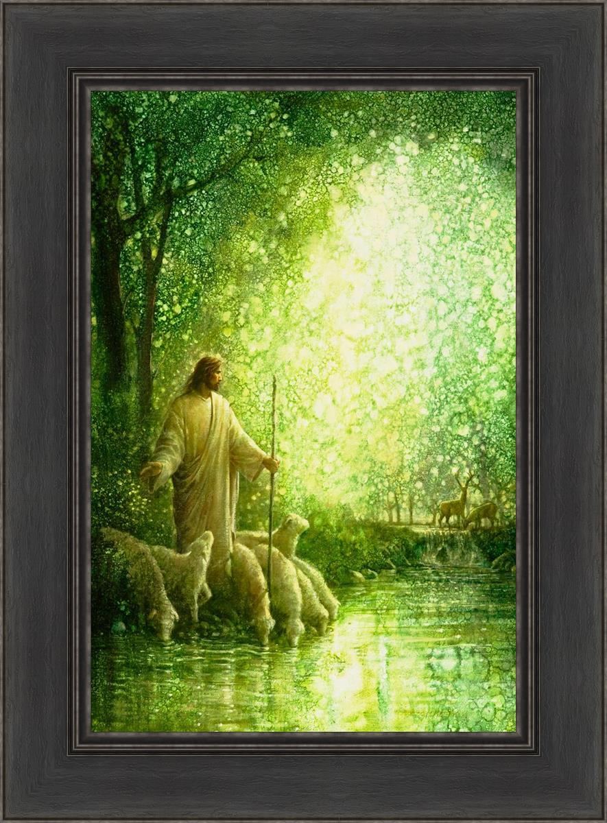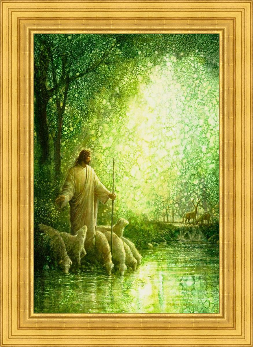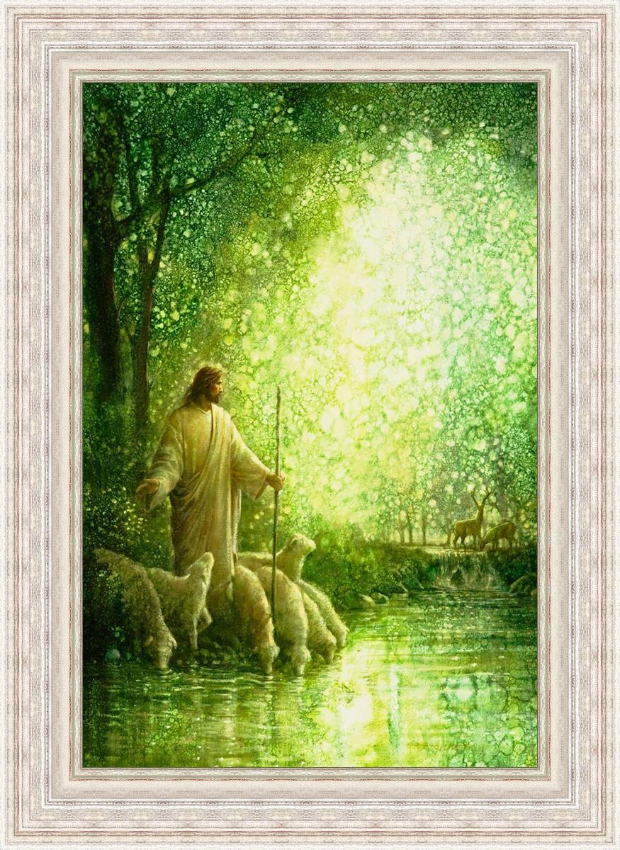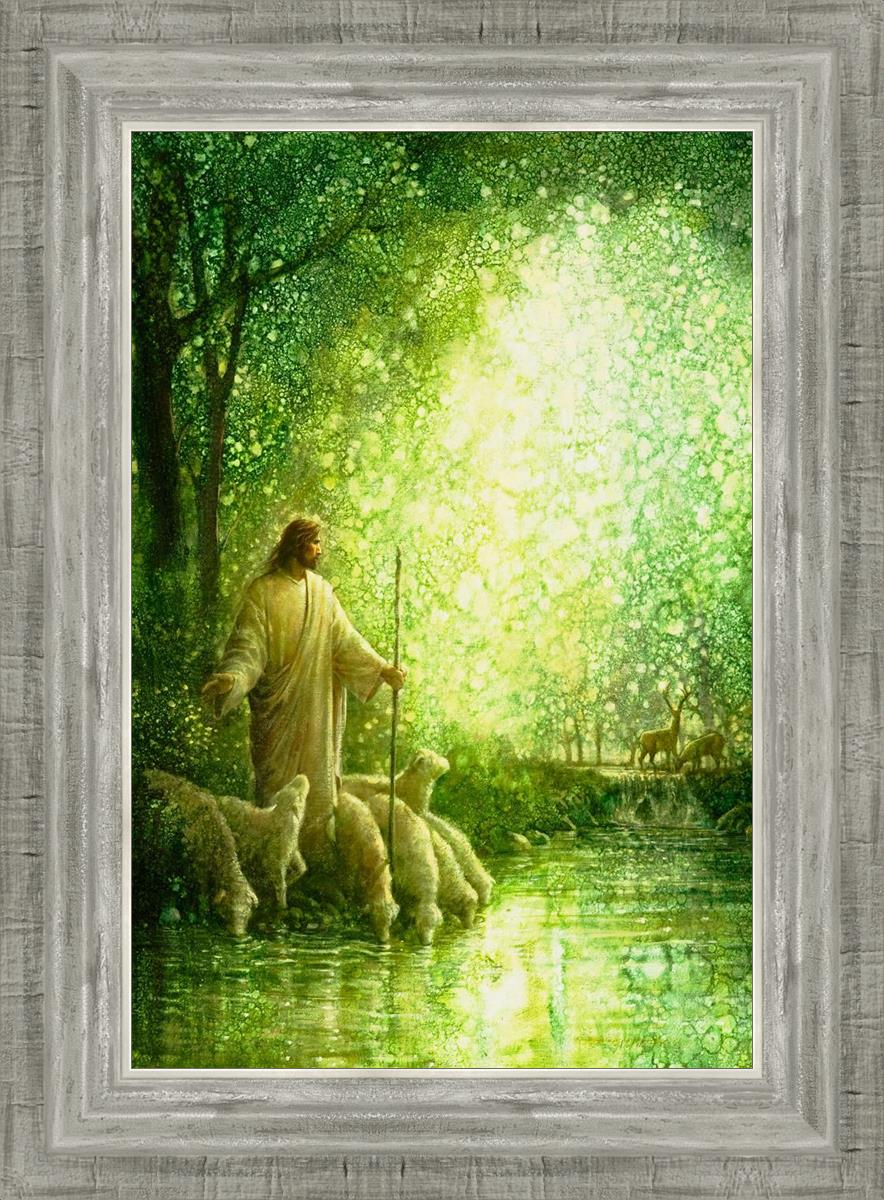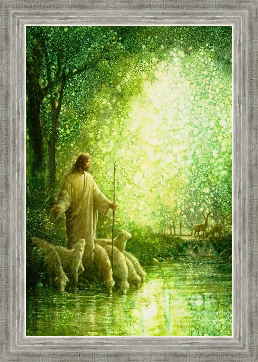 In this piece, Christ is depicted at the edge of a pond, gazing over His flock with deep compassion and care. The still waters reflect His peaceful presence, while the lush green landscape suggests a moment of rest for both the shepherd and His sheep. His gentle attention to the flock emphasizes His nurturing role and the sacred bond between the shepherd and His followers. Feed My Sheep serves as a visual reminder of Christ’s promise to guide, protect, and sustain His followers—reaffirming His eternal presence as the Good Shepherd who "feeds" His sheep with love and care.