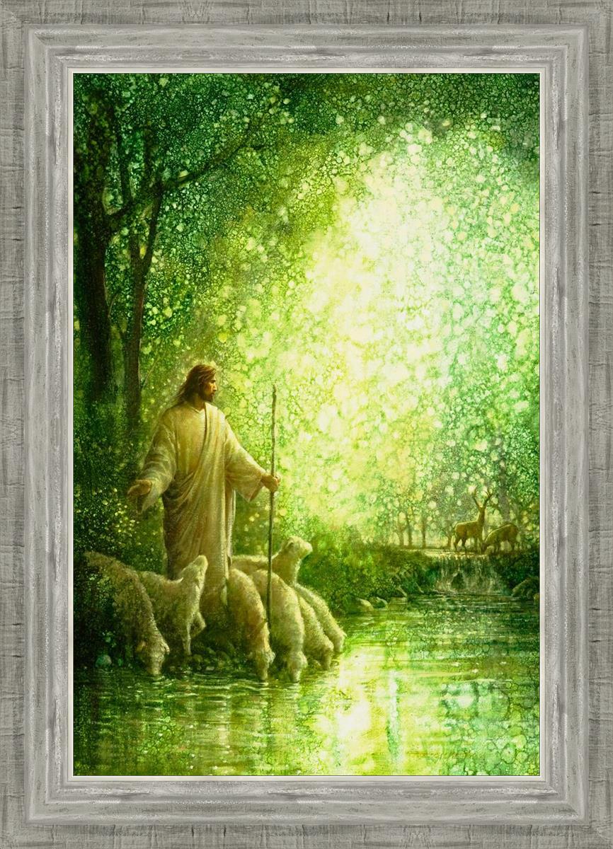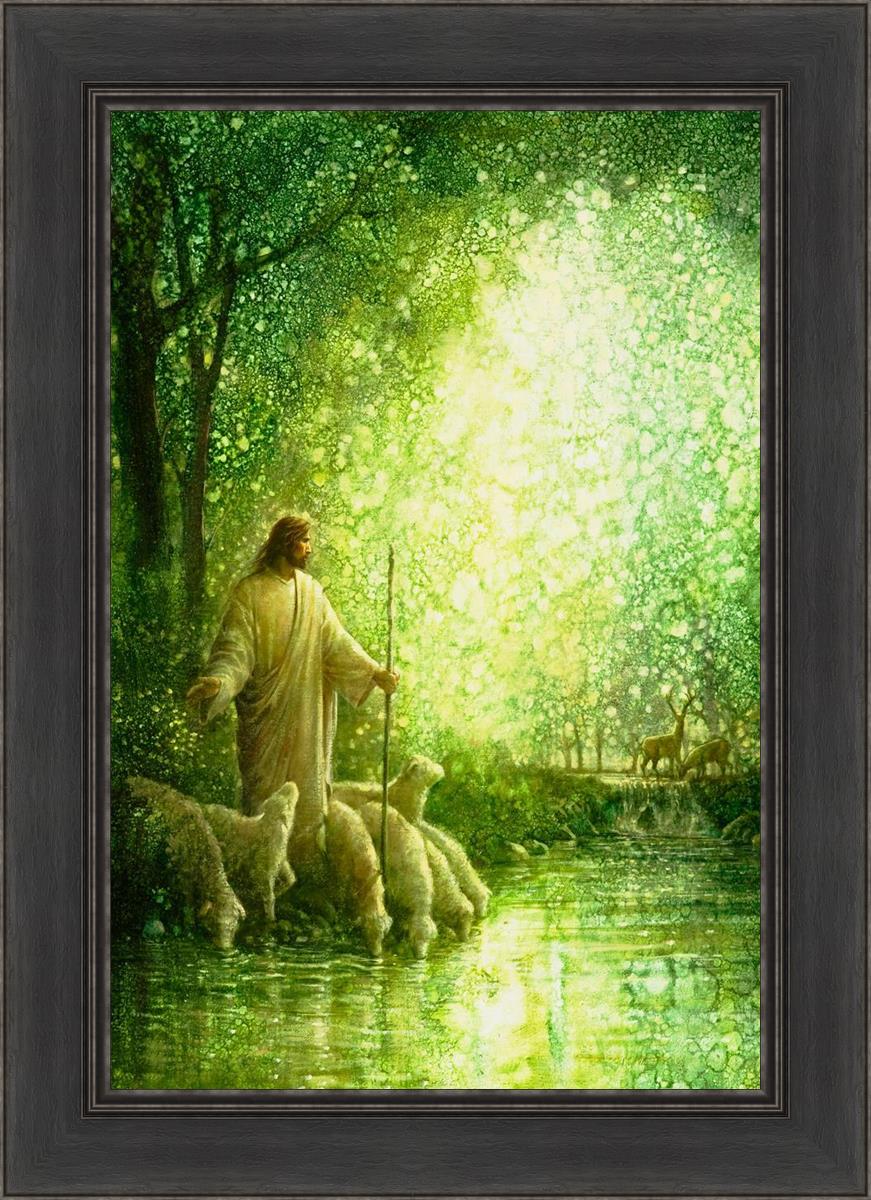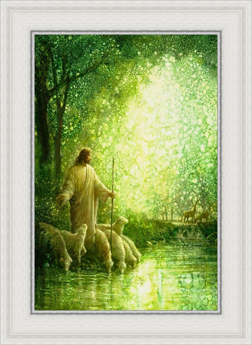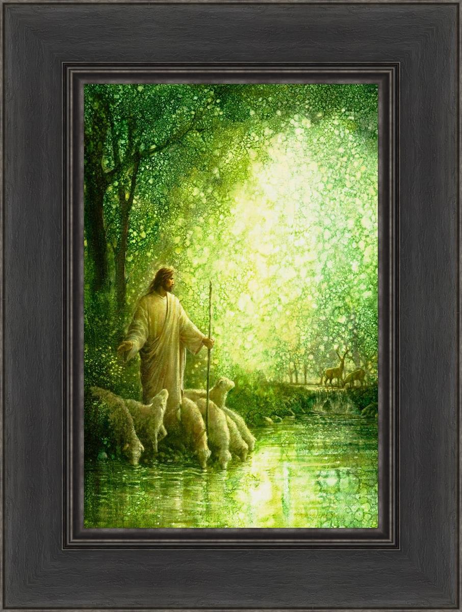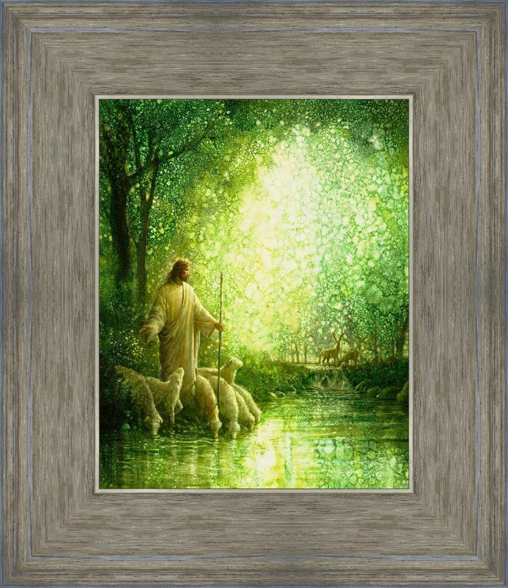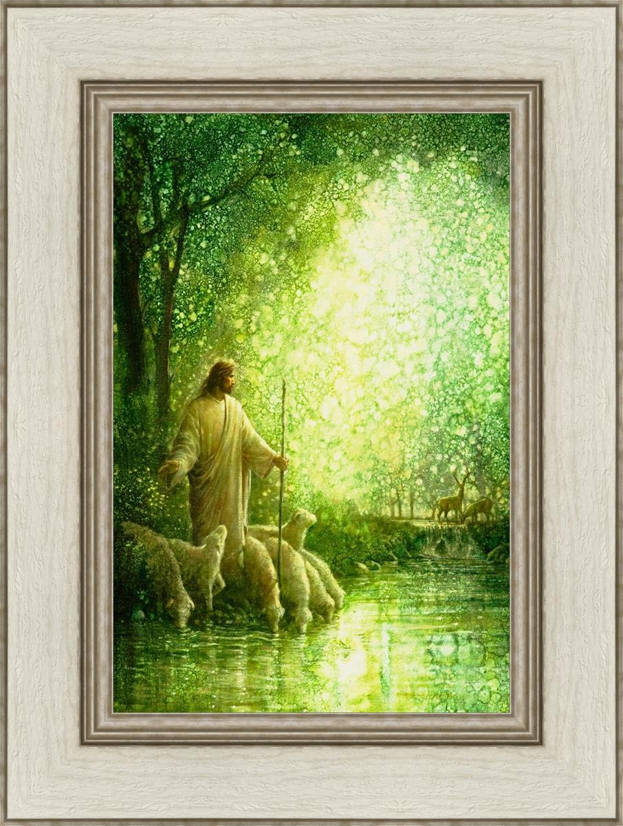 In this piece, Christ is depicted at the edge of a pond, gazing over His flock with deep compassion and care. The still waters reflect His peaceful presence, while the lush green landscape suggests a moment of rest for both the shepherd and His sheep. His gentle attention to the flock emphasizes His nurturing role and the sacred bond between the shepherd and His followers. Feed My Sheep serves as a visual reminder of Christ’s promise to guide, protect, and sustain His followers—reaffirming His eternal presence as the Good Shepherd who "feeds" His sheep with love and care.