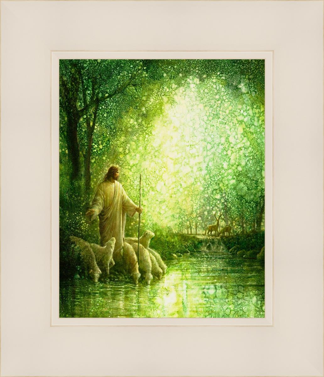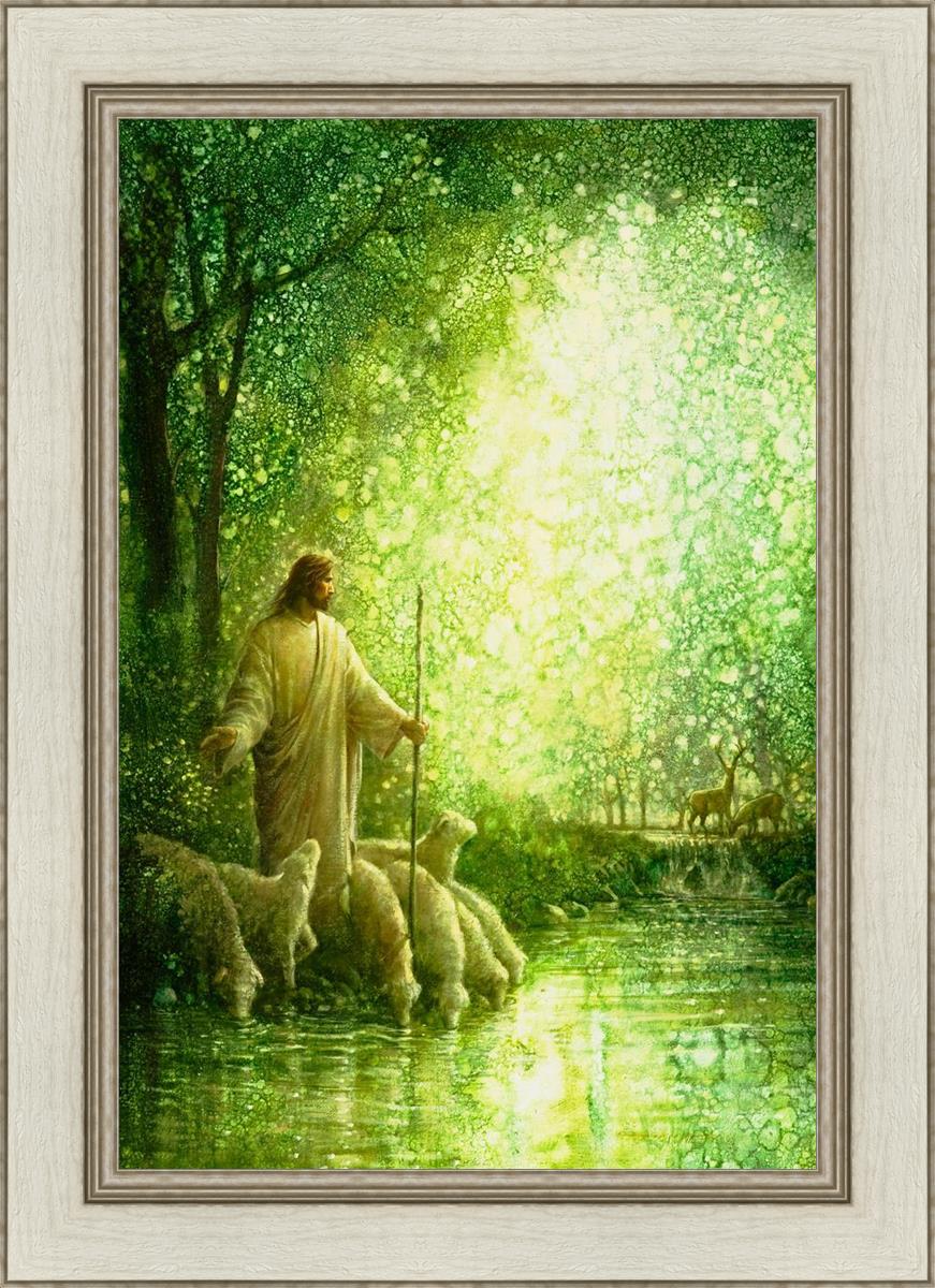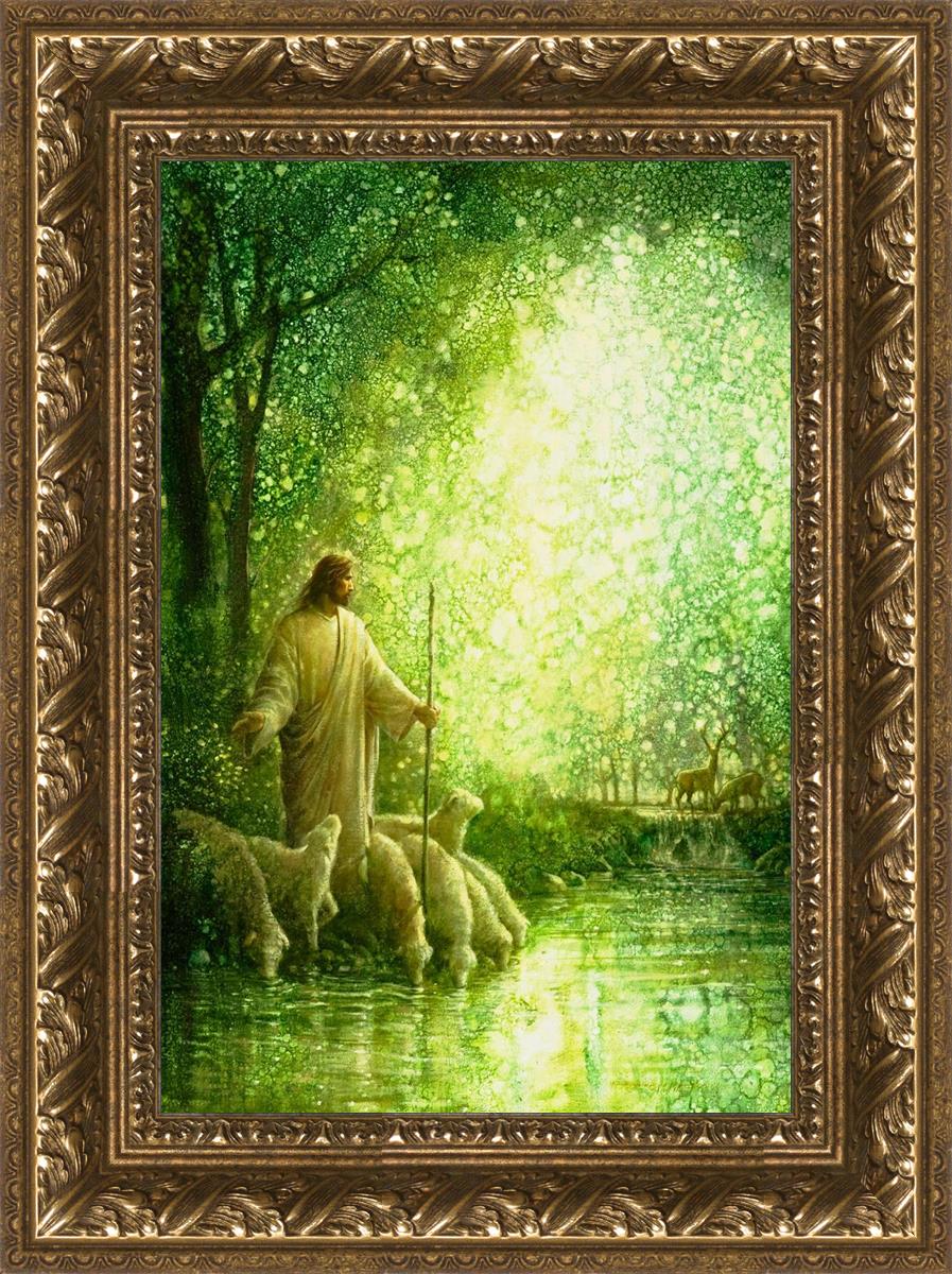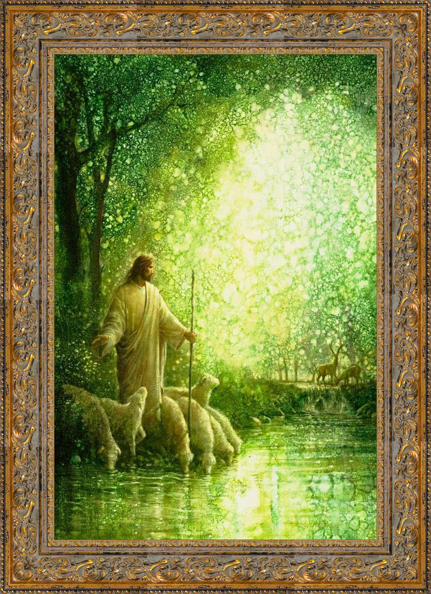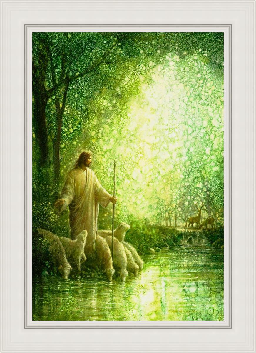 In this piece, Christ is depicted at the edge of a pond, gazing over His flock with deep compassion and care. The still waters reflect His peaceful presence, while the lush green landscape suggests a moment of rest for both the shepherd and His sheep. His gentle attention to the flock emphasizes His nurturing role and the sacred bond between the shepherd and His followers. Feed My Sheep serves as a visual reminder of Christ’s promise to guide, protect, and sustain His followers—reaffirming His eternal presence as the Good Shepherd who "feeds" His sheep with love and care.