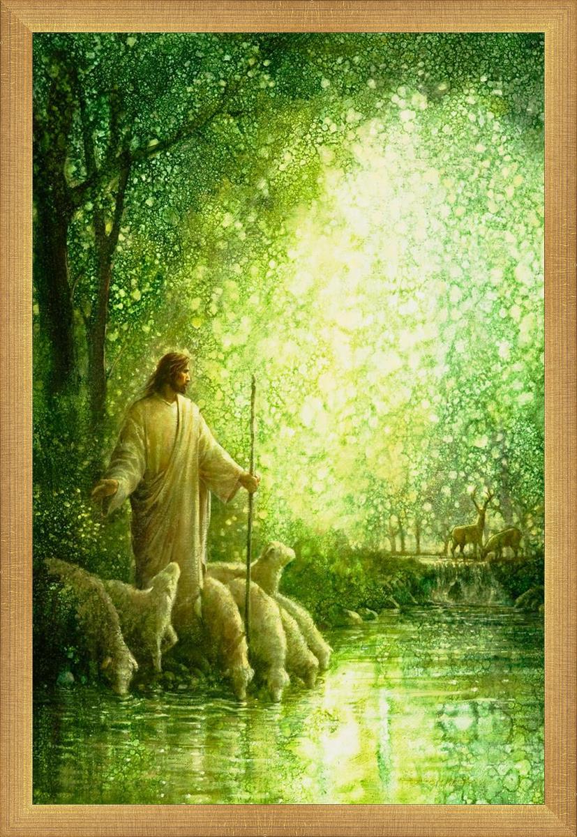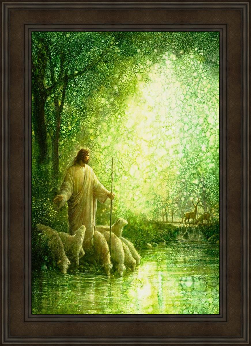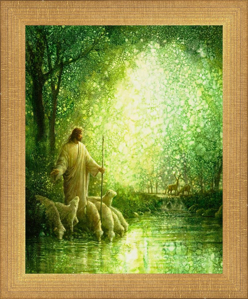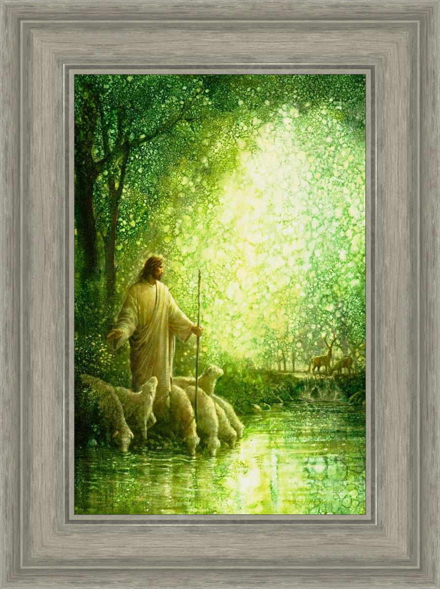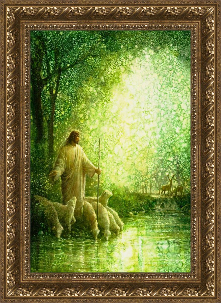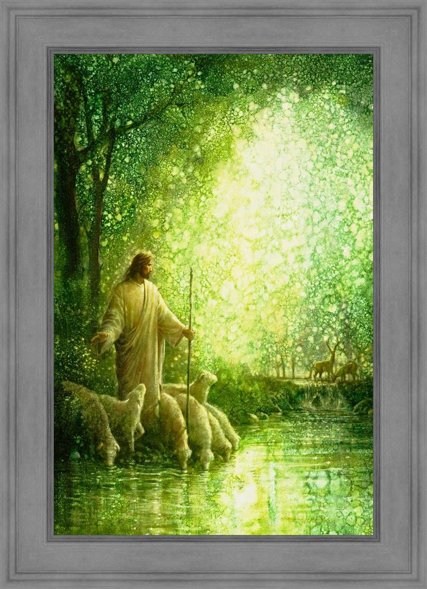In this piece, Christ is depicted at the edge of a pond, gazing over His flock with deep compassion and care. The still waters reflect His peaceful presence, while the lush green landscape suggests a moment of rest for both the shepherd and His sheep. His gentle attention to the flock emphasizes His nurturing role and the sacred bond between the shepherd and His followers. Feed My Sheep serves as a visual reminder of Christ’s promise to guide, protect, and sustain His followers—reaffirming His eternal presence as the Good Shepherd who "feeds" His sheep with love and care.