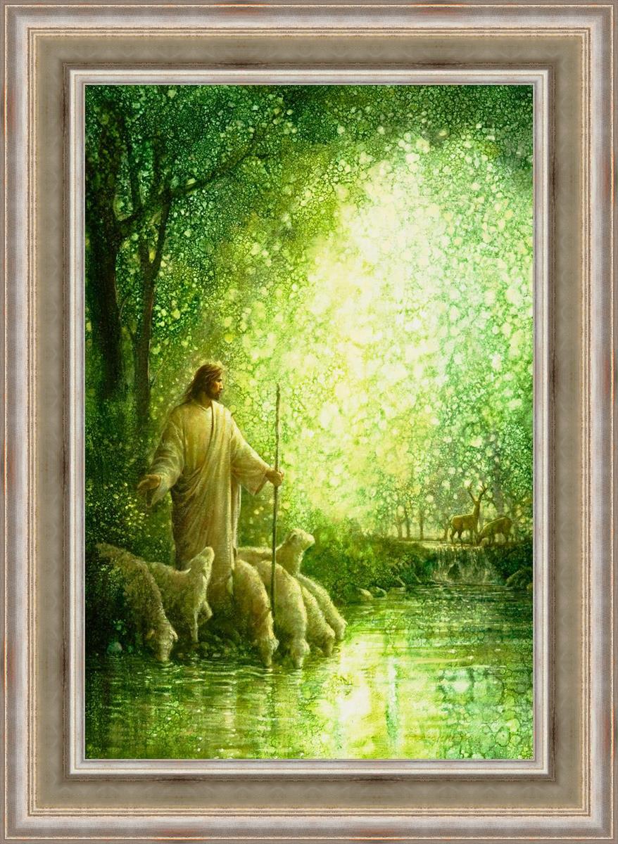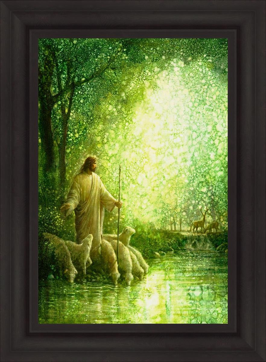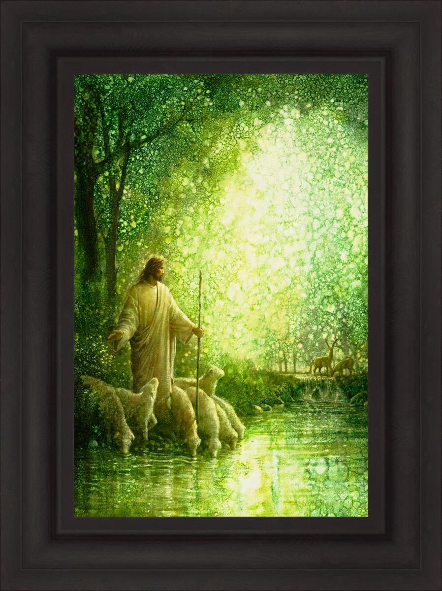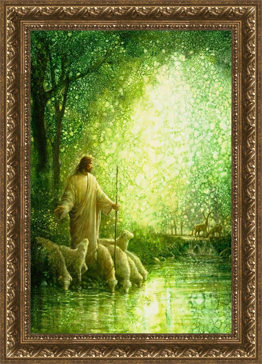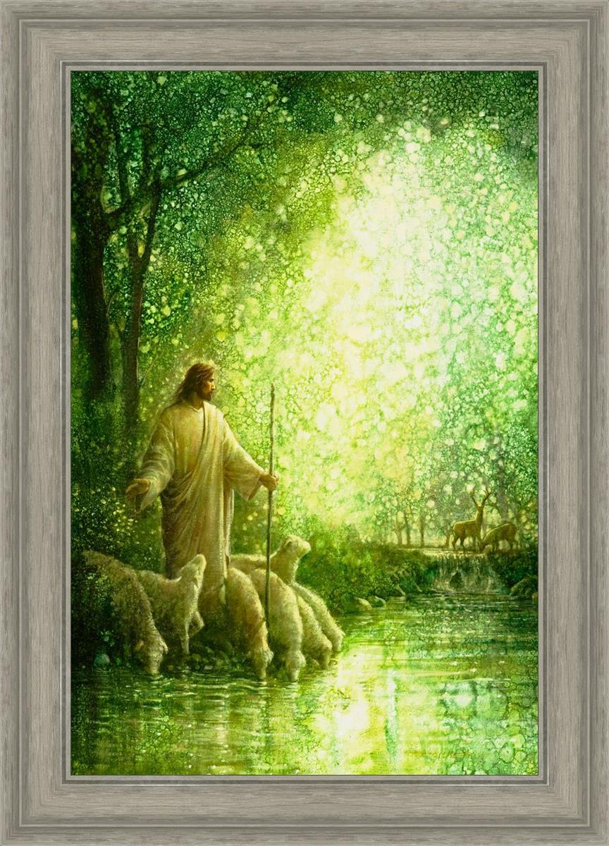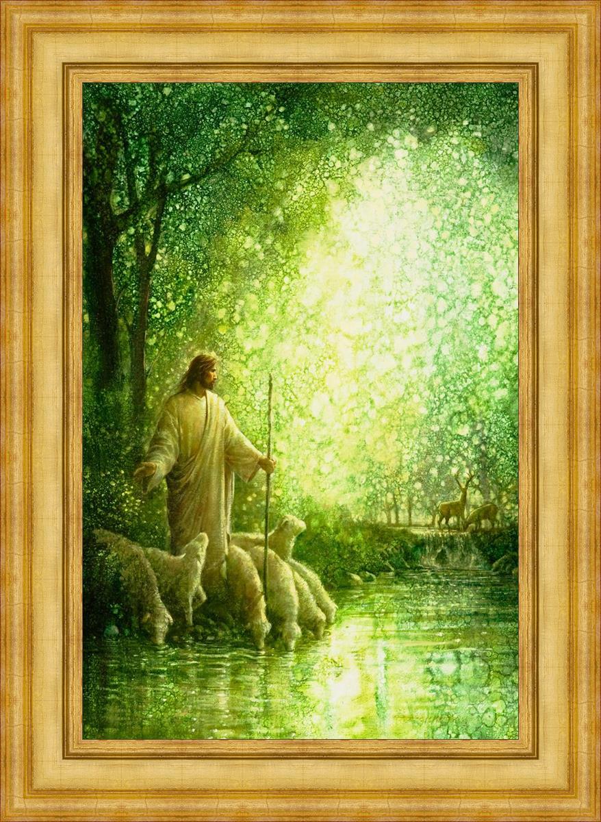 In this piece, Christ is depicted at the edge of a pond, gazing over His flock with deep compassion and care. The still waters reflect His peaceful presence, while the lush green landscape suggests a moment of rest for both the shepherd and His sheep. His gentle attention to the flock emphasizes His nurturing role and the sacred bond between the shepherd and His followers. Feed My Sheep serves as a visual reminder of Christ’s promise to guide, protect, and sustain His followers—reaffirming His eternal presence as the Good Shepherd who "feeds" His sheep with love and care.