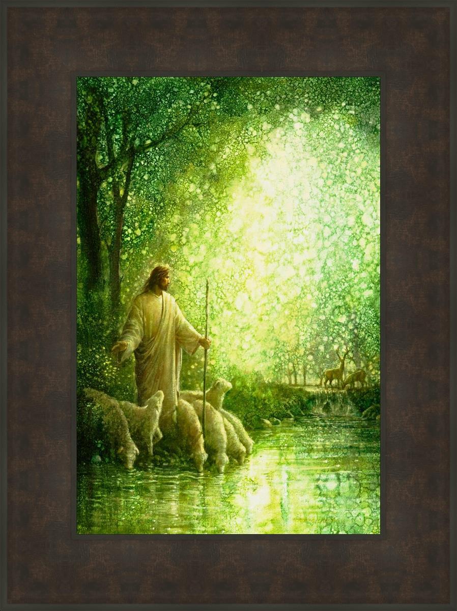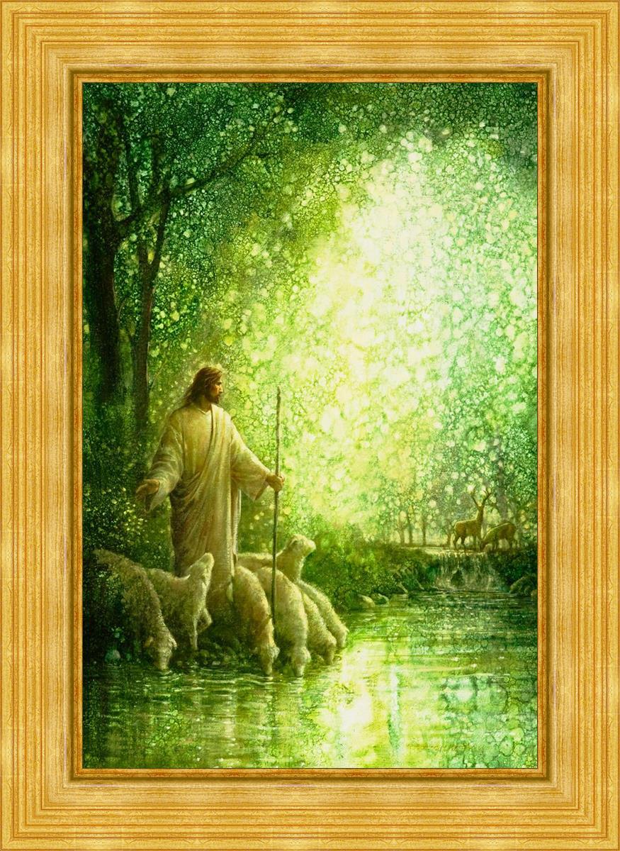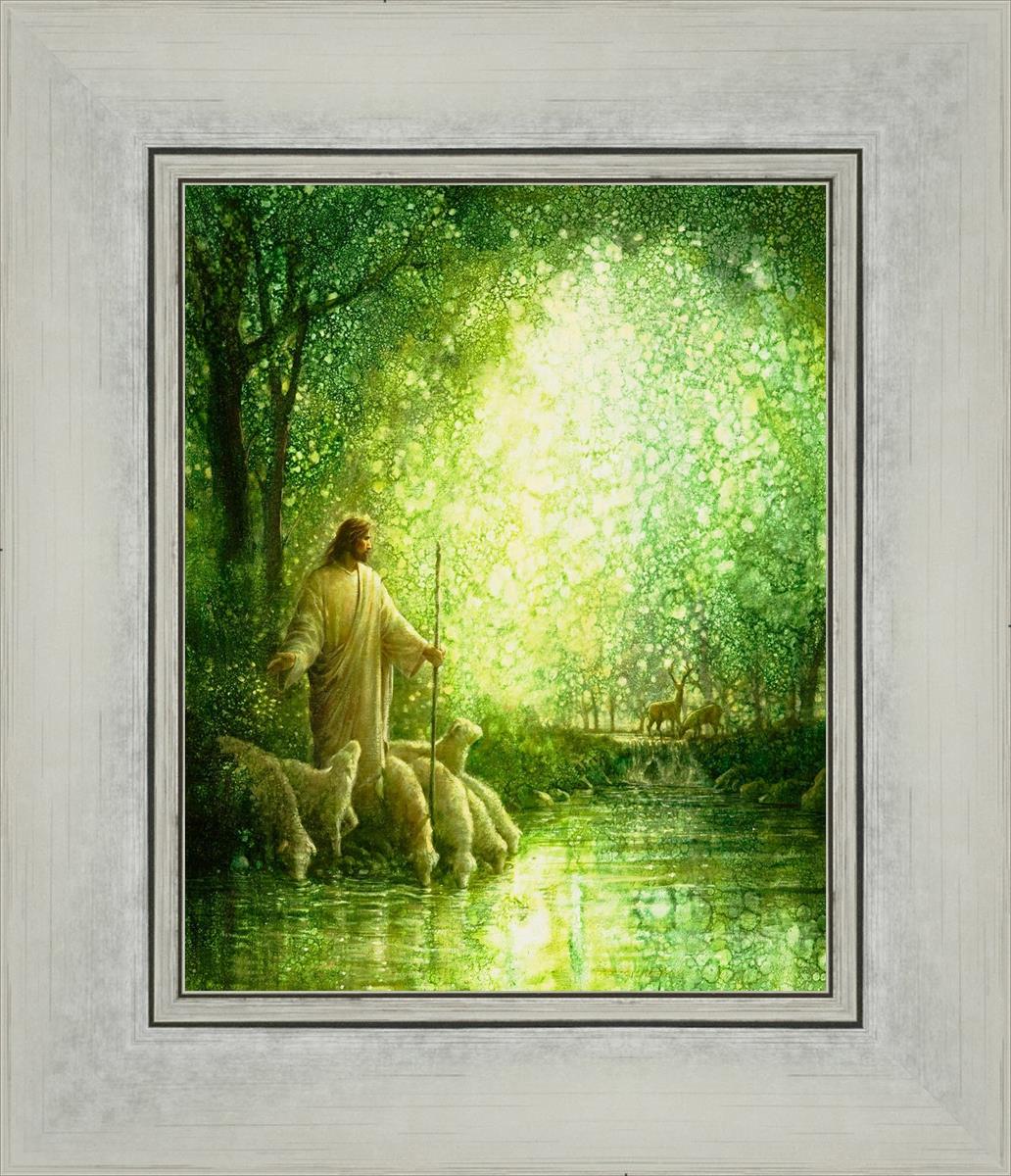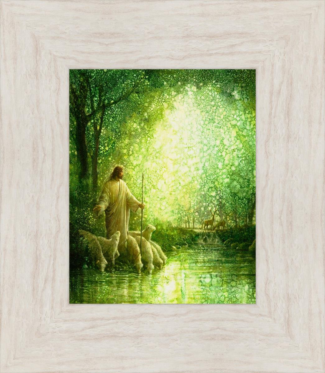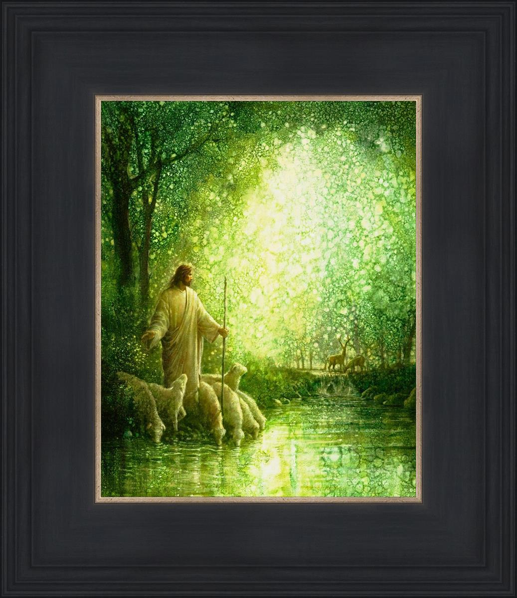 In this piece, Christ is depicted at the edge of a pond, gazing over His flock with deep compassion and care. The still waters reflect His peaceful presence, while the lush green landscape suggests a moment of rest for both the shepherd and His sheep. His gentle attention to the flock emphasizes His nurturing role and the sacred bond between the shepherd and His followers. Feed My Sheep serves as a visual reminder of Christ’s promise to guide, protect, and sustain His followers—reaffirming His eternal presence as the Good Shepherd who "feeds" His sheep with love and care.