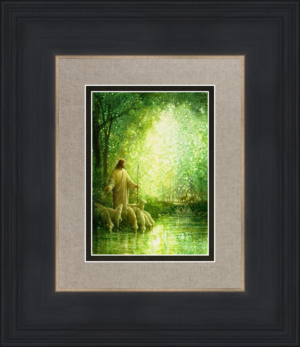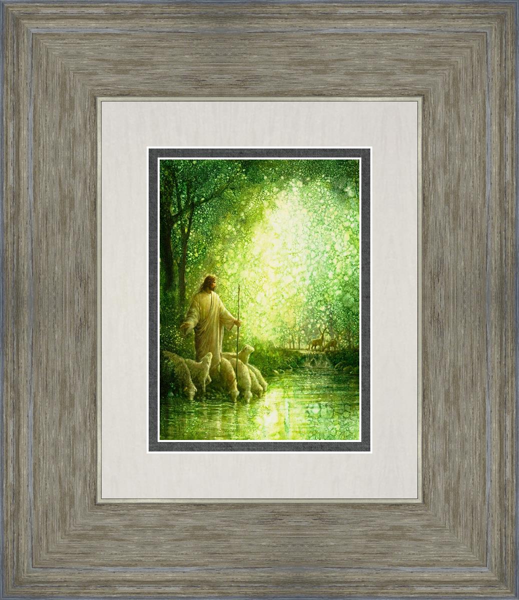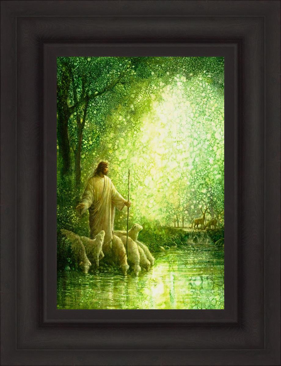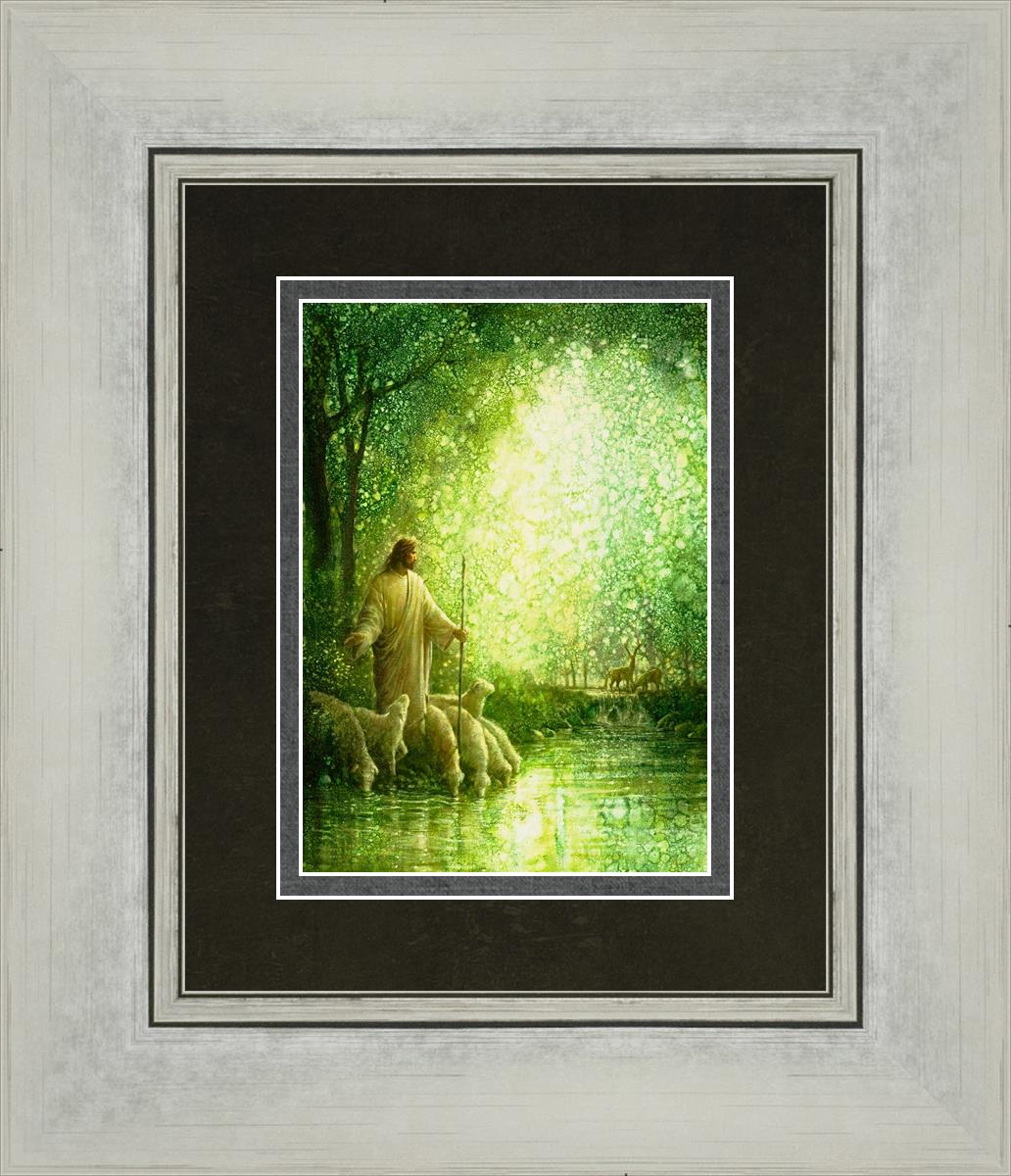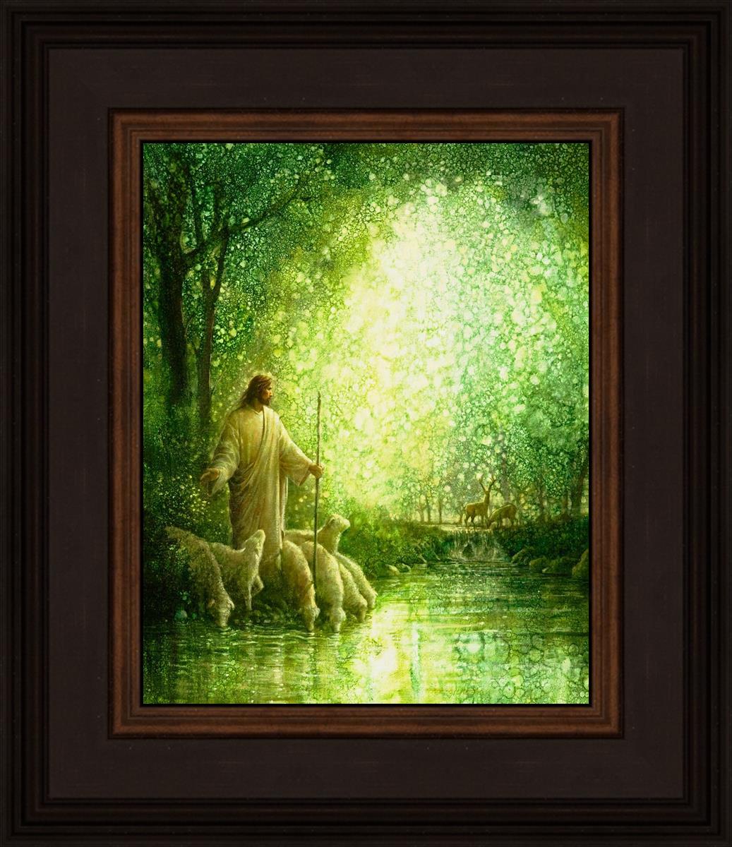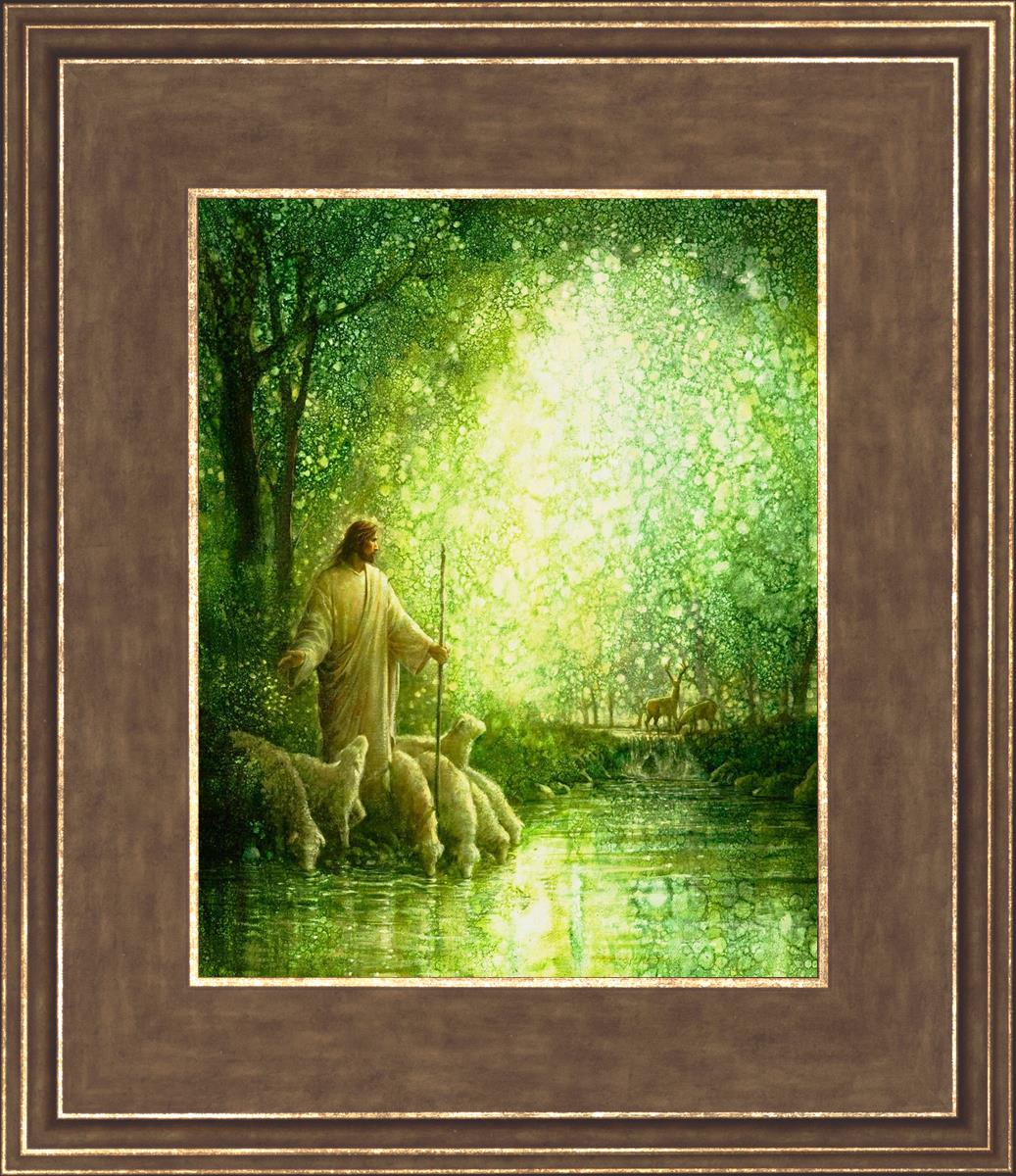 In this piece, Christ is depicted at the edge of a pond, gazing over His flock with deep compassion and care. The still waters reflect His peaceful presence, while the lush green landscape suggests a moment of rest for both the shepherd and His sheep. His gentle attention to the flock emphasizes His nurturing role and the sacred bond between the shepherd and His followers. Feed My Sheep serves as a visual reminder of Christ’s promise to guide, protect, and sustain His followers—reaffirming His eternal presence as the Good Shepherd who "feeds" His sheep with love and care.