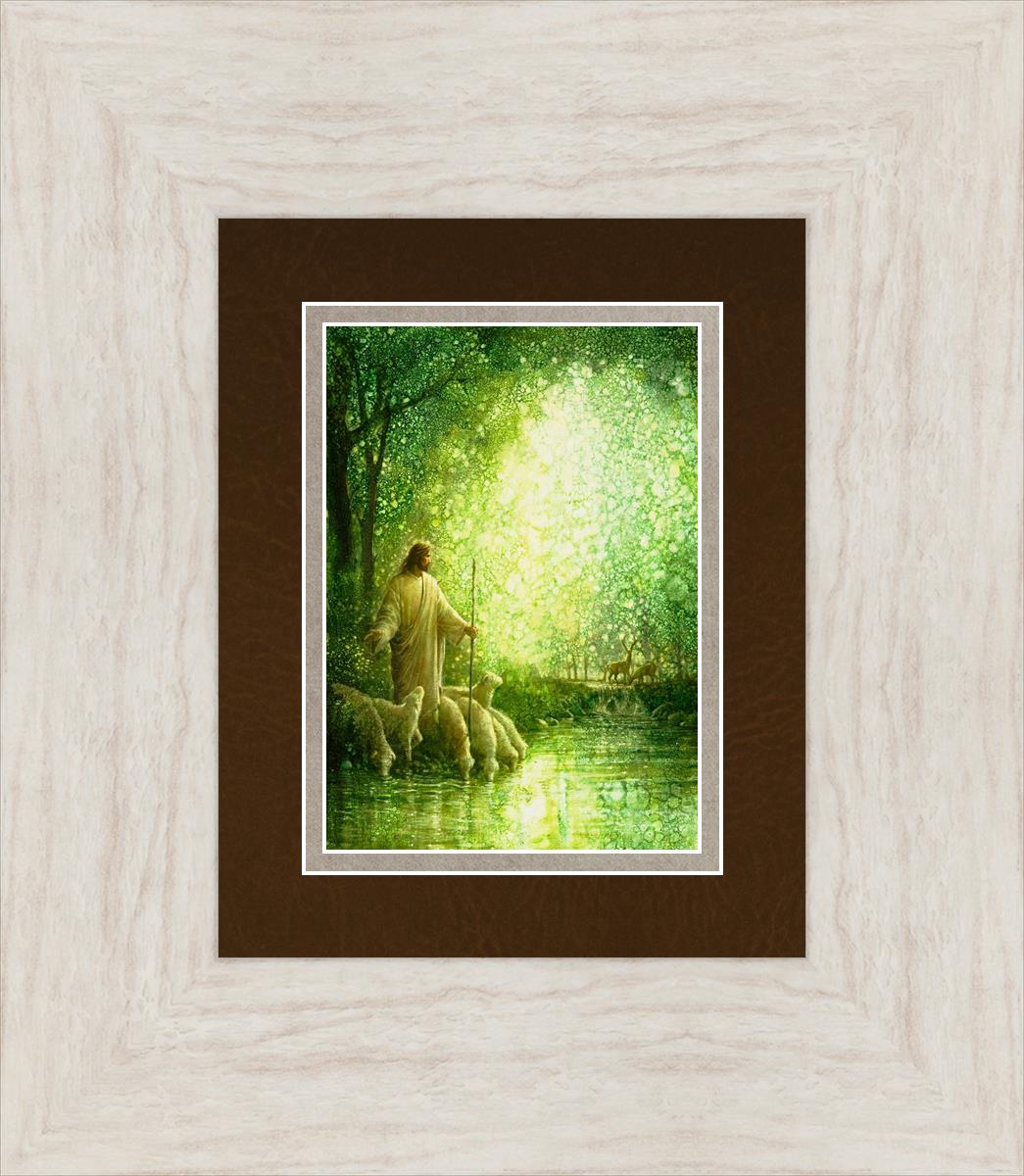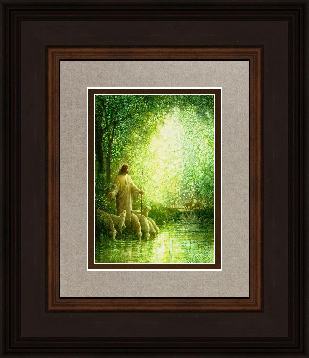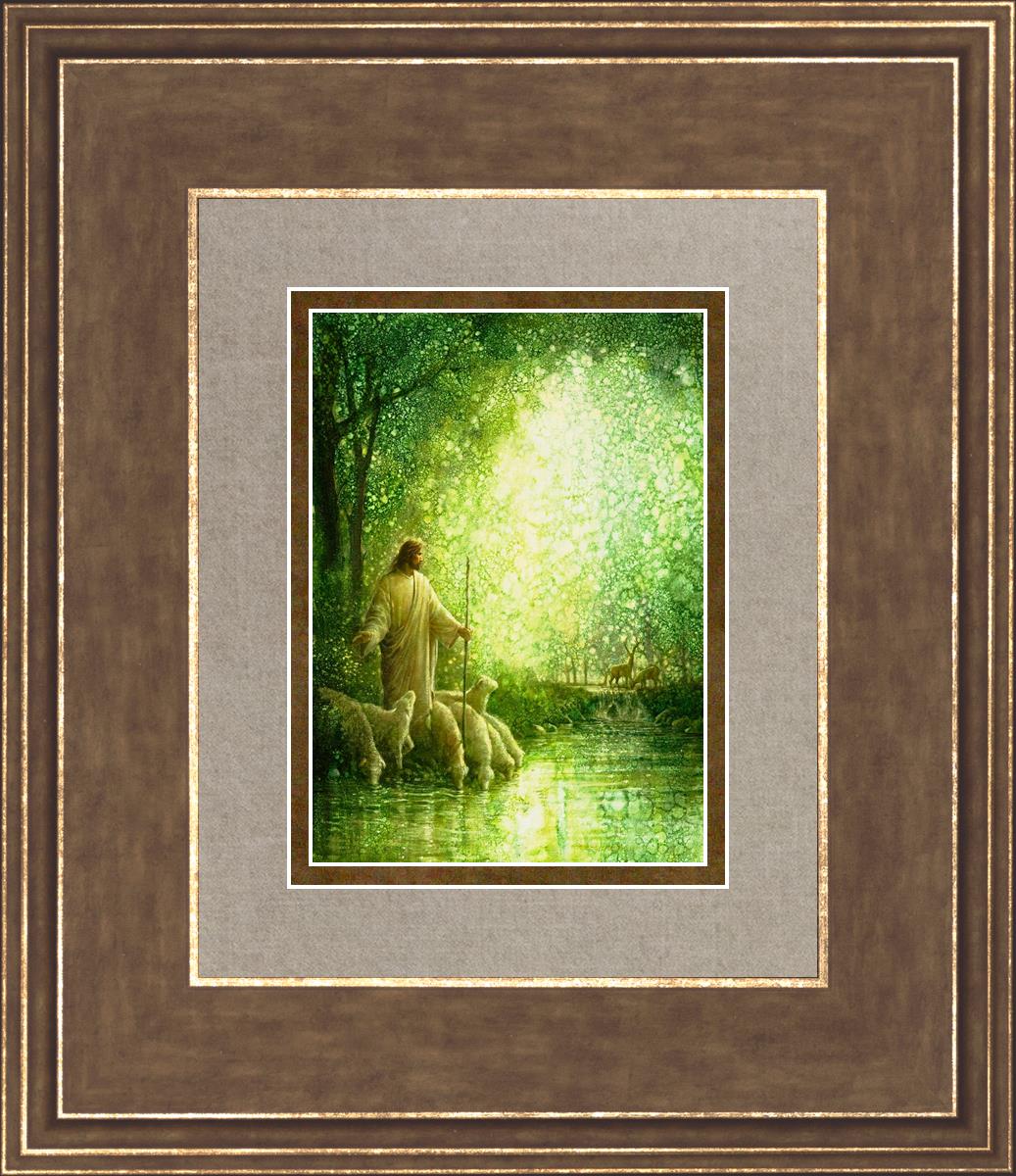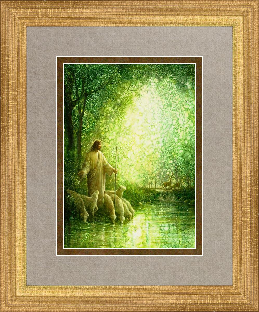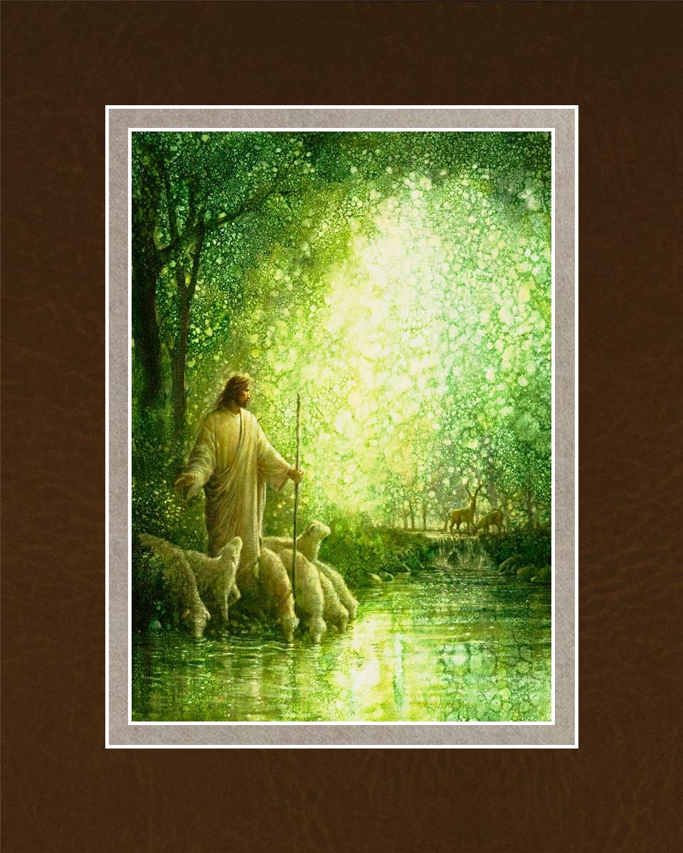 In this piece, Christ is depicted at the edge of a pond, gazing over His flock with deep compassion and care. The still waters reflect His peaceful presence, while the lush green landscape suggests a moment of rest for both the shepherd and His sheep. His gentle attention to the flock emphasizes His nurturing role and the sacred bond between the shepherd and His followers. Feed My Sheep serves as a visual reminder of Christ’s promise to guide, protect, and sustain His followers—reaffirming His eternal presence as the Good Shepherd who "feeds" His sheep with love and care.
