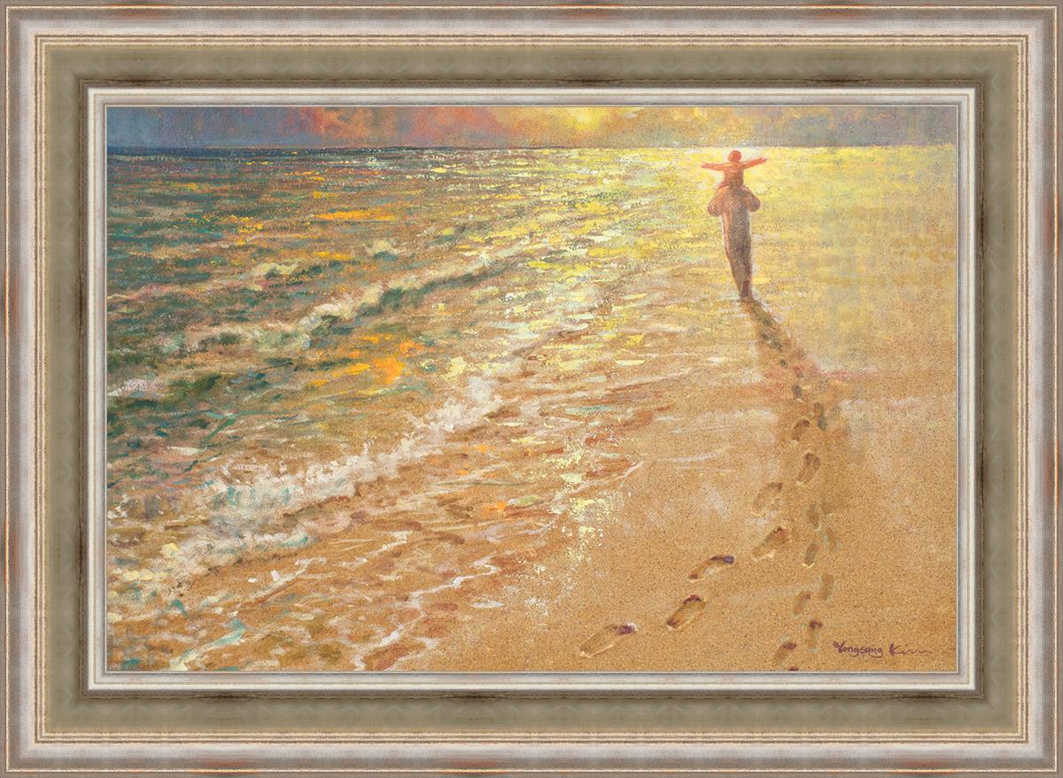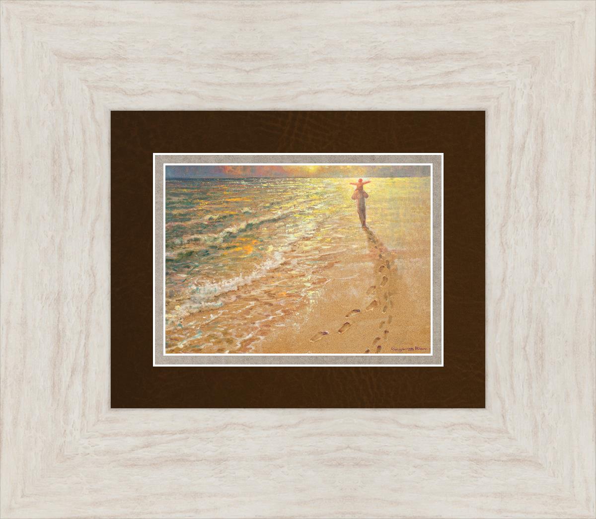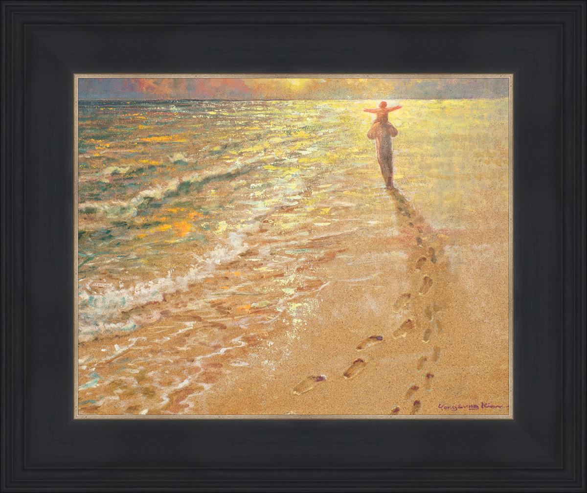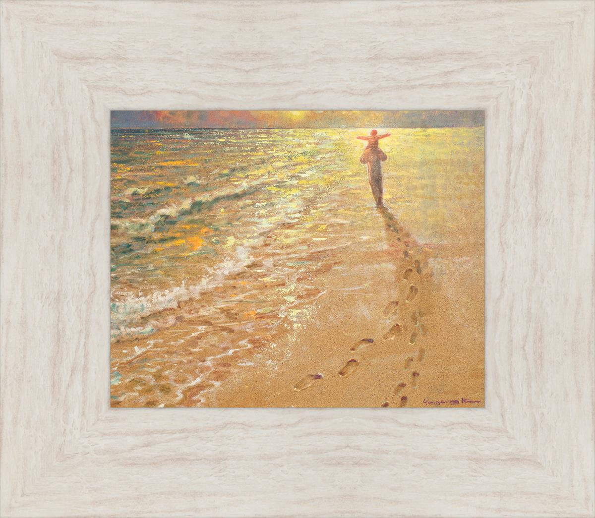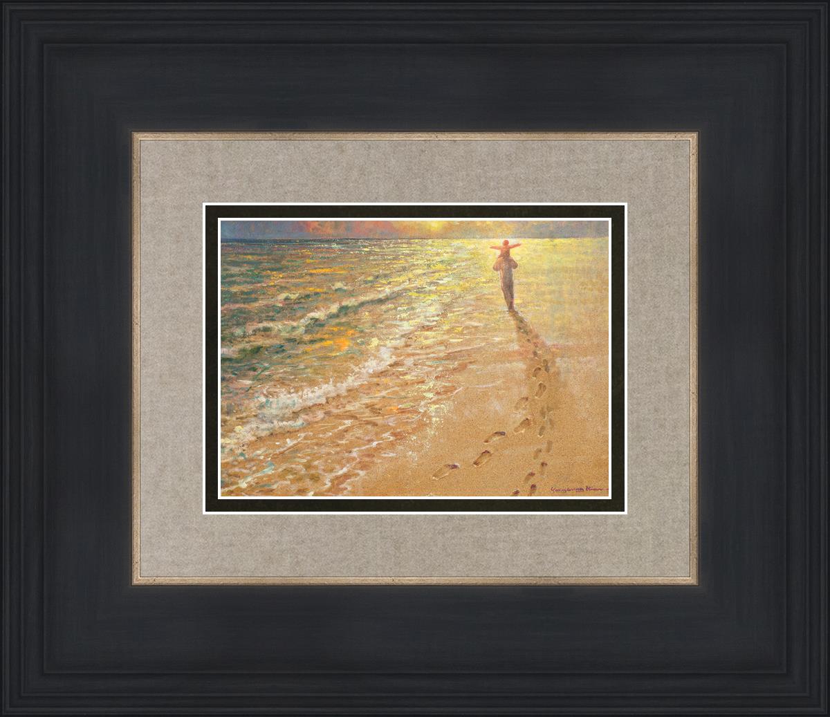 In this painting Jesus is seen walking along the beach, carrying a child on His shoulders. Their footprints are left behind in the sand, a visible testament to their journey together. As the scene unfolds, the footprints gradually fade until only Jesus’ footprints remain, illustrating the moment when He carries the child, offering comfort and protection. The soft, serene backdrop of the beach emphasizes the peace and safety found in Christ’s embrace. Footprints reflects on themes of divine support, trust, and the loving presence of Jesus, reminding viewers that, in times of struggle, He will carry us.