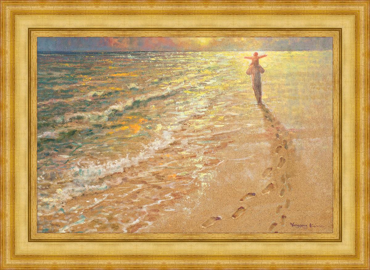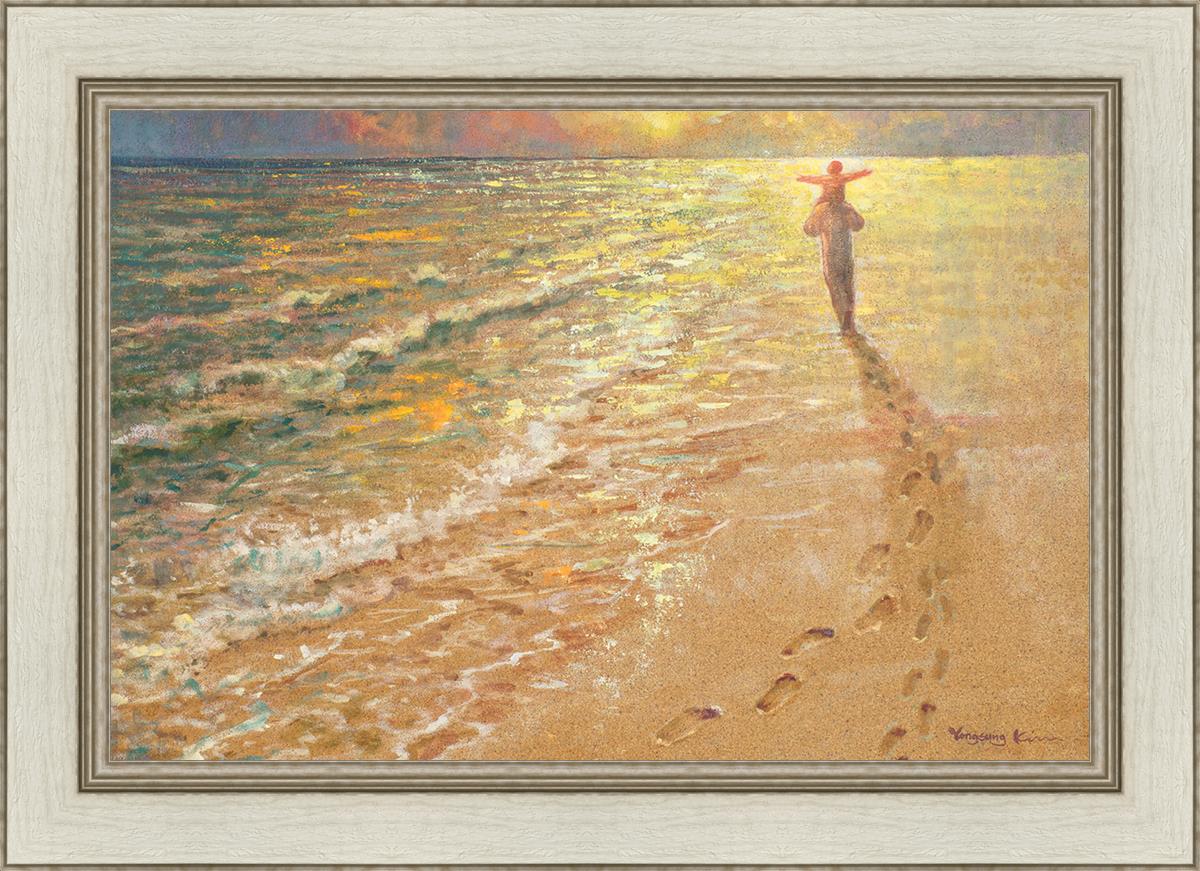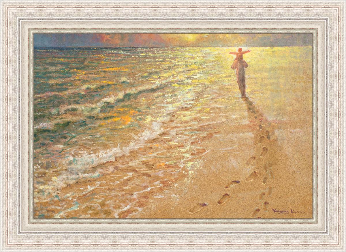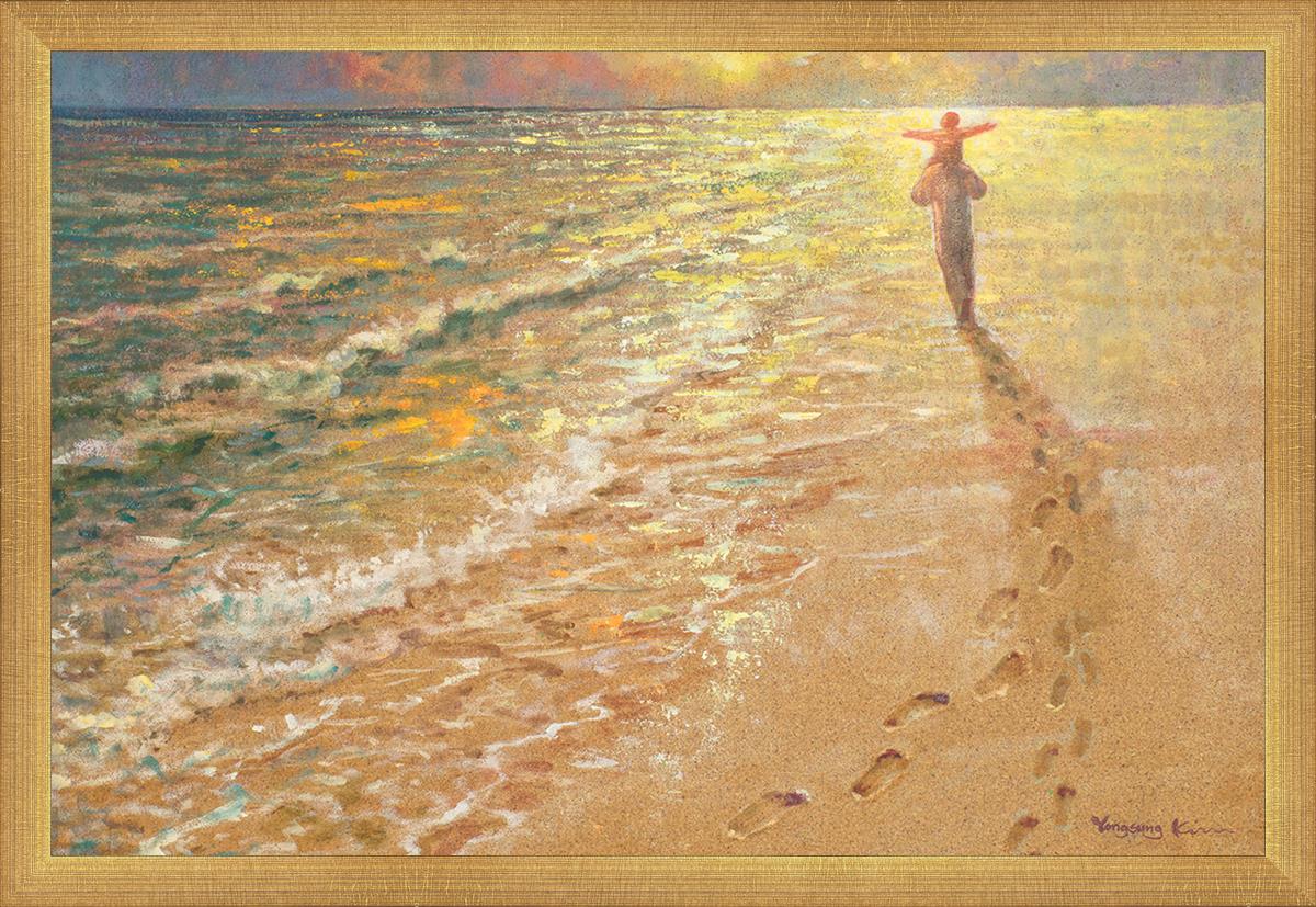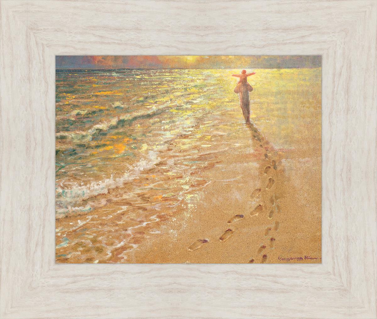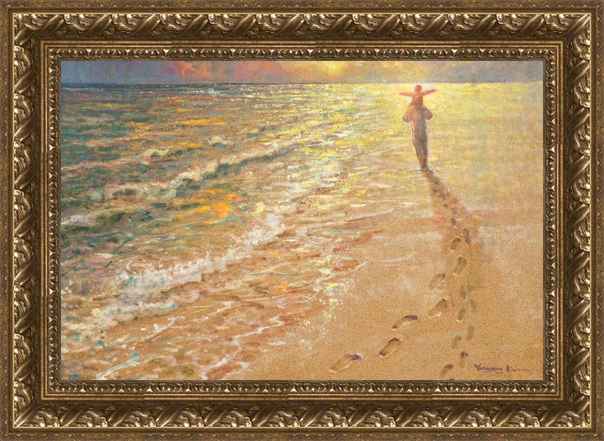 In this painting Jesus is seen walking along the beach, carrying a child on His shoulders. Their footprints are left behind in the sand, a visible testament to their journey together. As the scene unfolds, the footprints gradually fade until only Jesus’ footprints remain, illustrating the moment when He carries the child, offering comfort and protection. The soft, serene backdrop of the beach emphasizes the peace and safety found in Christ’s embrace. Footprints reflects on themes of divine support, trust, and the loving presence of Jesus, reminding viewers that, in times of struggle, He will carry us.
