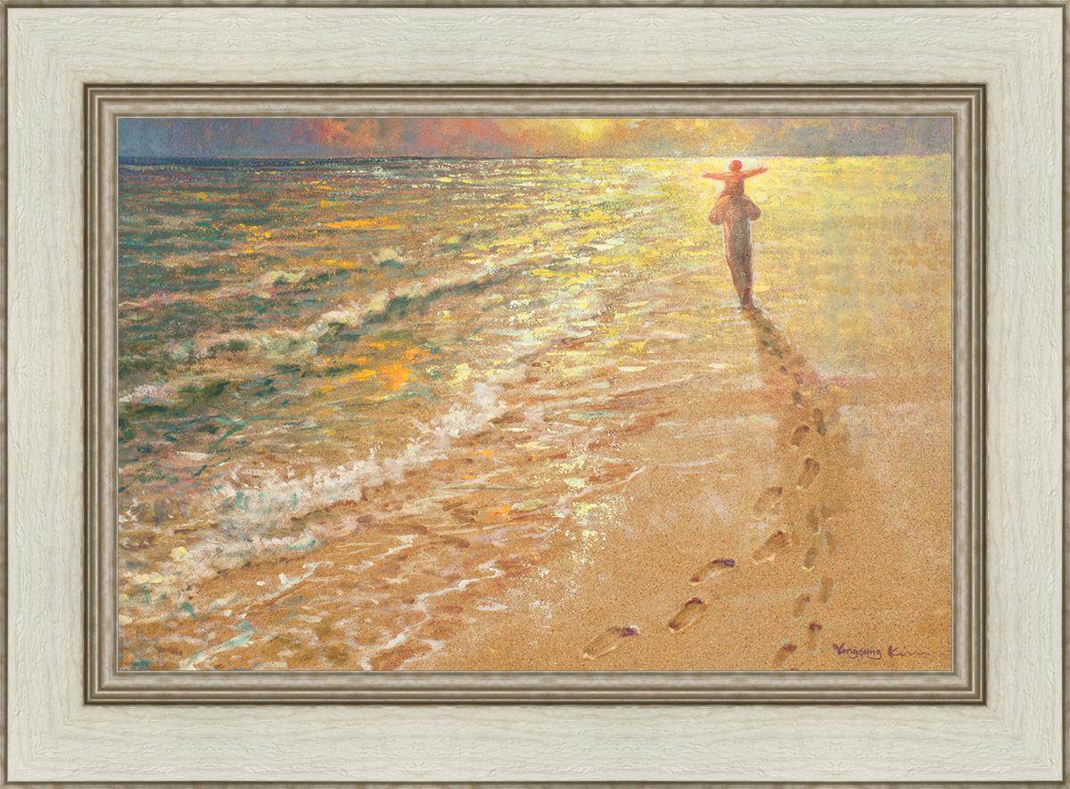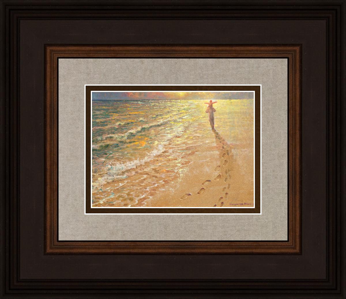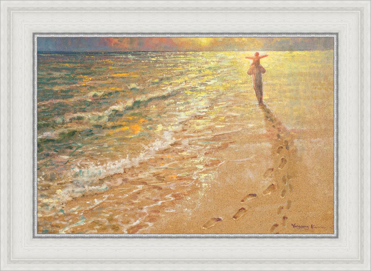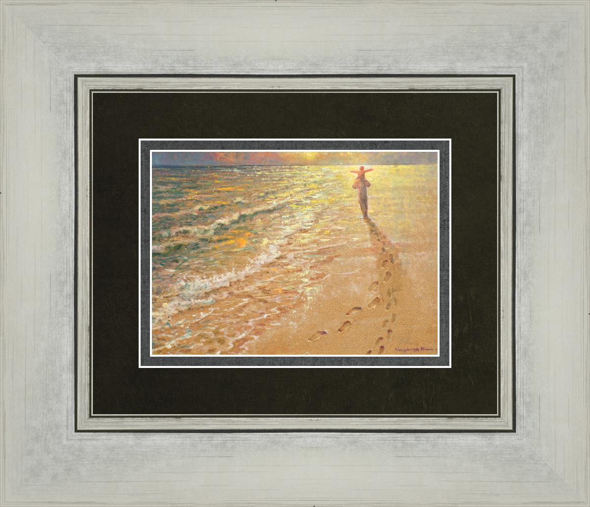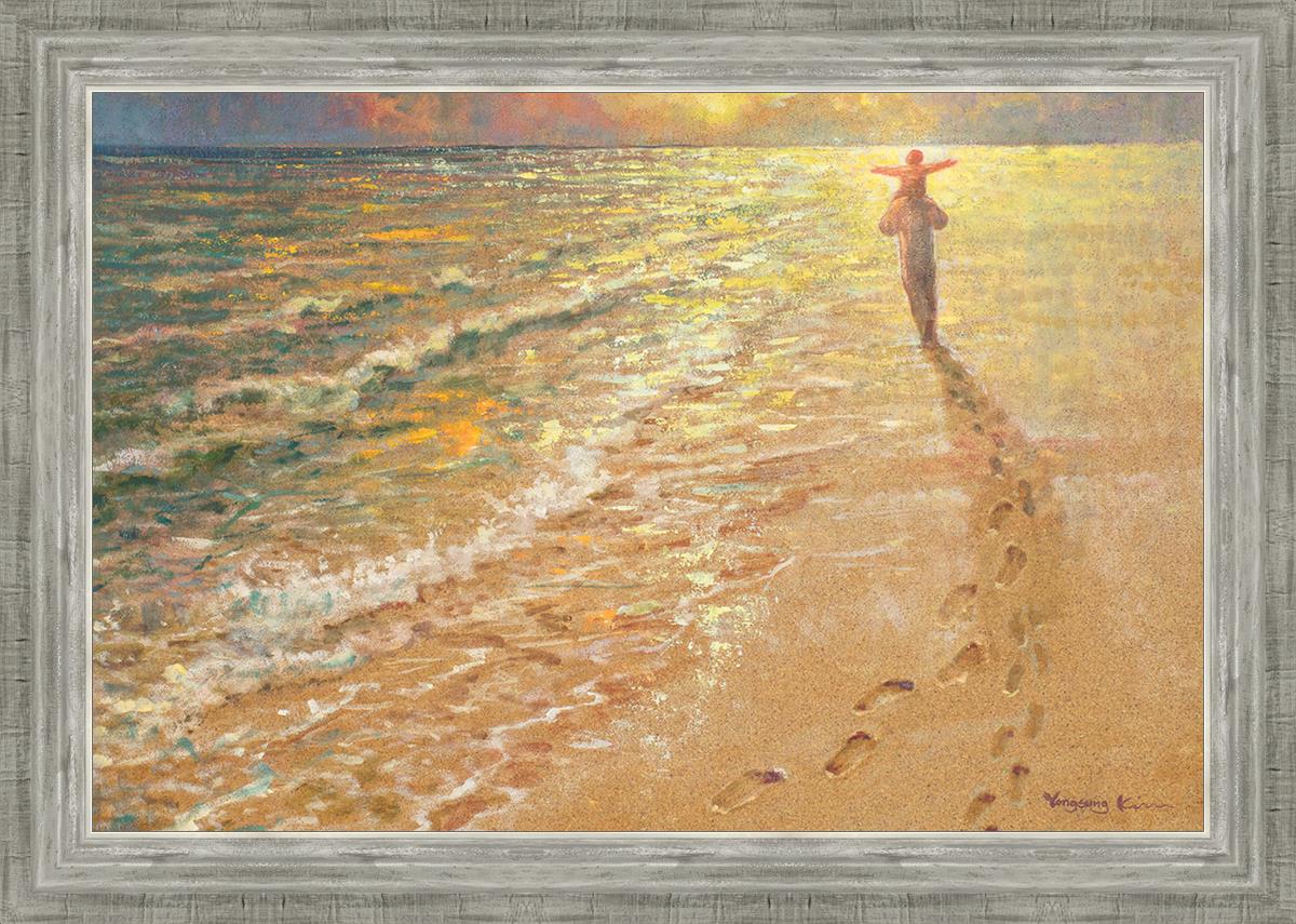 In this painting Jesus is seen walking along the beach, carrying a child on His shoulders. Their footprints are left behind in the sand, a visible testament to their journey together. As the scene unfolds, the footprints gradually fade until only Jesus’ footprints remain, illustrating the moment when He carries the child, offering comfort and protection. The soft, serene backdrop of the beach emphasizes the peace and safety found in Christ’s embrace. Footprints reflects on themes of divine support, trust, and the loving presence of Jesus, reminding viewers that, in times of struggle, He will carry us.