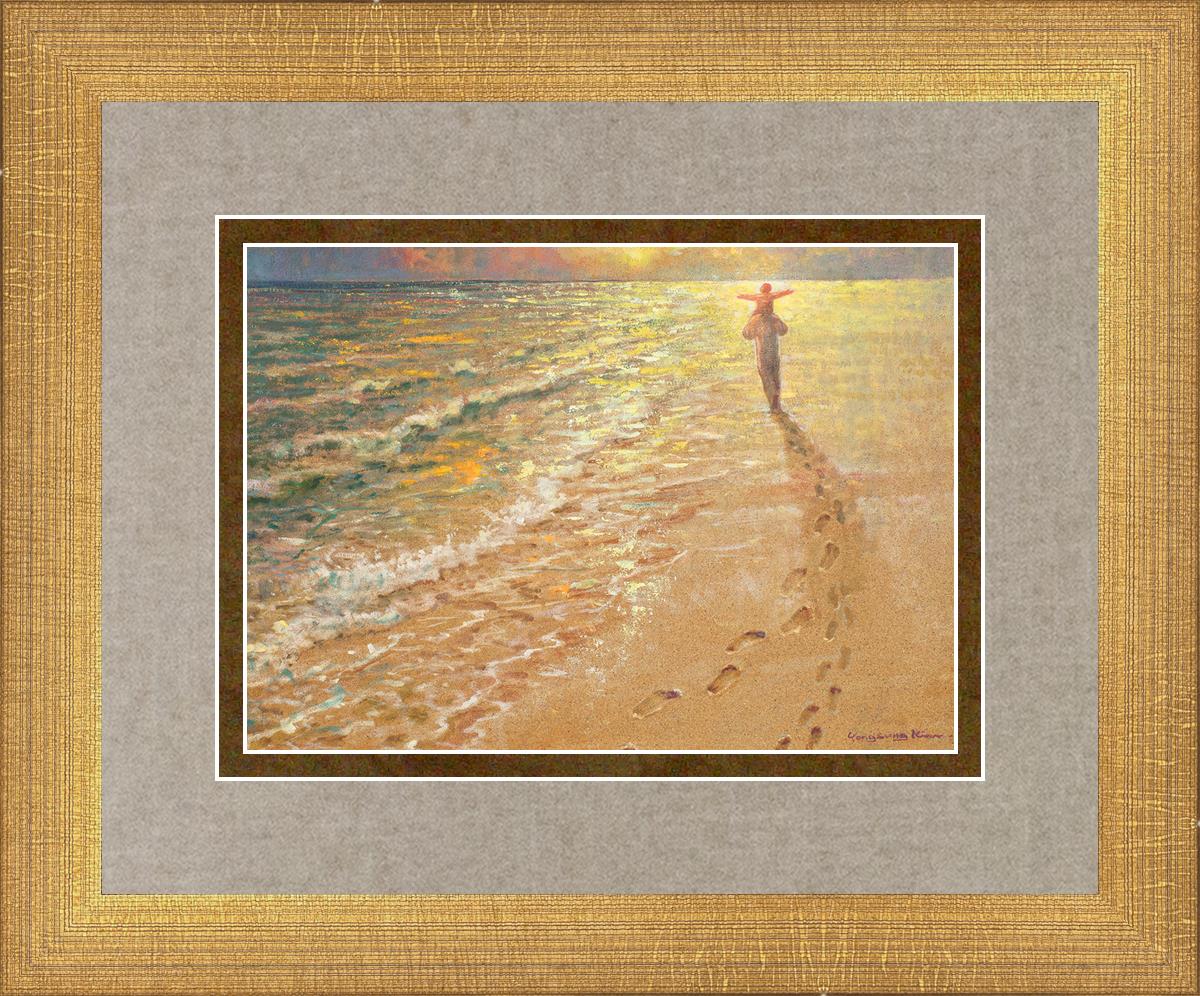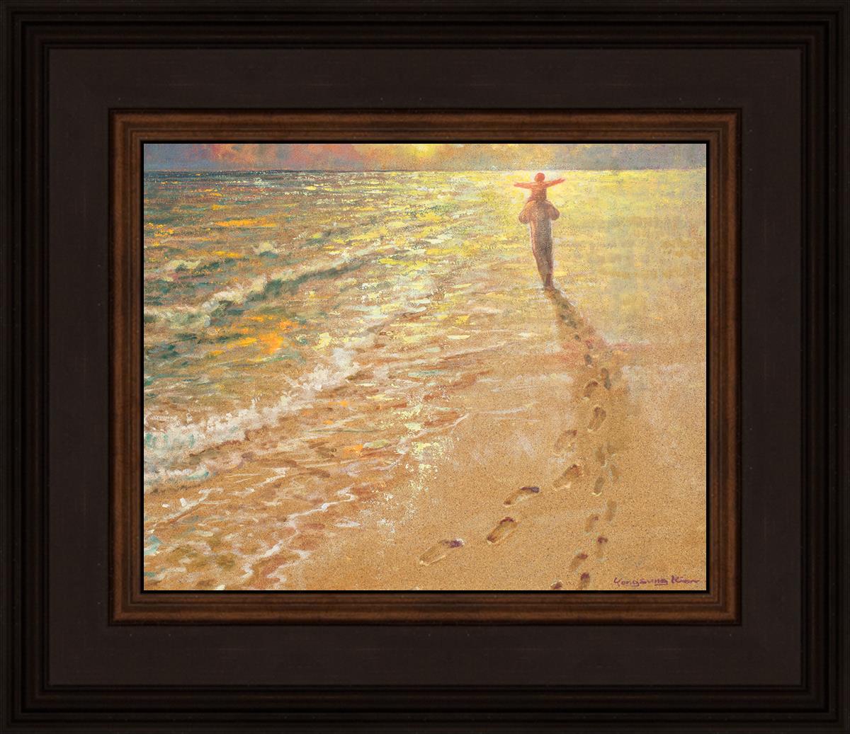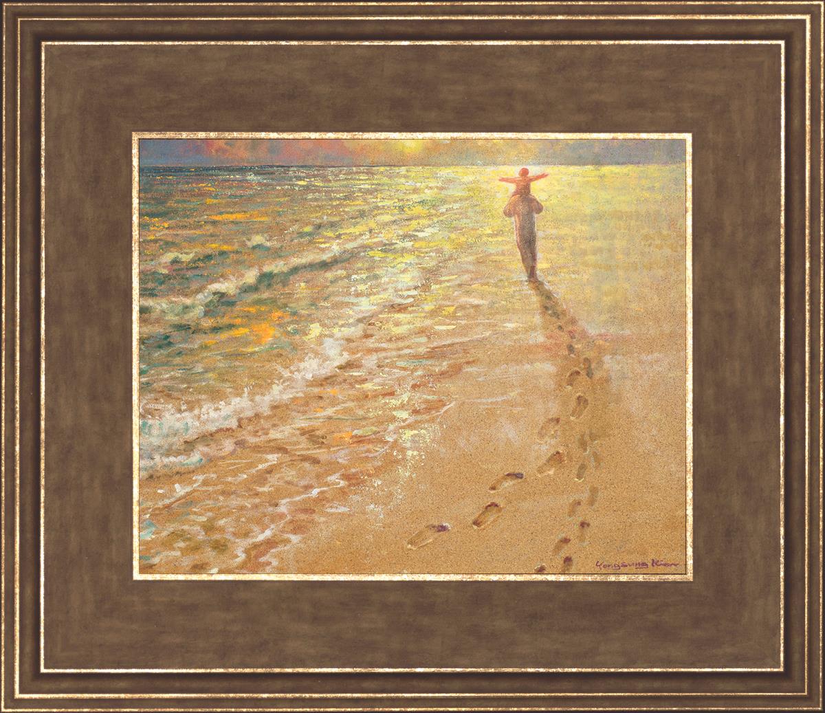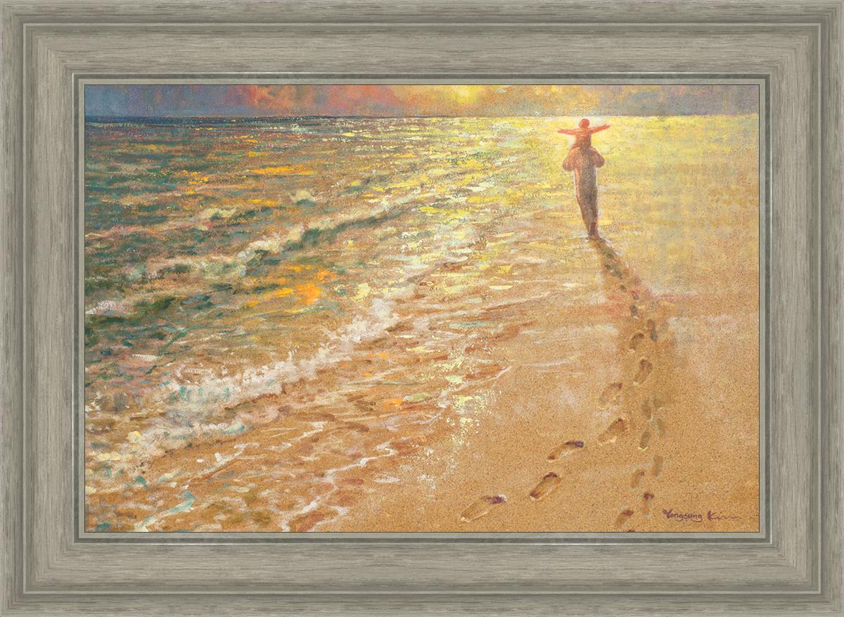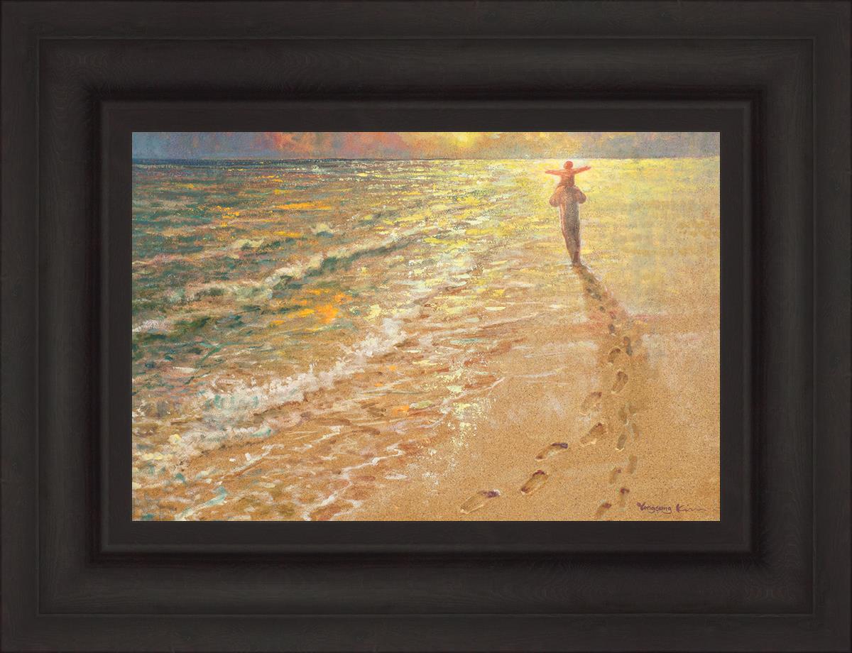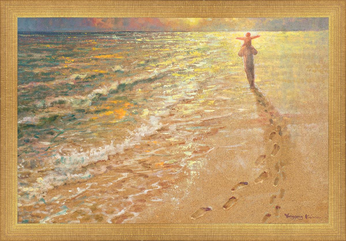 In this painting Jesus is seen walking along the beach, carrying a child on His shoulders. Their footprints are left behind in the sand, a visible testament to their journey together. As the scene unfolds, the footprints gradually fade until only Jesus’ footprints remain, illustrating the moment when He carries the child, offering comfort and protection. The soft, serene backdrop of the beach emphasizes the peace and safety found in Christ’s embrace. Footprints reflects on themes of divine support, trust, and the loving presence of Jesus, reminding viewers that, in times of struggle, He will carry us.