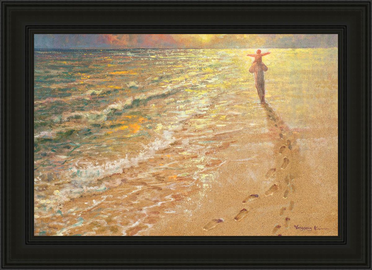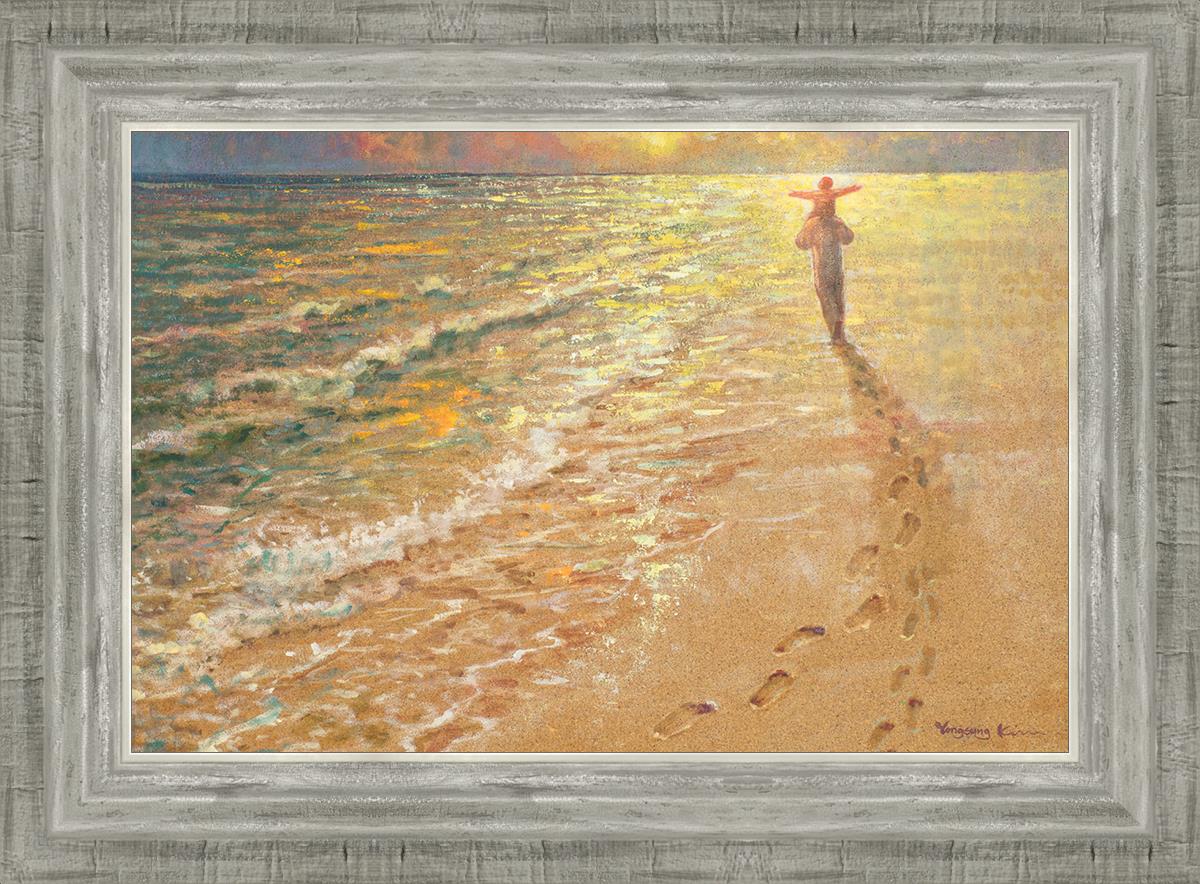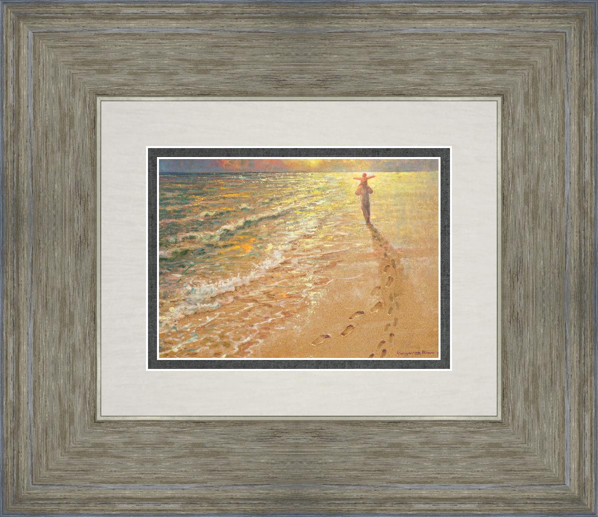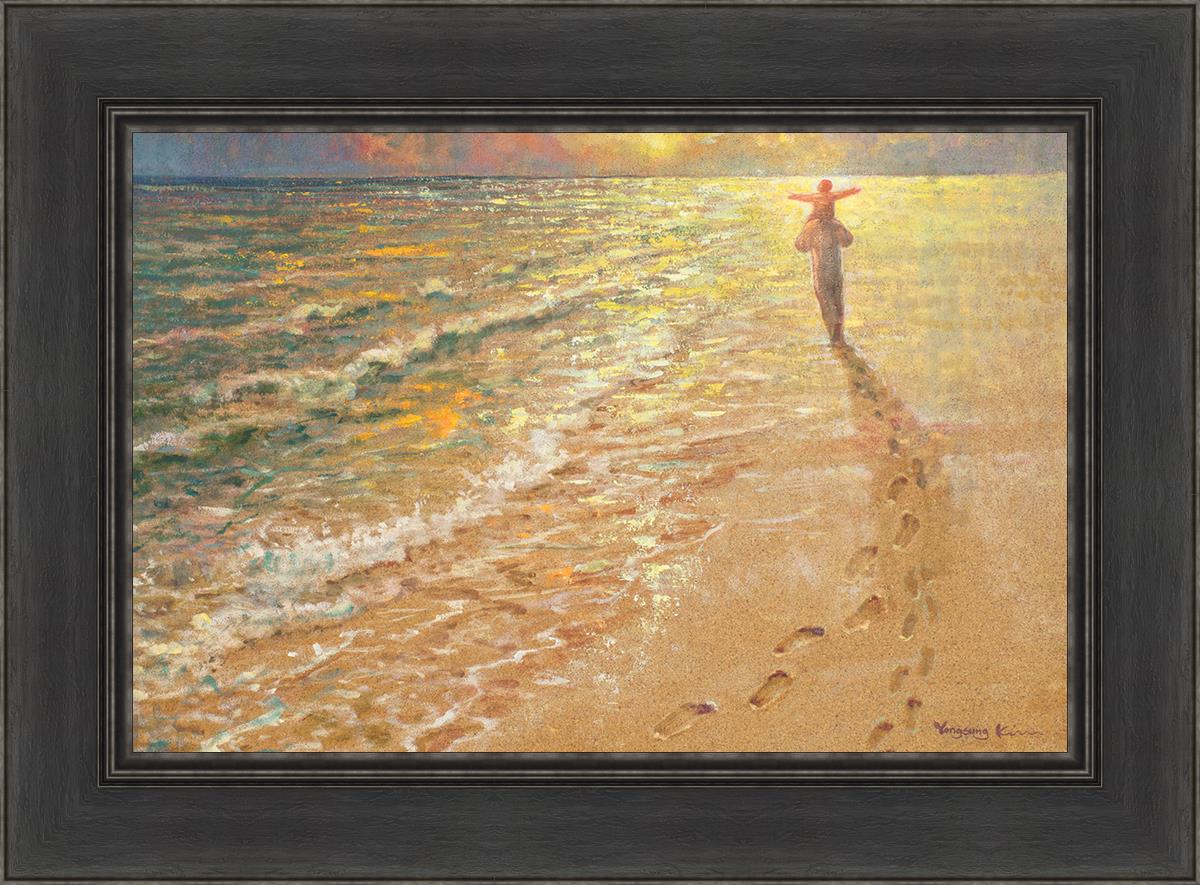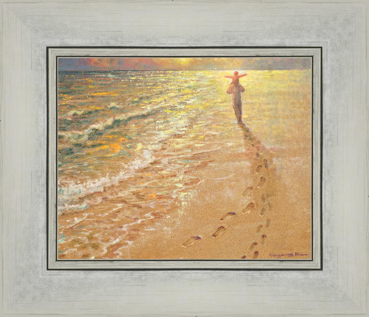 In this painting Jesus is seen walking along the beach, carrying a child on His shoulders. Their footprints are left behind in the sand, a visible testament to their journey together. As the scene unfolds, the footprints gradually fade until only Jesus’ footprints remain, illustrating the moment when He carries the child, offering comfort and protection. The soft, serene backdrop of the beach emphasizes the peace and safety found in Christ’s embrace. Footprints reflects on themes of divine support, trust, and the loving presence of Jesus, reminding viewers that, in times of struggle, He will carry us.