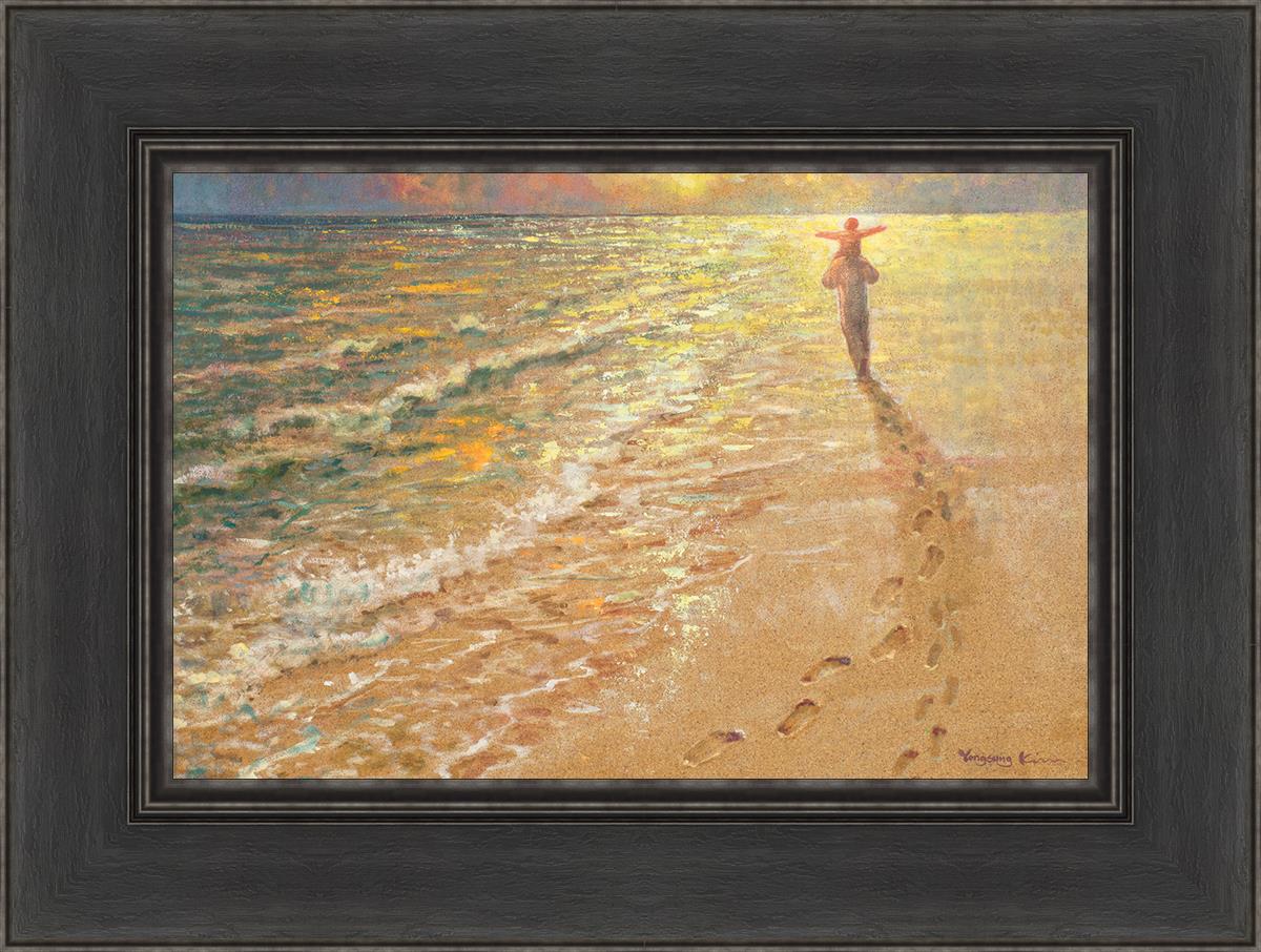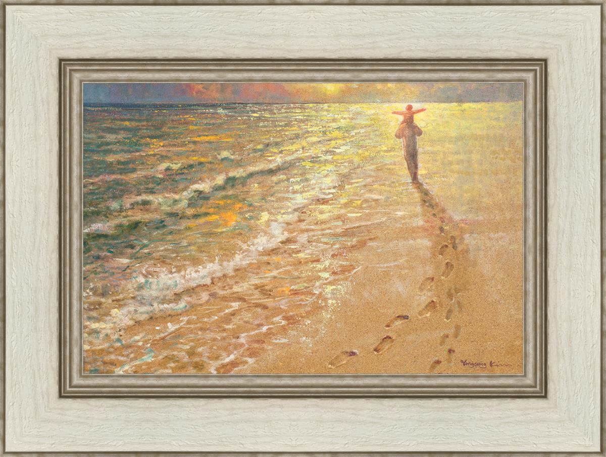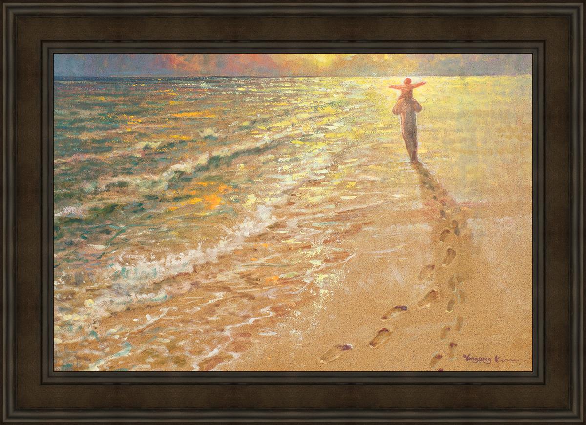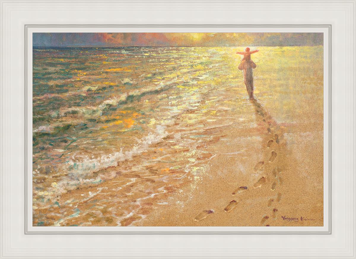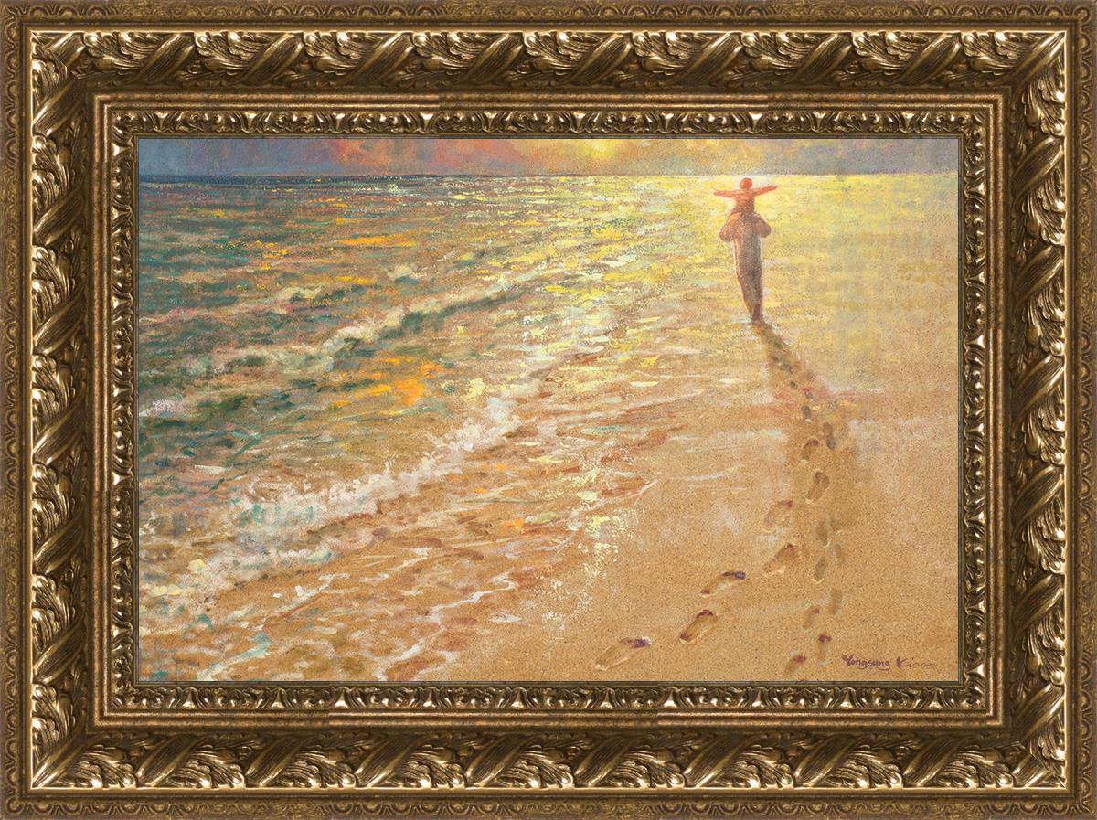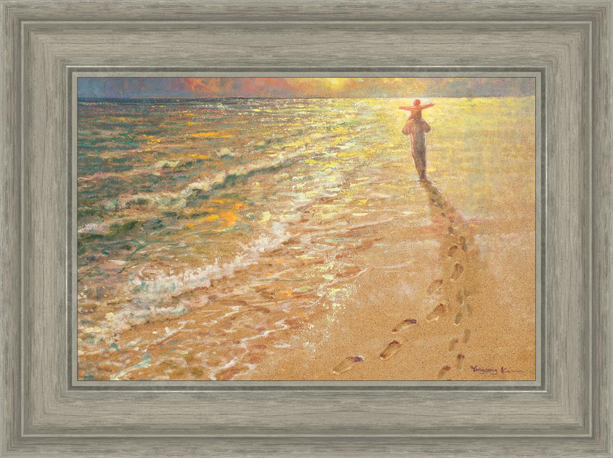 In this painting Jesus is seen walking along the beach, carrying a child on His shoulders. Their footprints are left behind in the sand, a visible testament to their journey together. As the scene unfolds, the footprints gradually fade until only Jesus’ footprints remain, illustrating the moment when He carries the child, offering comfort and protection. The soft, serene backdrop of the beach emphasizes the peace and safety found in Christ’s embrace. Footprints reflects on themes of divine support, trust, and the loving presence of Jesus, reminding viewers that, in times of struggle, He will carry us.