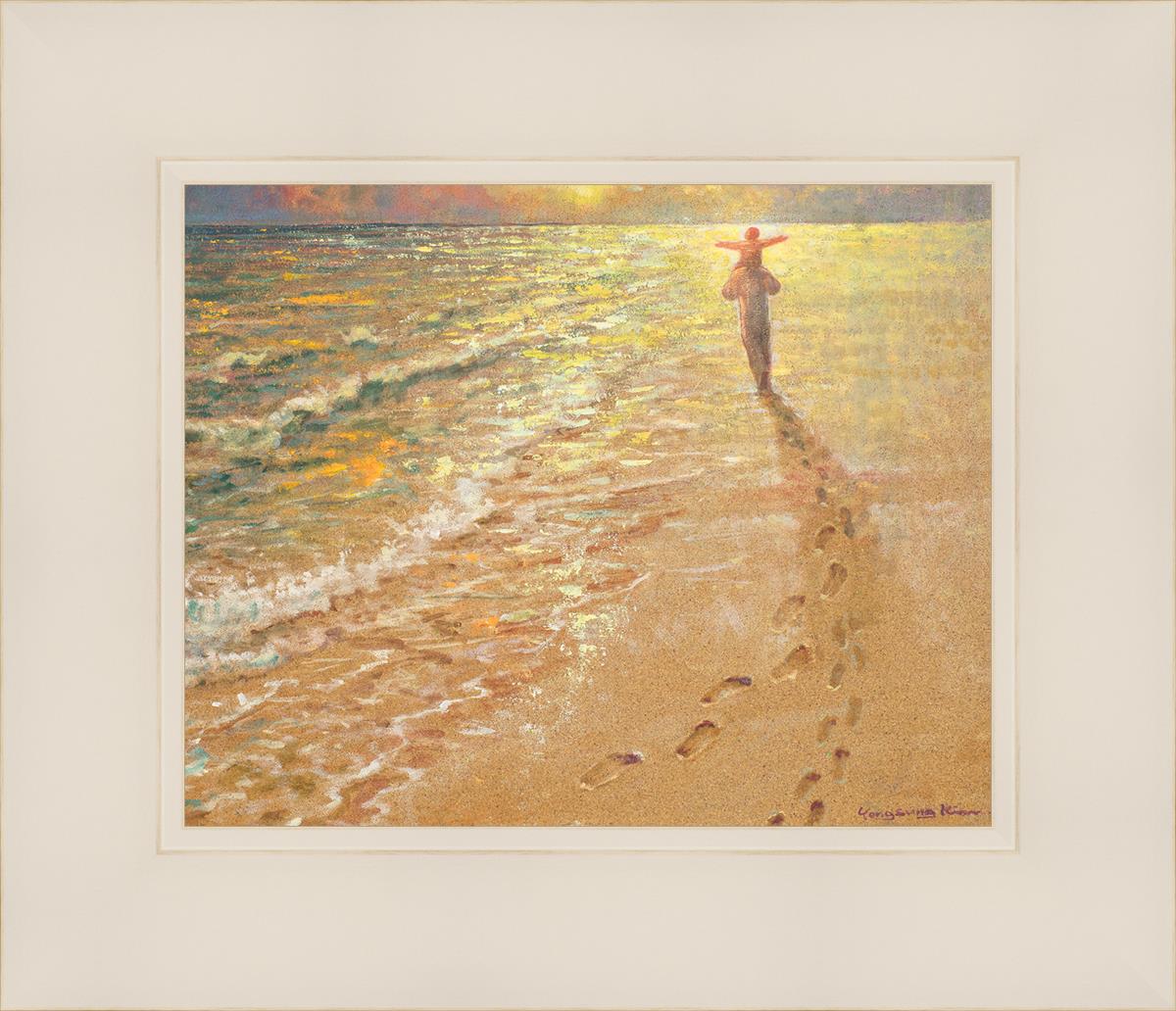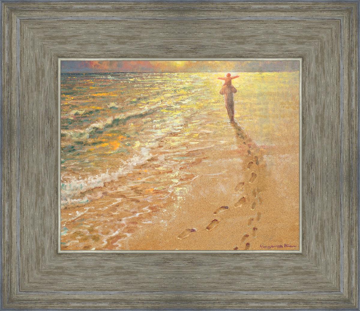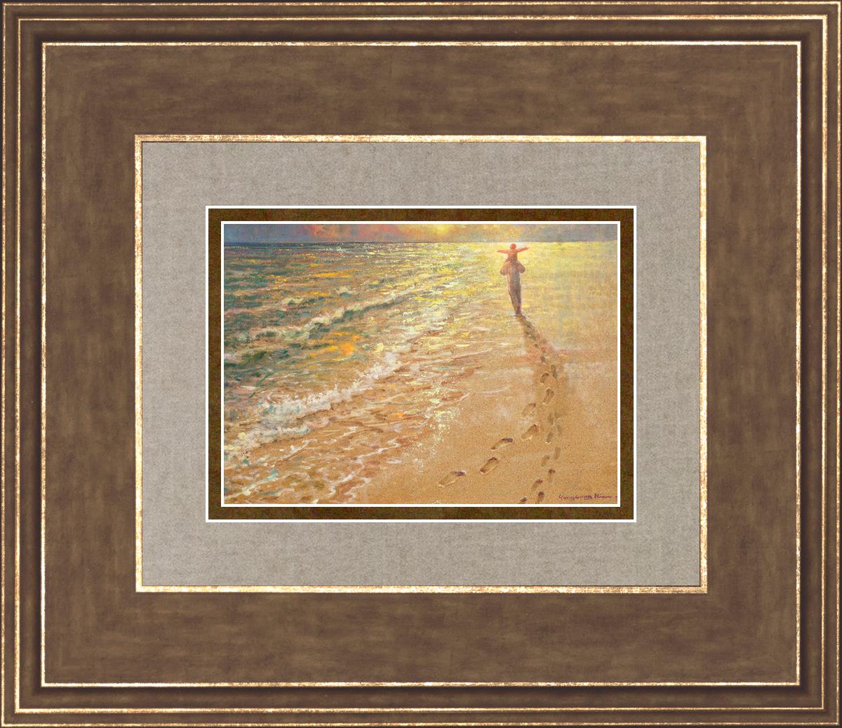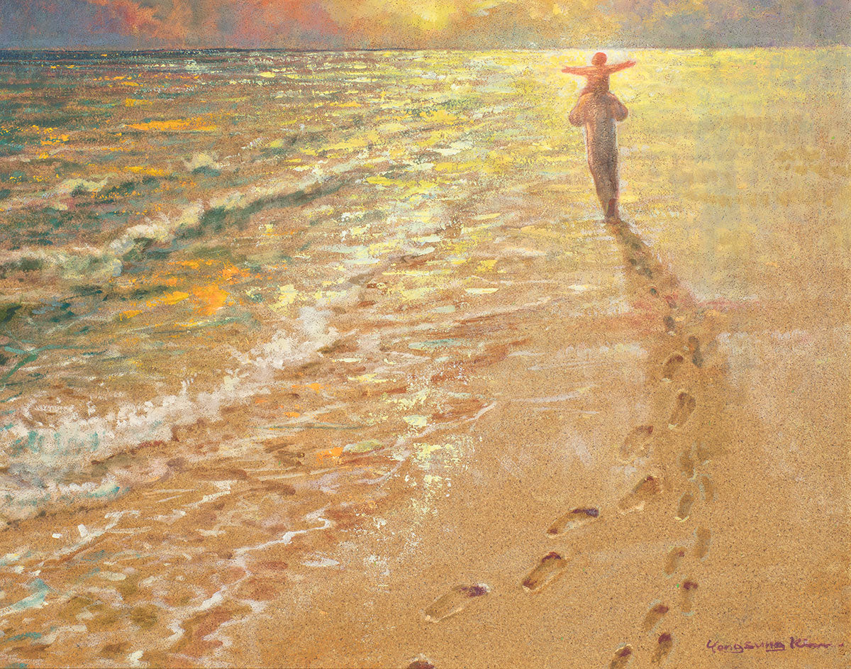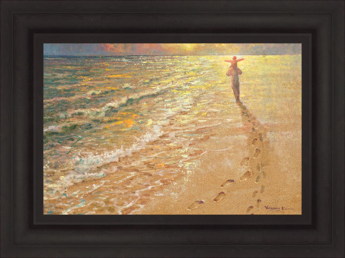 In this painting Jesus is seen walking along the beach, carrying a child on His shoulders. Their footprints are left behind in the sand, a visible testament to their journey together. As the scene unfolds, the footprints gradually fade until only Jesus’ footprints remain, illustrating the moment when He carries the child, offering comfort and protection. The soft, serene backdrop of the beach emphasizes the peace and safety found in Christ’s embrace. Footprints reflects on themes of divine support, trust, and the loving presence of Jesus, reminding viewers that, in times of struggle, He will carry us.