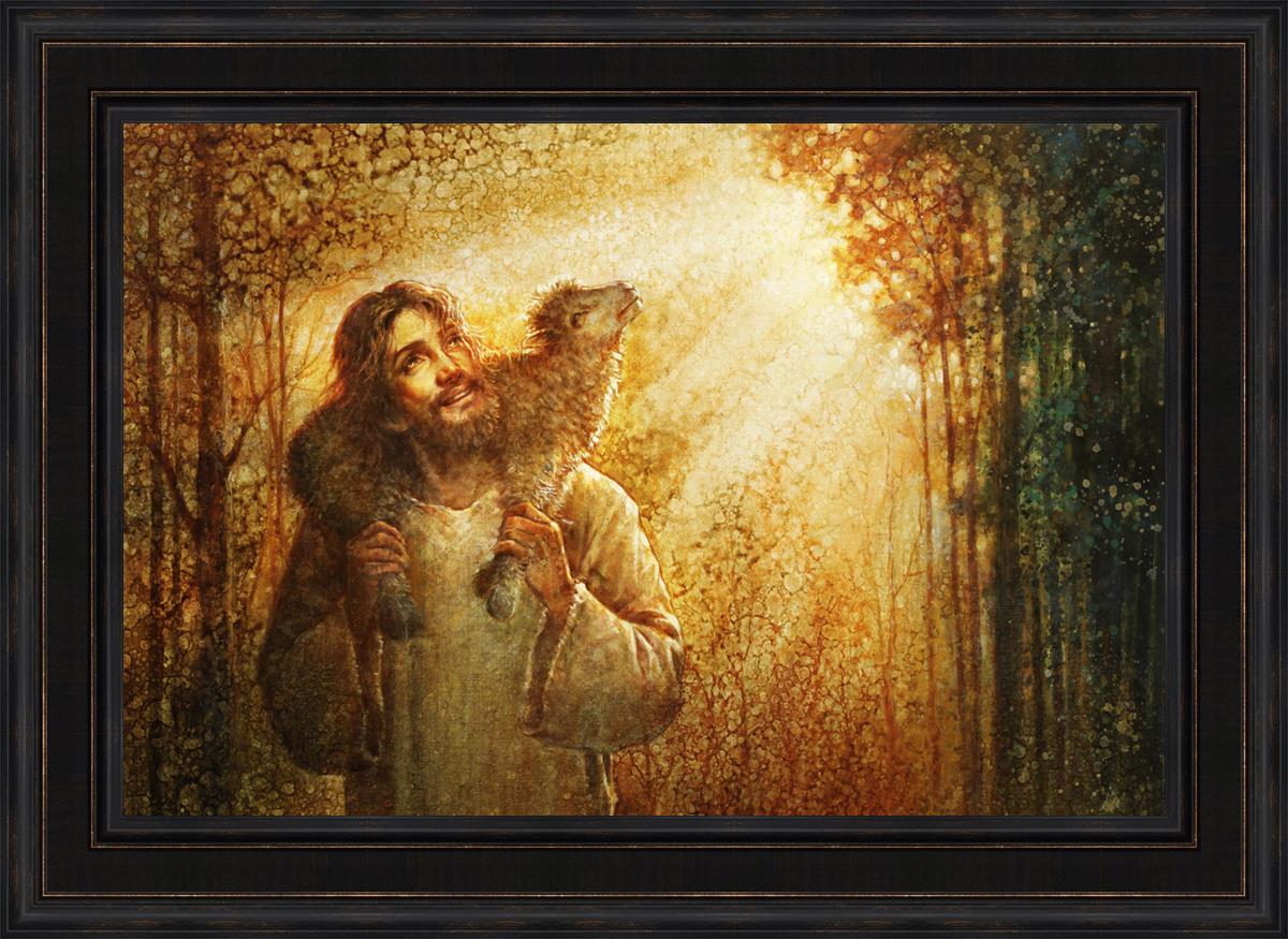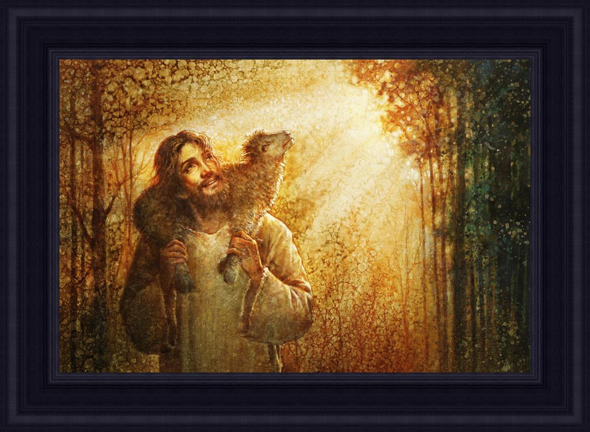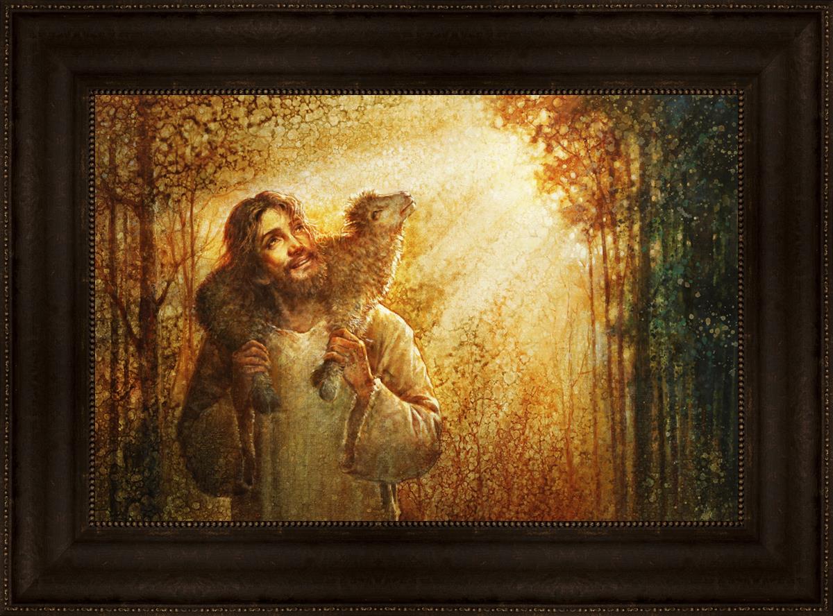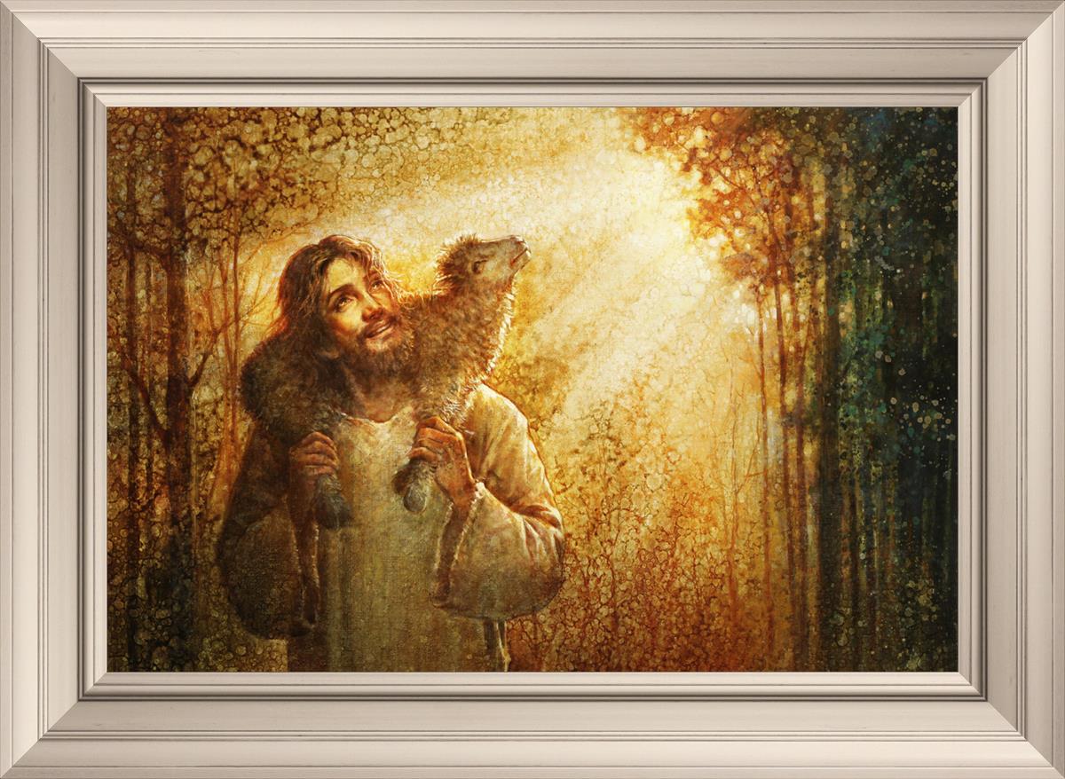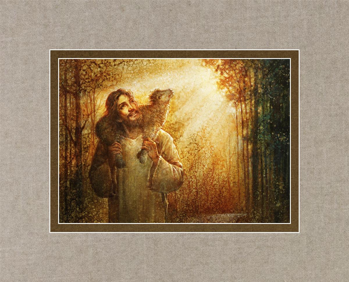 In this scene, Jesus is shown carrying a lamb on His shoulders, symbolizing His care and sacrifice for each individual. Gentle rays of sunlight filter through the branches of a grove of trees, casting a peaceful glow. Good Shepherd speaks of both strength and tenderness, reminding us that Jesus not only guides and protects but also carries us in our moments of weakness and need.