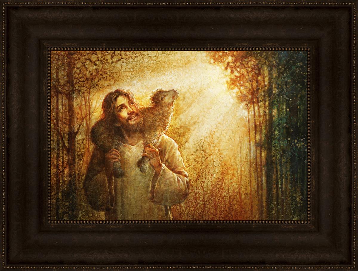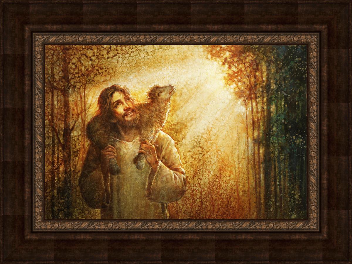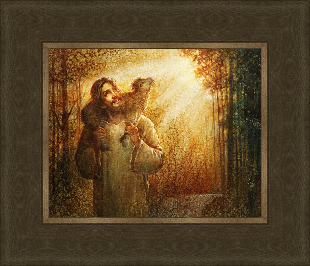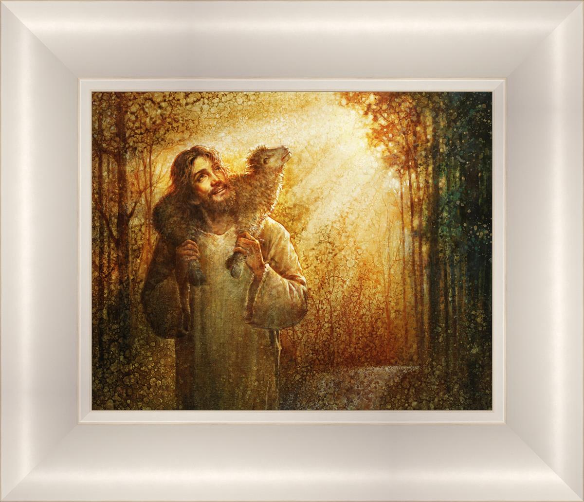 In this scene, Jesus is shown carrying a lamb on His shoulders, symbolizing His care and sacrifice for each individual. Gentle rays of sunlight filter through the branches of a grove of trees, casting a peaceful glow. Good Shepherd speaks of both strength and tenderness, reminding us that Jesus not only guides and protects but also carries us in our moments of weakness and need.