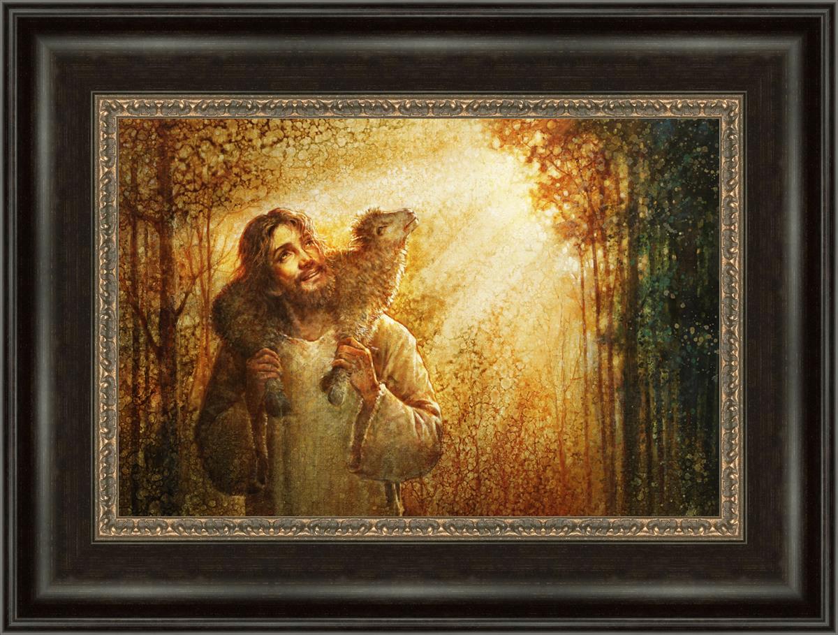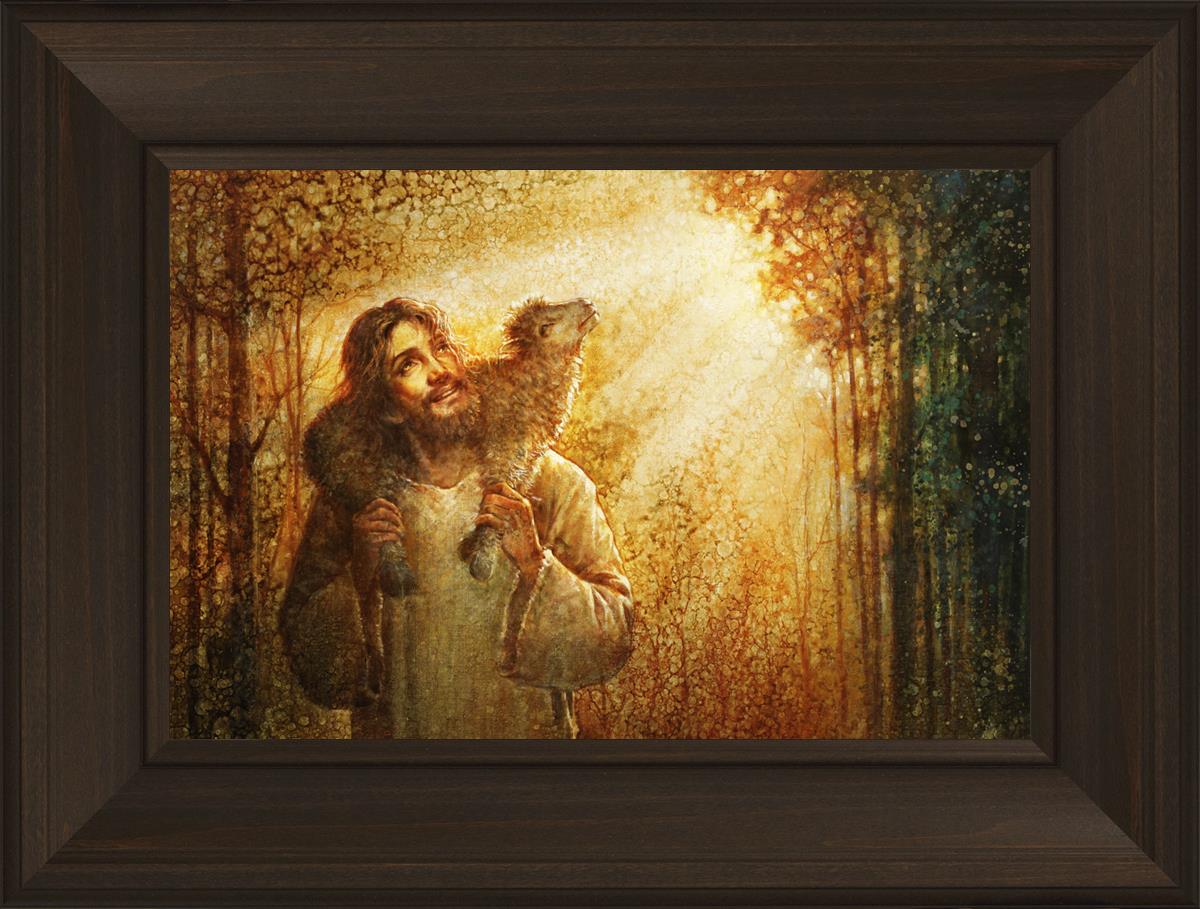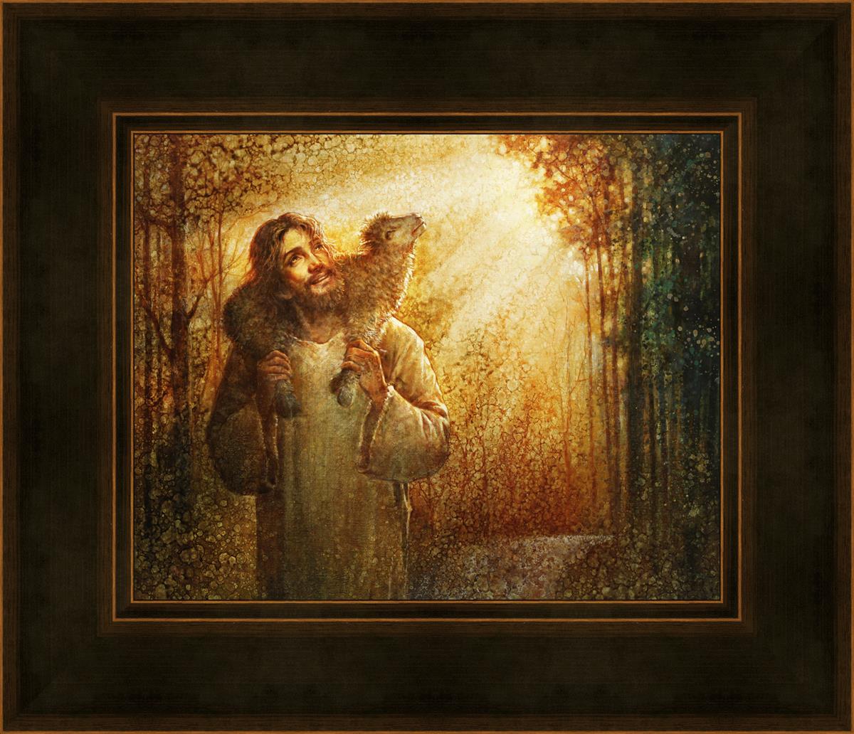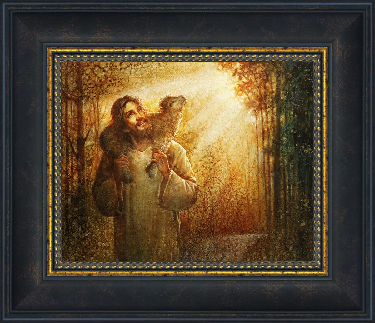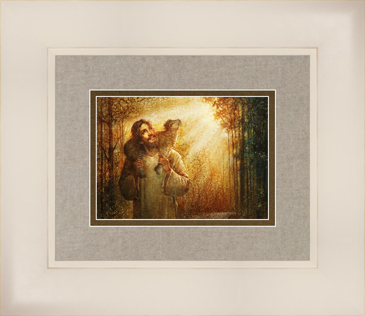 In this scene, Jesus is shown carrying a lamb on His shoulders, symbolizing His care and sacrifice for each individual. Gentle rays of sunlight filter through the branches of a grove of trees, casting a peaceful glow. Good Shepherd speaks of both strength and tenderness, reminding us that Jesus not only guides and protects but also carries us in our moments of weakness and need.