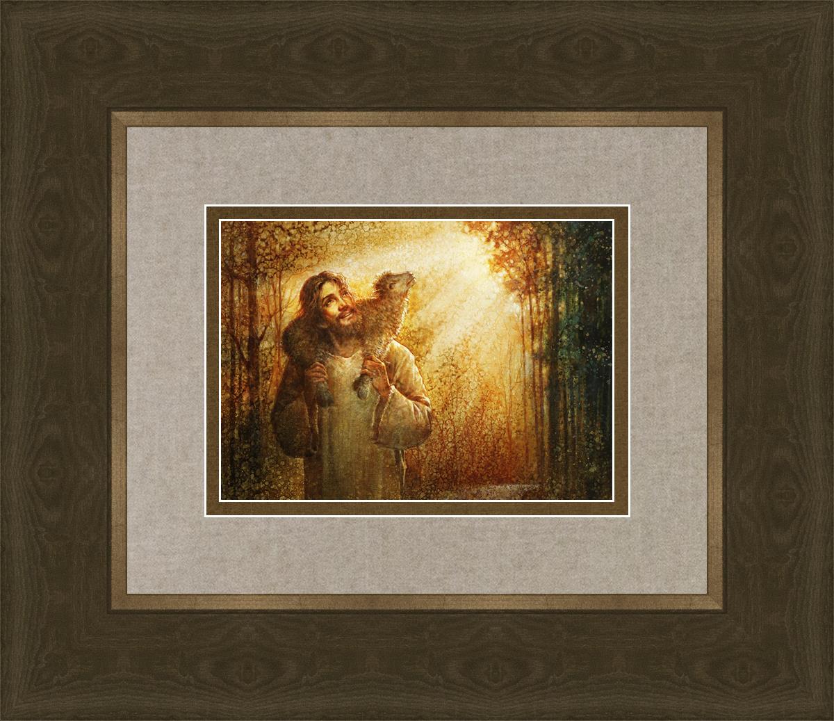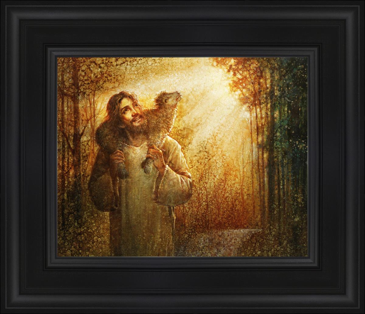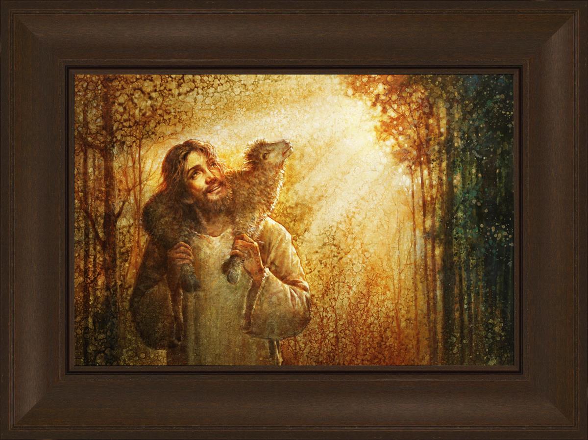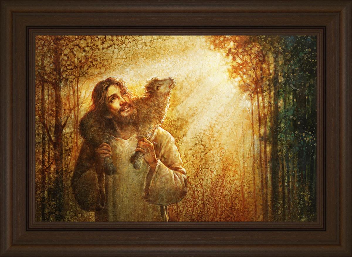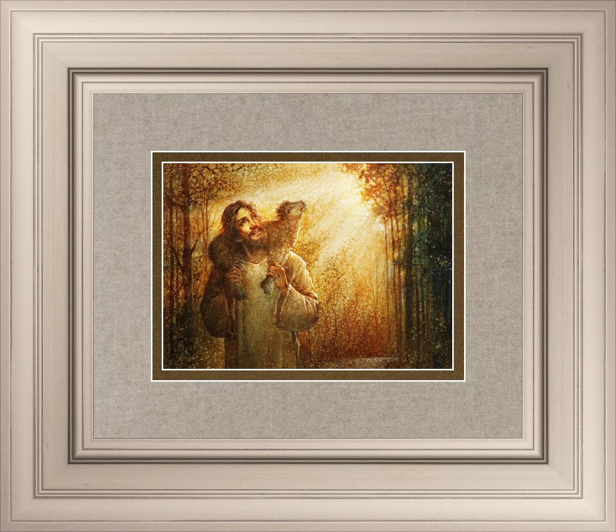 In this scene, Jesus is shown carrying a lamb on His shoulders, symbolizing His care and sacrifice for each individual. Gentle rays of sunlight filter through the branches of a grove of trees, casting a peaceful glow. Good Shepherd speaks of both strength and tenderness, reminding us that Jesus not only guides and protects but also carries us in our moments of weakness and need.