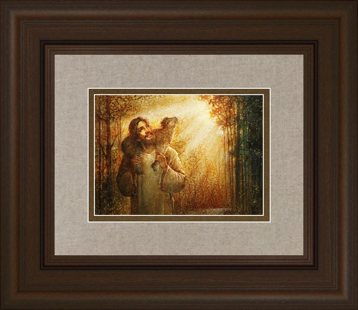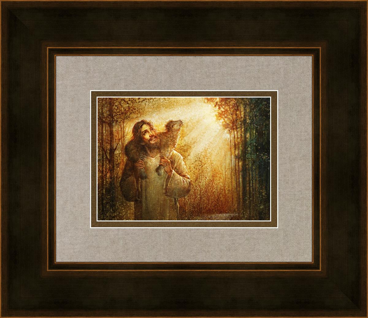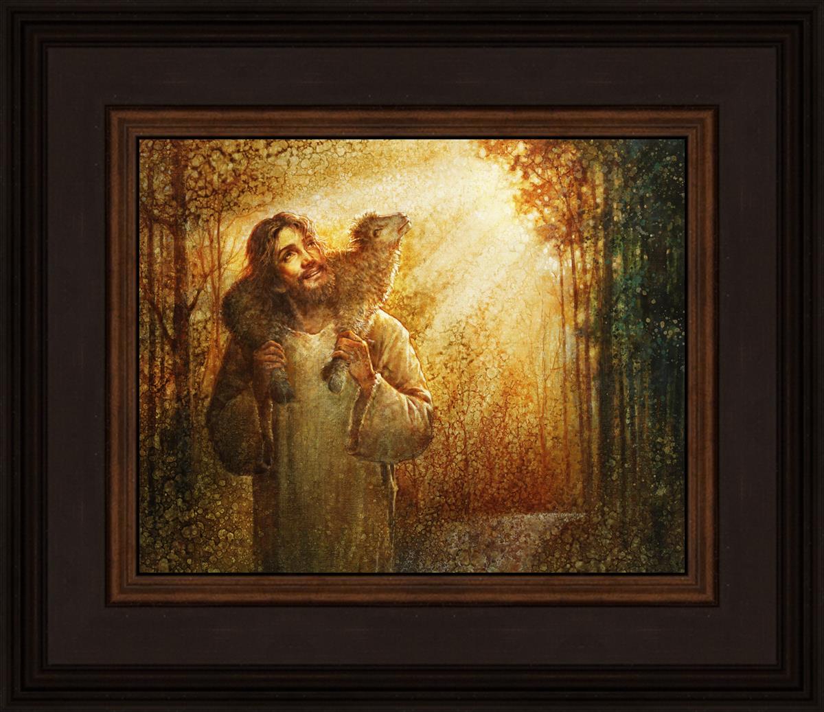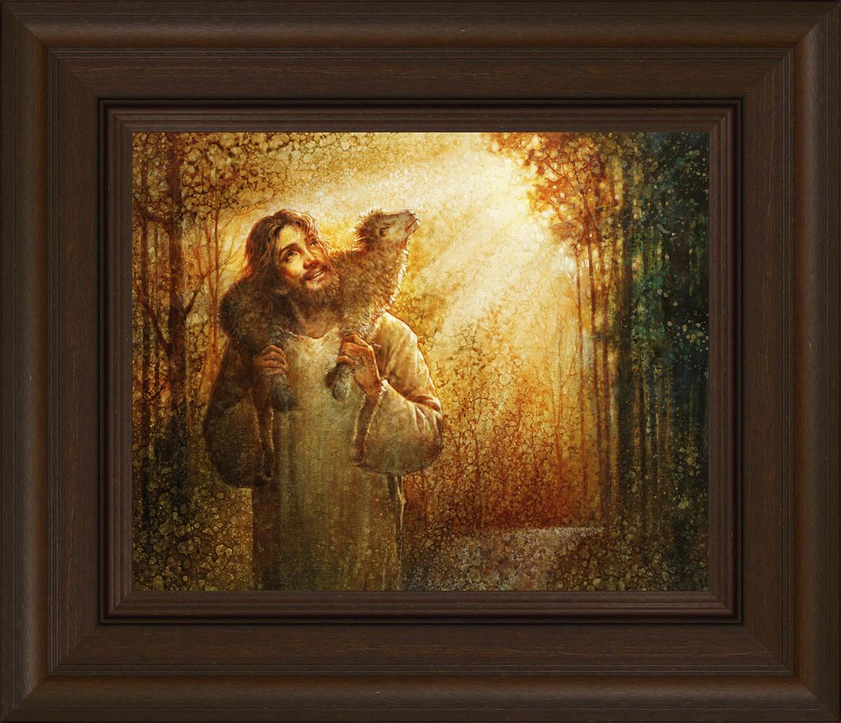 In this scene, Jesus is shown carrying a lamb on His shoulders, symbolizing His care and sacrifice for each individual. Gentle rays of sunlight filter through the branches of a grove of trees, casting a peaceful glow. Good Shepherd speaks of both strength and tenderness, reminding us that Jesus not only guides and protects but also carries us in our moments of weakness and need.