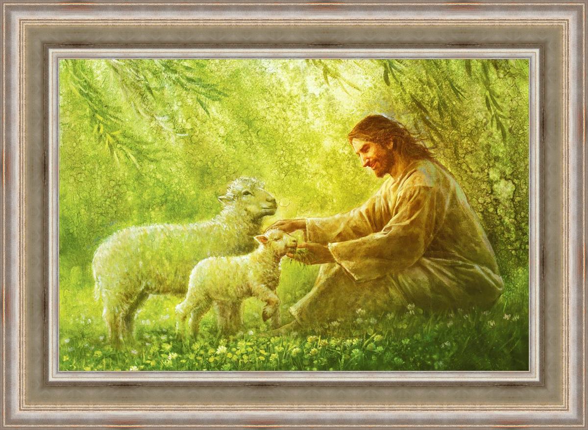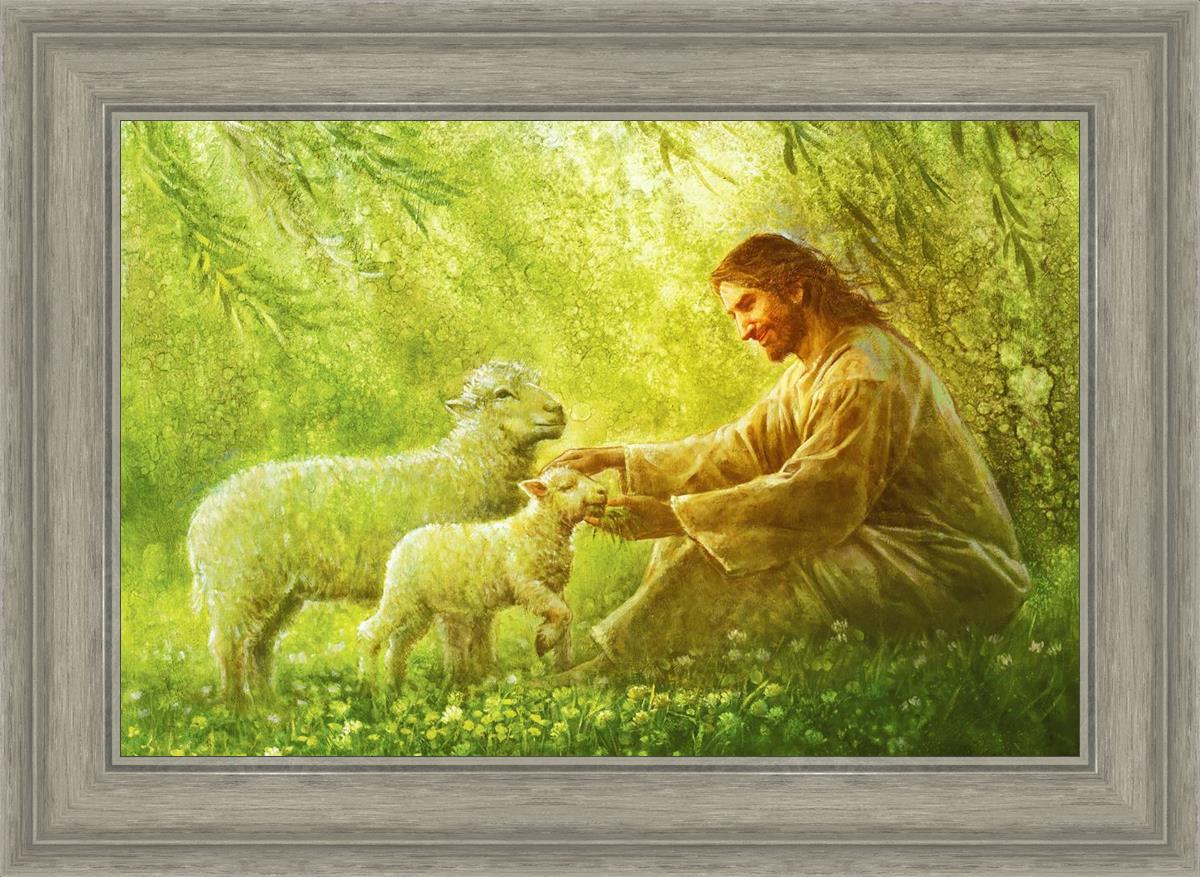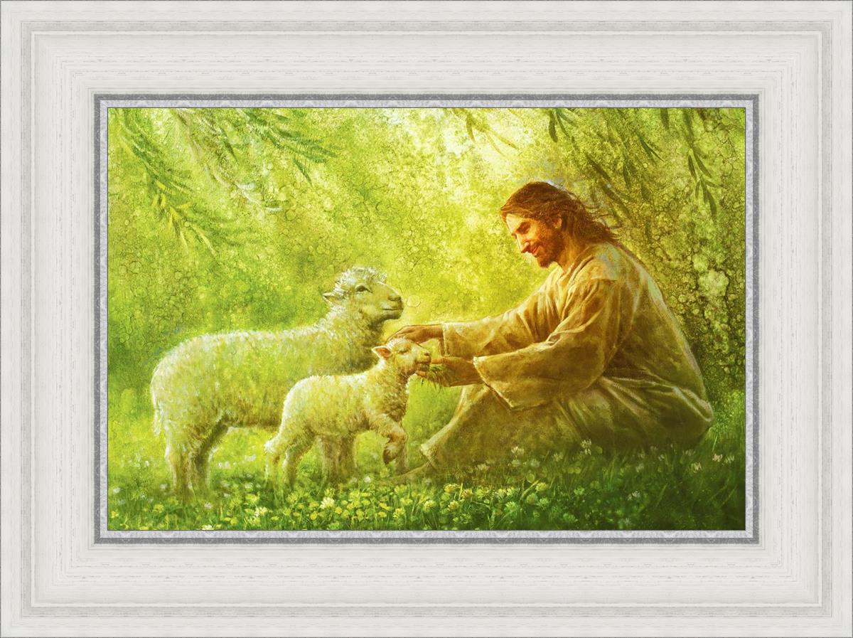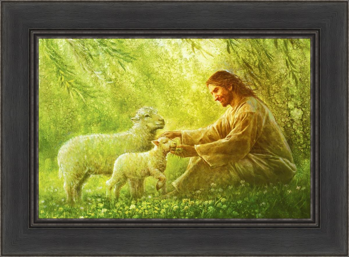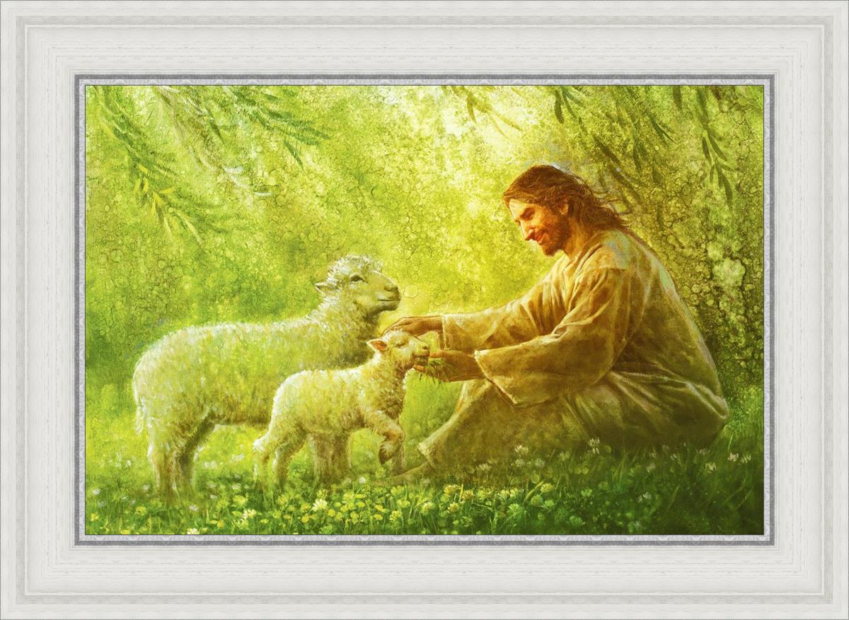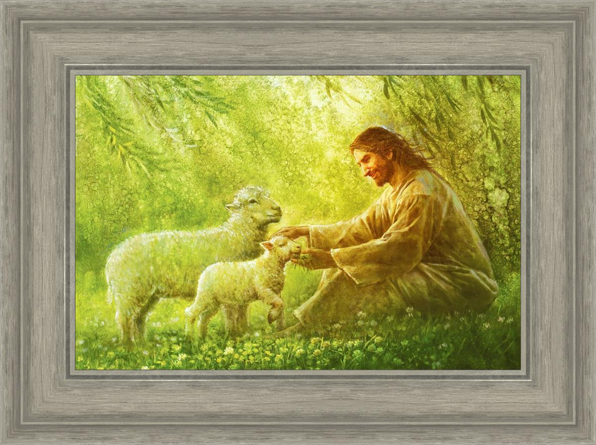 This painting depicts Jesus Christ sitting in the shade of a green willow tree, with a lamb and a sheep nestled close to Him, symbolizing His tender care and protection. Green Pastures reminds us of the timeless message of Psalm 23, reminding us that with Jesus as our Shepherd, we find rest, safety, and solace in His loving embrace.