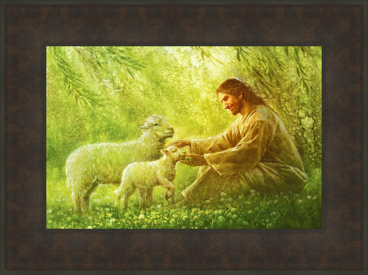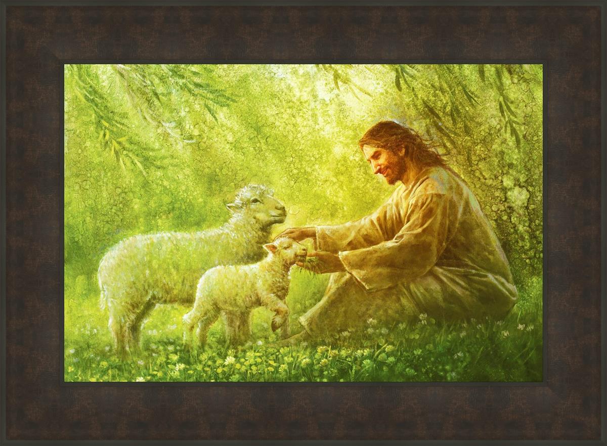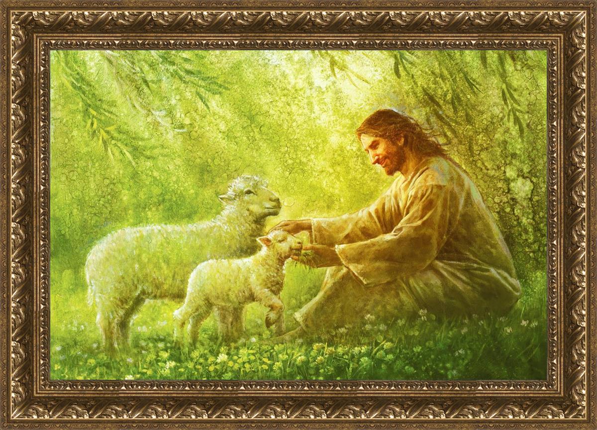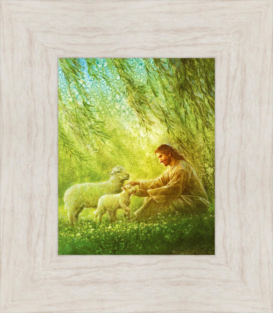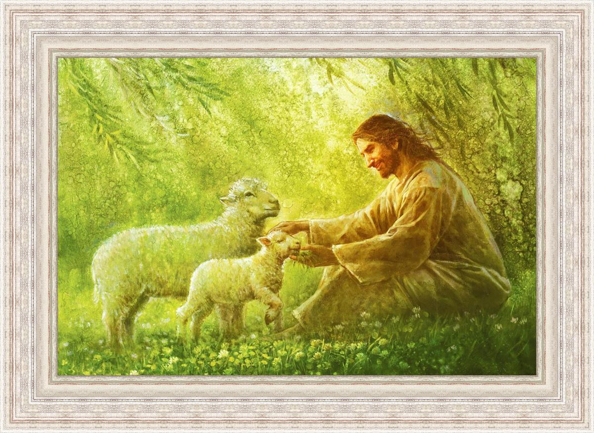 This painting depicts Jesus Christ sitting in the shade of a green willow tree, with a lamb and a sheep nestled close to Him, symbolizing His tender care and protection. Green Pastures reminds us of the timeless message of Psalm 23, reminding us that with Jesus as our Shepherd, we find rest, safety, and solace in His loving embrace.