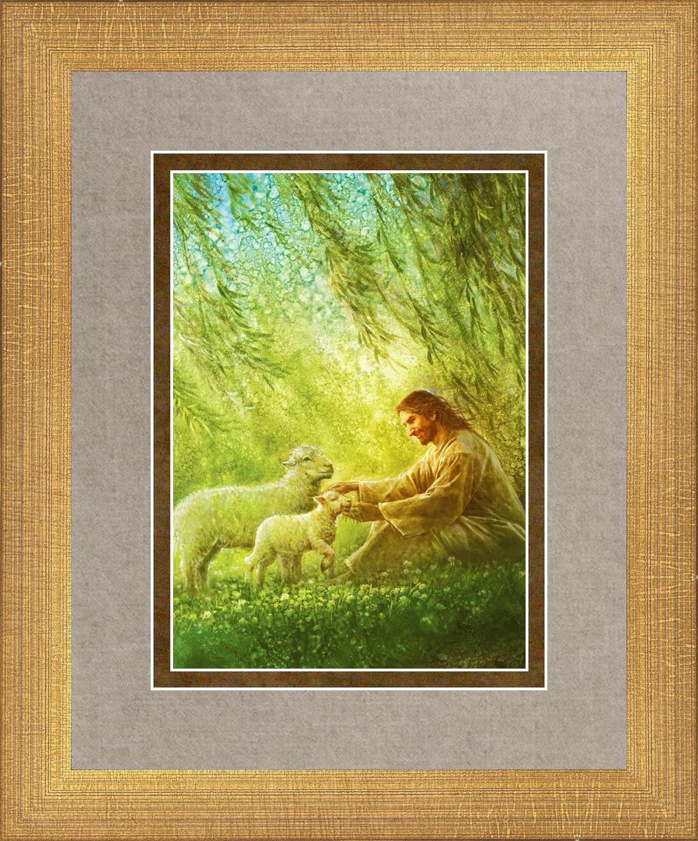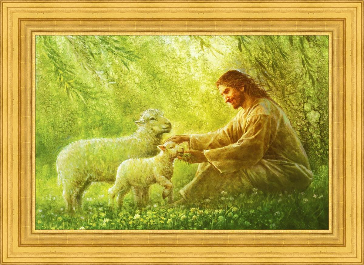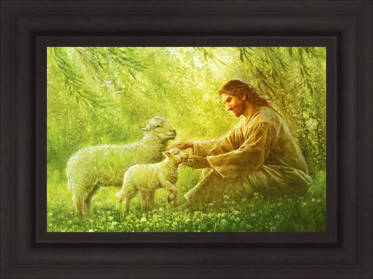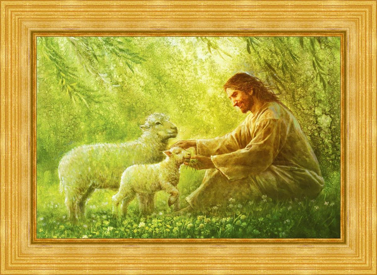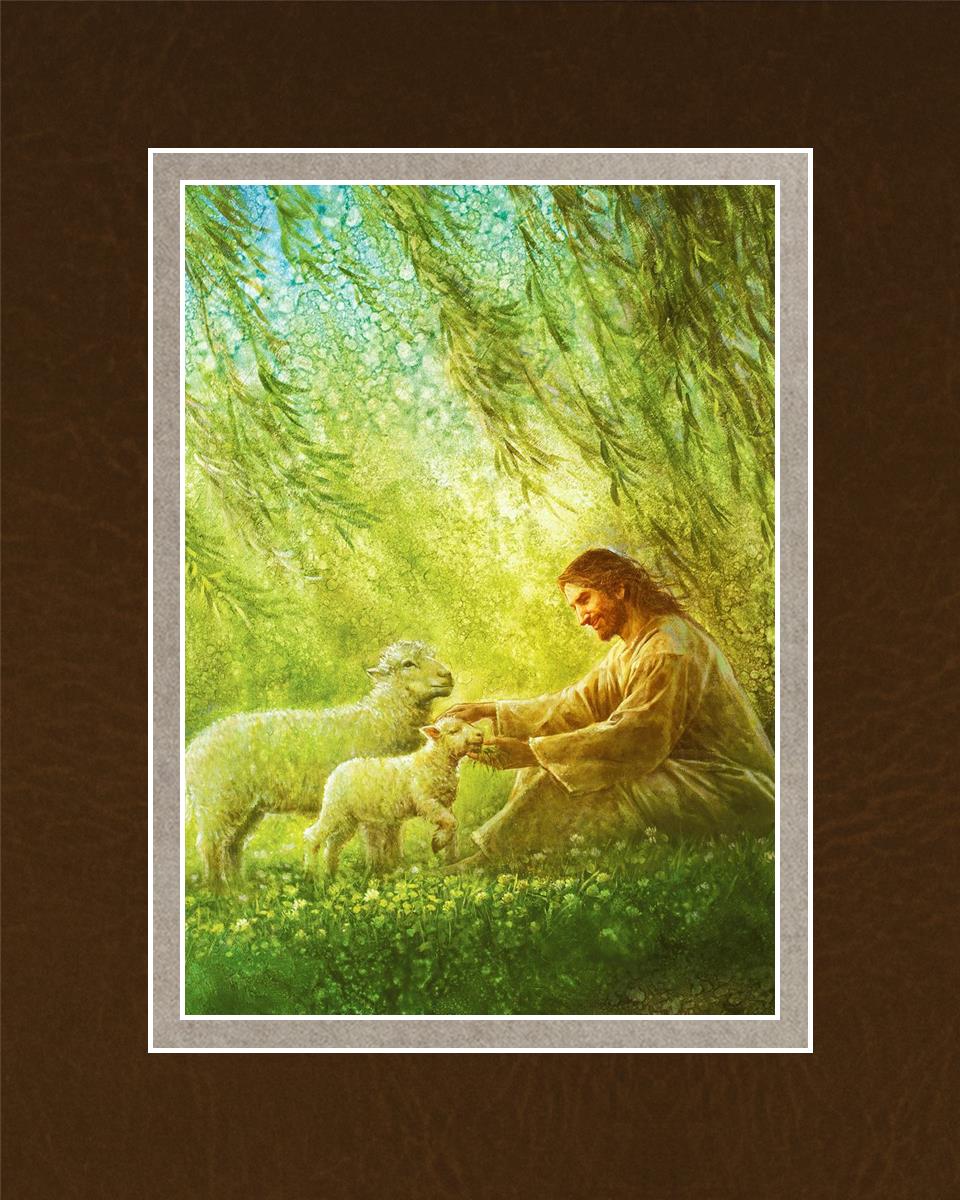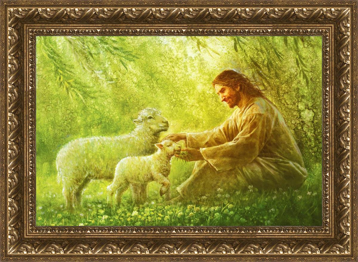 This painting depicts Jesus Christ sitting in the shade of a green willow tree, with a lamb and a sheep nestled close to Him, symbolizing His tender care and protection. Green Pastures reminds us of the timeless message of Psalm 23, reminding us that with Jesus as our Shepherd, we find rest, safety, and solace in His loving embrace.