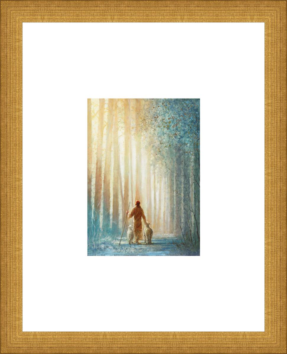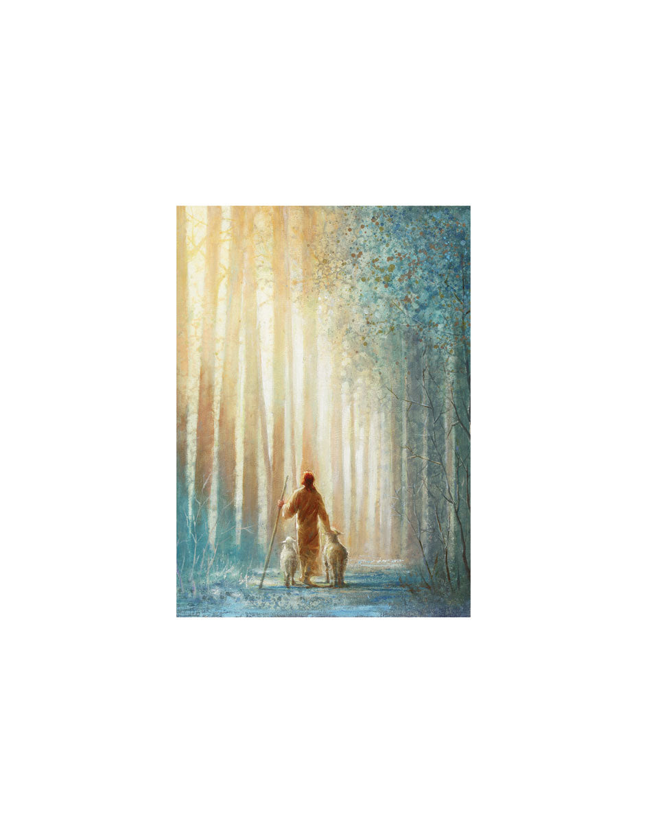 This painting draws inspiration from John 10, where we learn that the sheep know their shepherd, who leads them to safe pastures and keeps them protected. This artwork portrays Jesus walking along a path with two of His sheep, reminding us that Christ walks with us, leading us through life’s storms. Like a loving friend, He shepherds us toward the fullness of life.