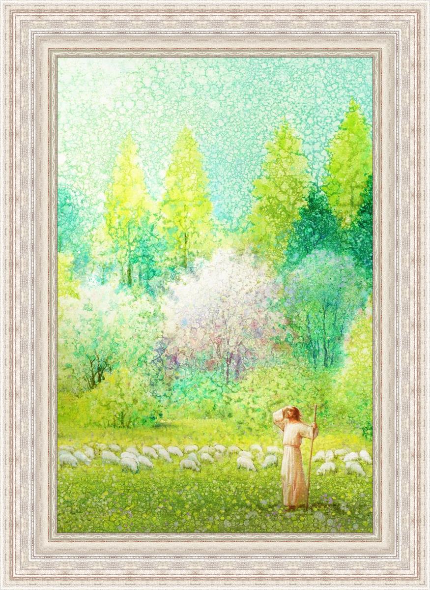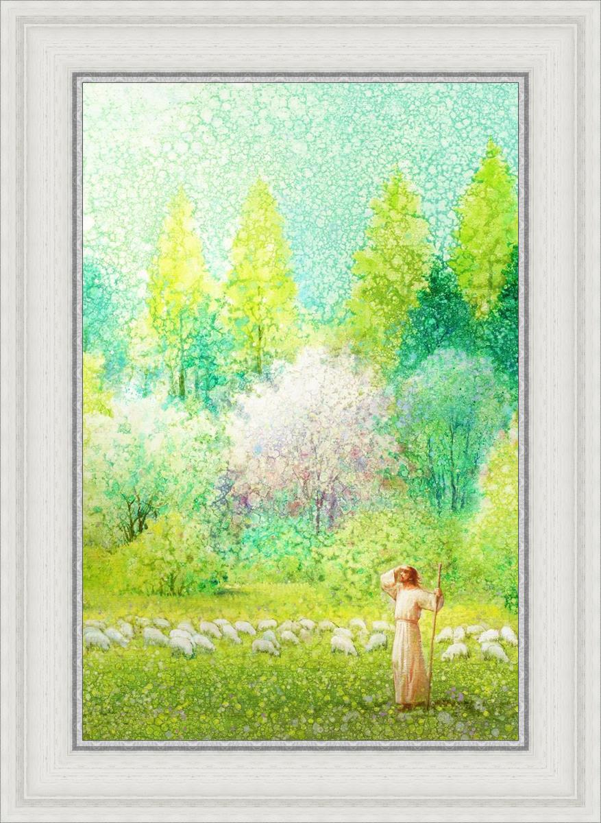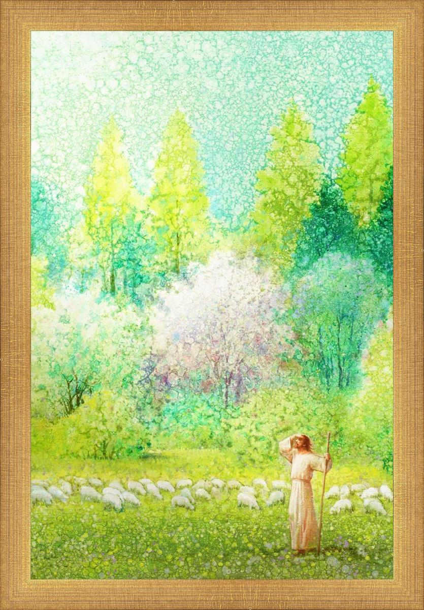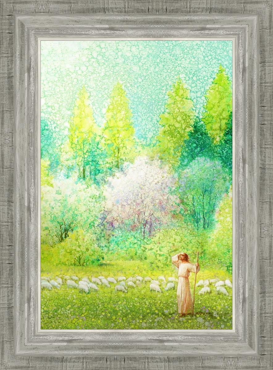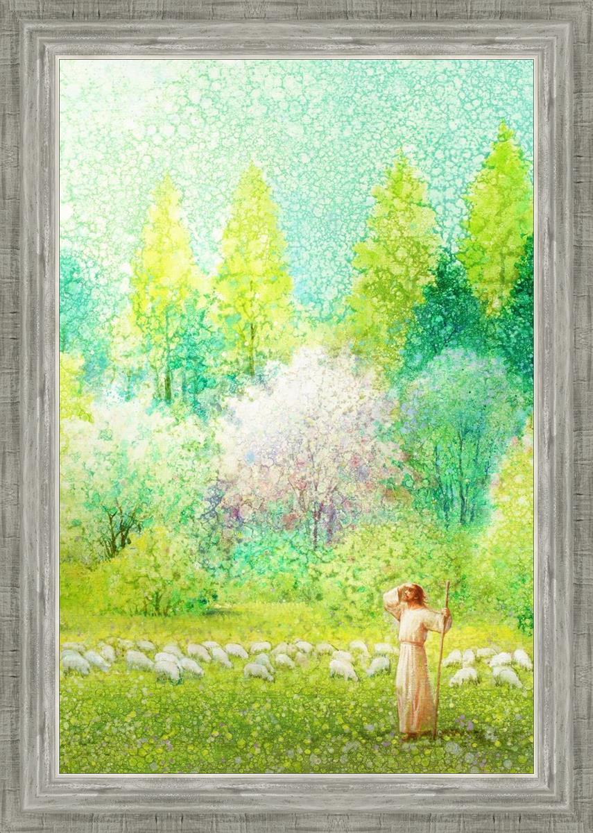 In this artwork, Jesus Christ stands tall in the midst of a lush green field, His hand shielding His eyes from the brilliance of the sun, as if carefully surveying the landscape. With His staff in hand, He exudes a sense of gentle authority and leadership, guiding those who follow Him. The surrounding flock of sheep symbolize the faithful, with the peaceful field serving as a representation of spiritual growth and the promise of safety. He Shall Find What is Lost reminds us of hope, divine care, and the unending search for what is lost, bringing a powerful sense of comfort and assurance.