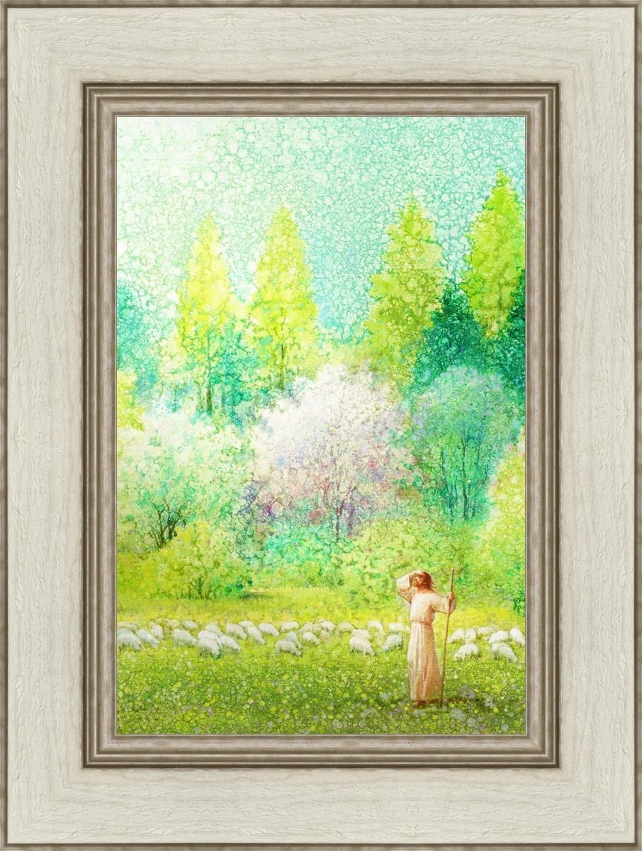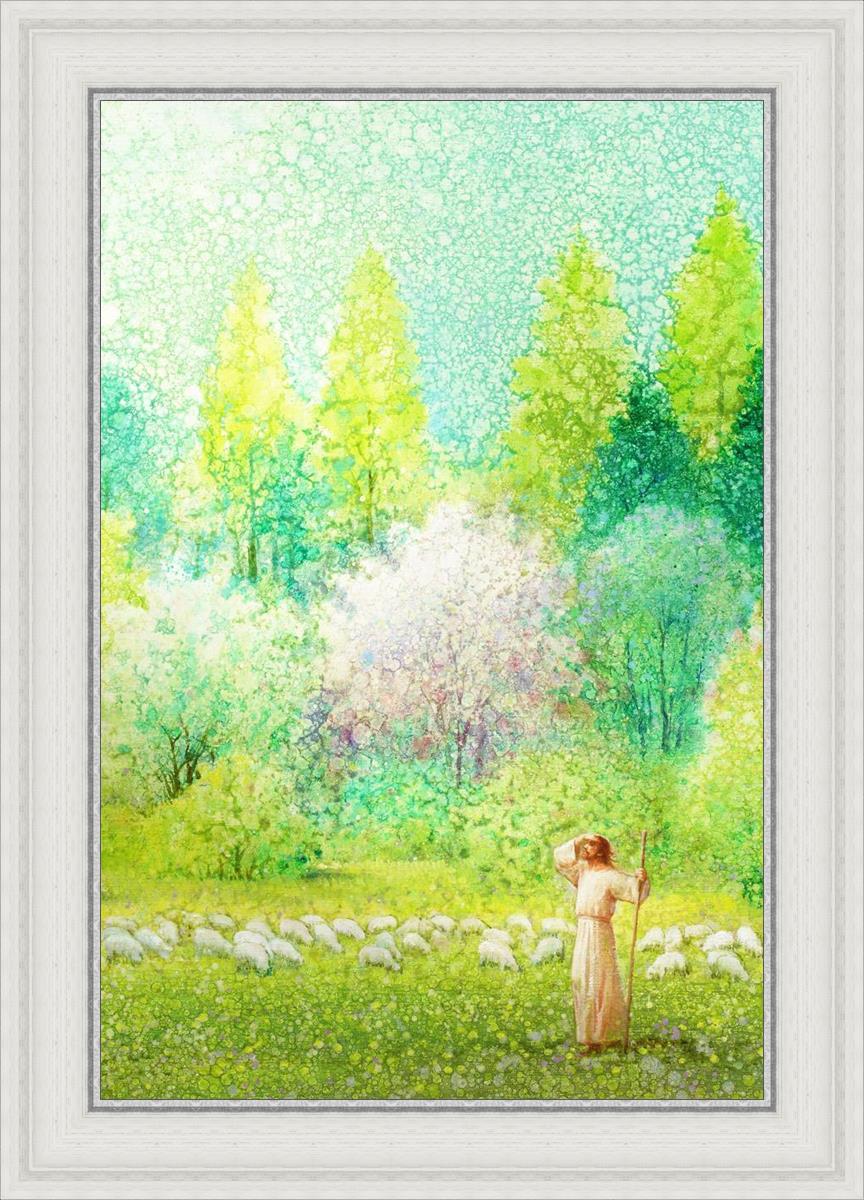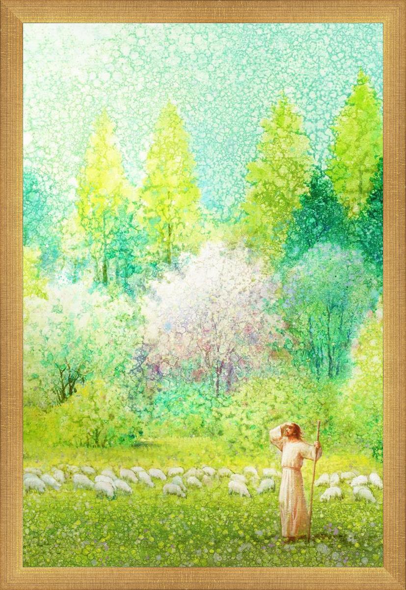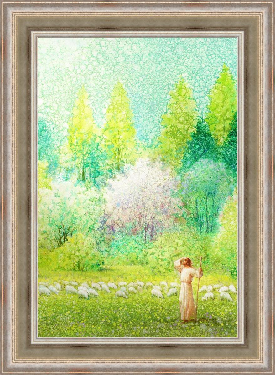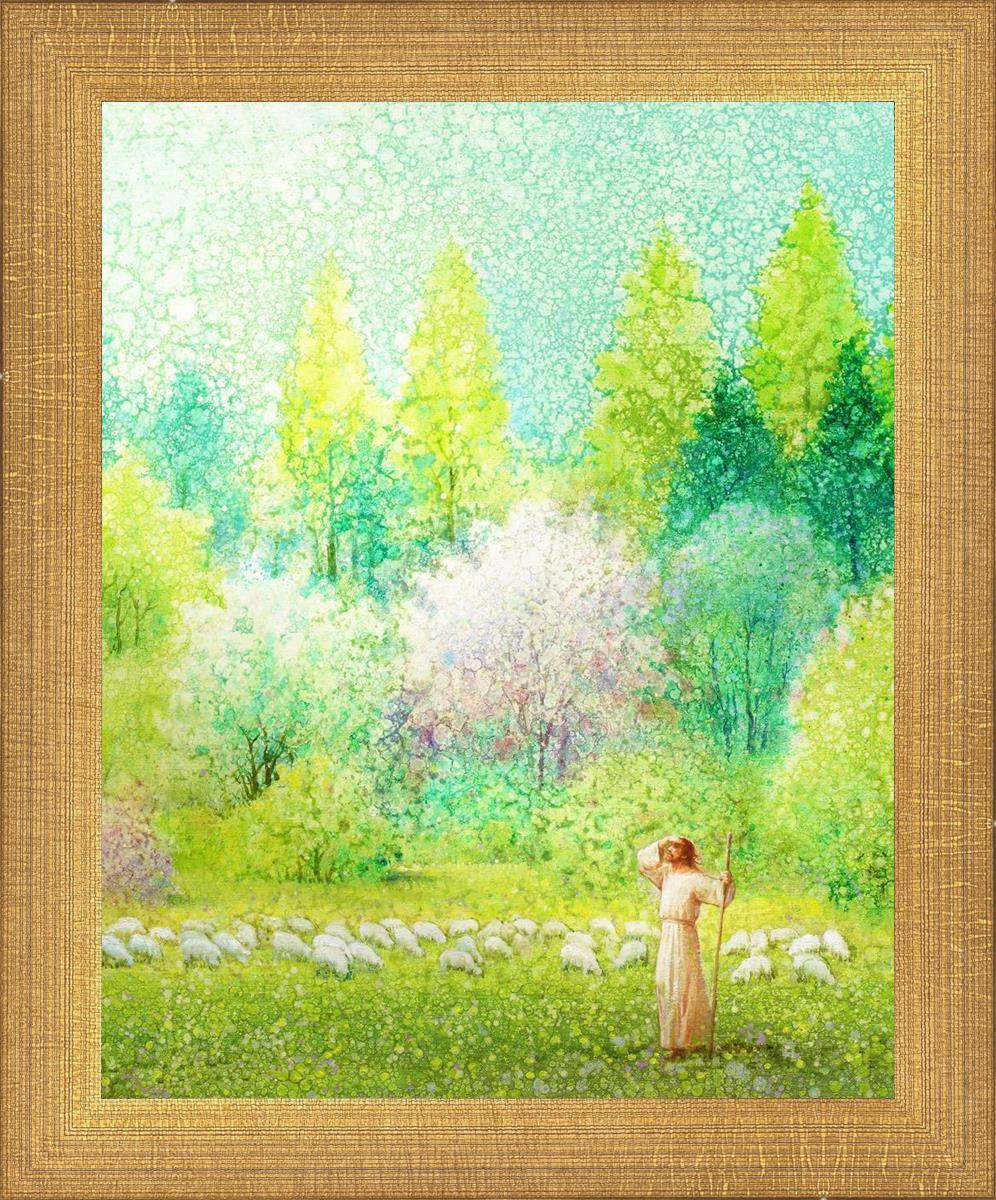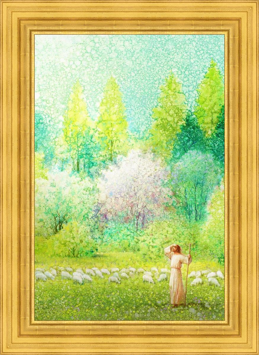 In this artwork, Jesus Christ stands tall in the midst of a lush green field, His hand shielding His eyes from the brilliance of the sun, as if carefully surveying the landscape. With His staff in hand, He exudes a sense of gentle authority and leadership, guiding those who follow Him. The surrounding flock of sheep symbolize the faithful, with the peaceful field serving as a representation of spiritual growth and the promise of safety. He Shall Find What is Lost reminds us of hope, divine care, and the unending search for what is lost, bringing a powerful sense of comfort and assurance.