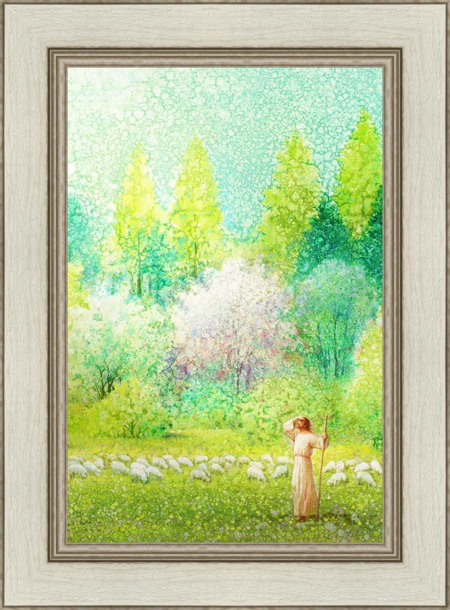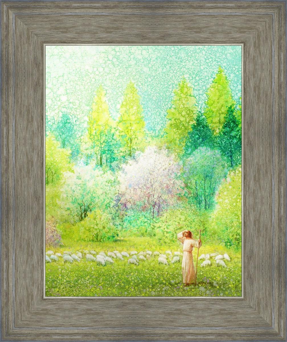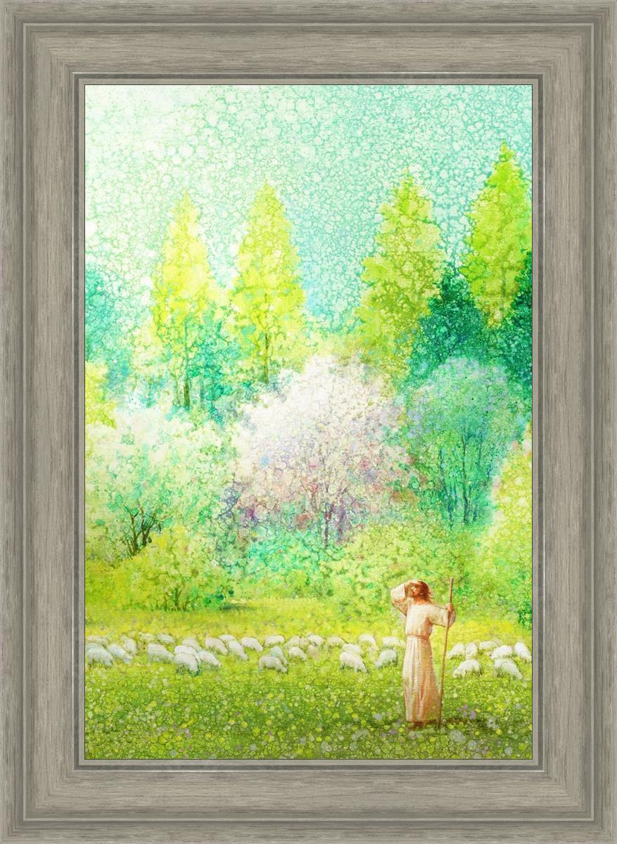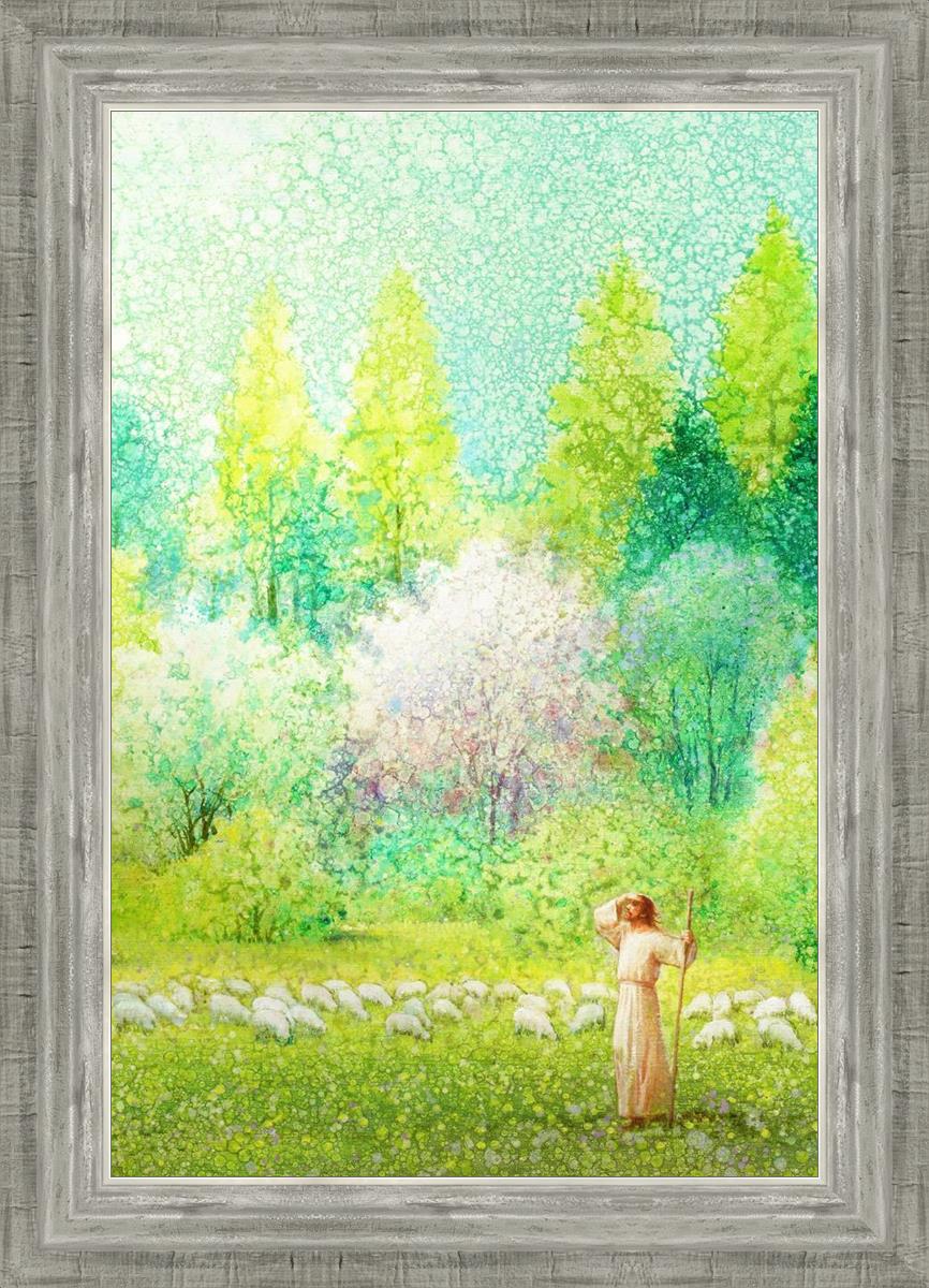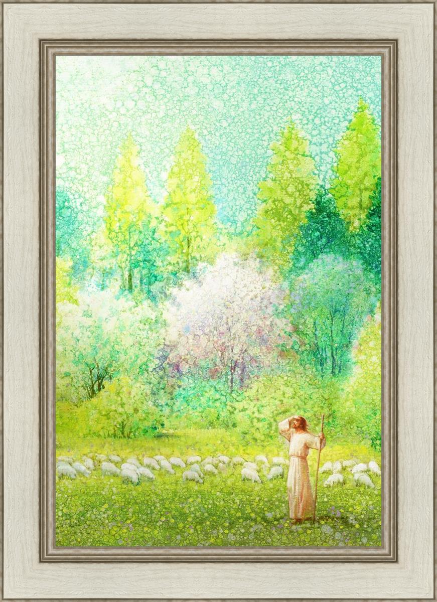 In this artwork, Jesus Christ stands tall in the midst of a lush green field, His hand shielding His eyes from the brilliance of the sun, as if carefully surveying the landscape. With His staff in hand, He exudes a sense of gentle authority and leadership, guiding those who follow Him. The surrounding flock of sheep symbolize the faithful, with the peaceful field serving as a representation of spiritual growth and the promise of safety. He Shall Find What is Lost reminds us of hope, divine care, and the unending search for what is lost, bringing a powerful sense of comfort and assurance.