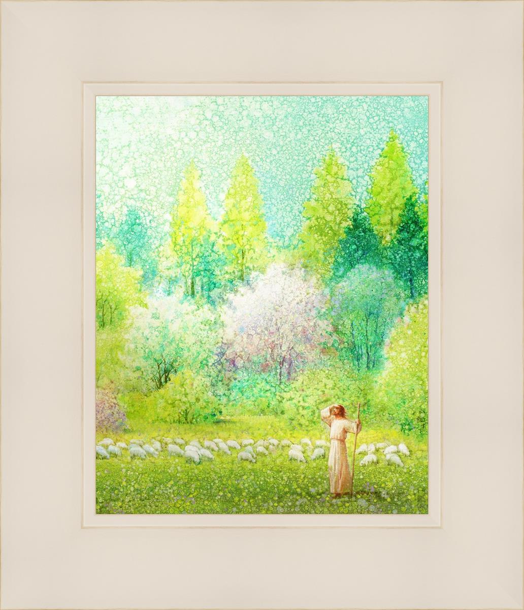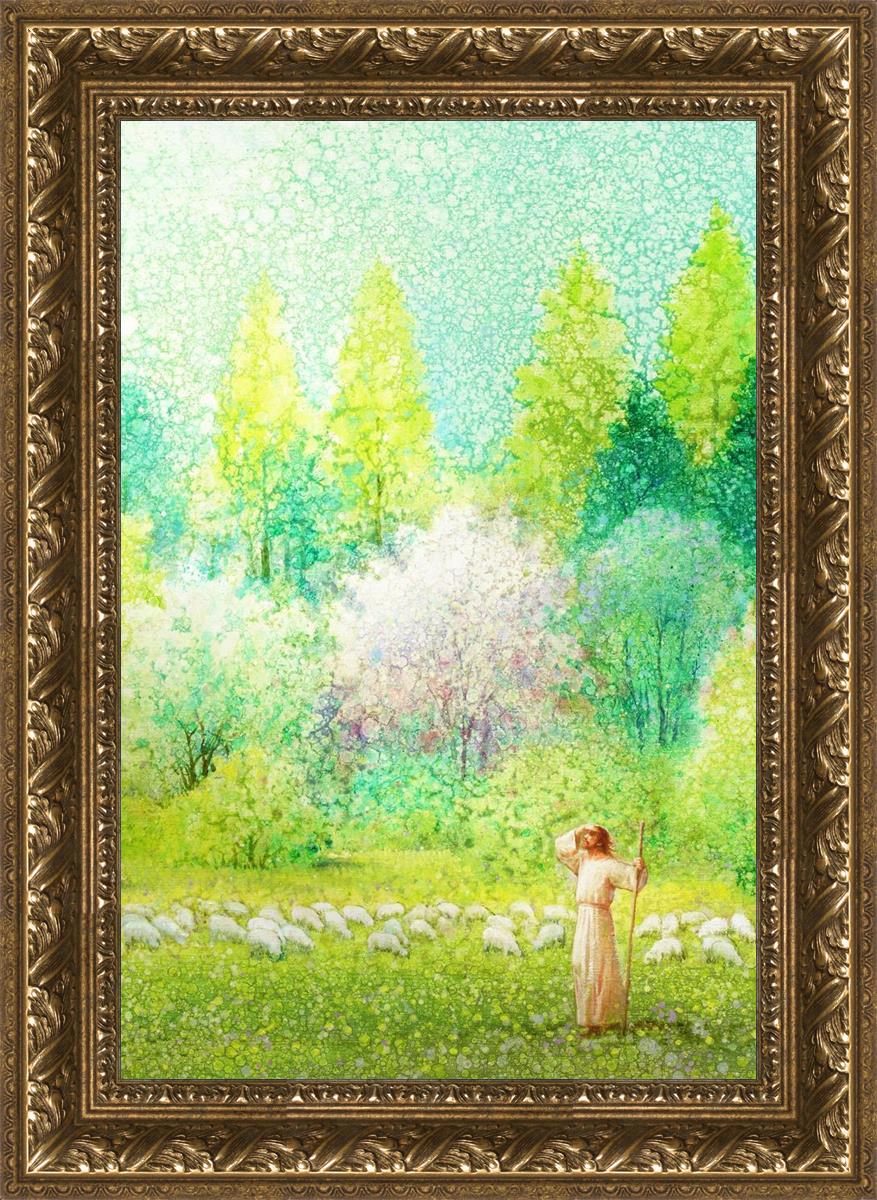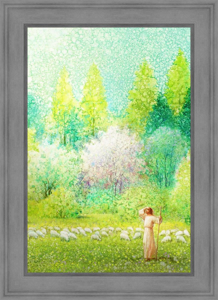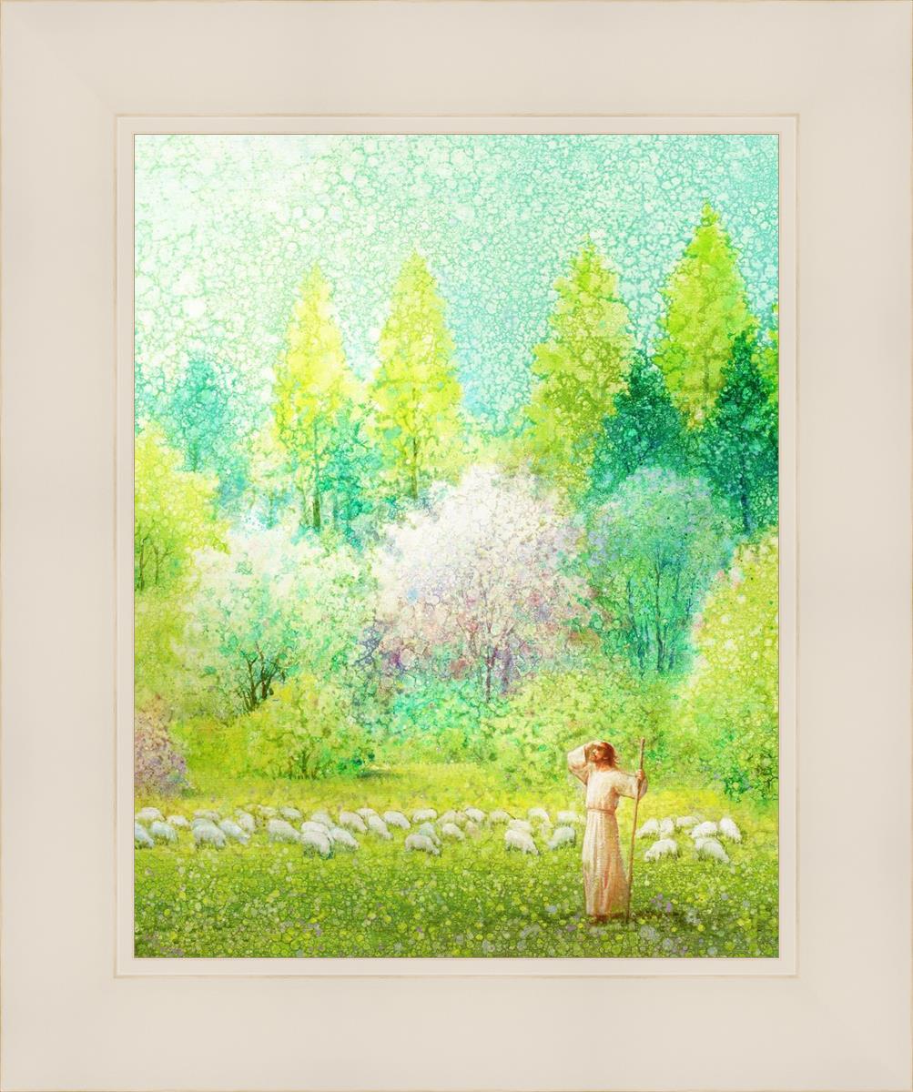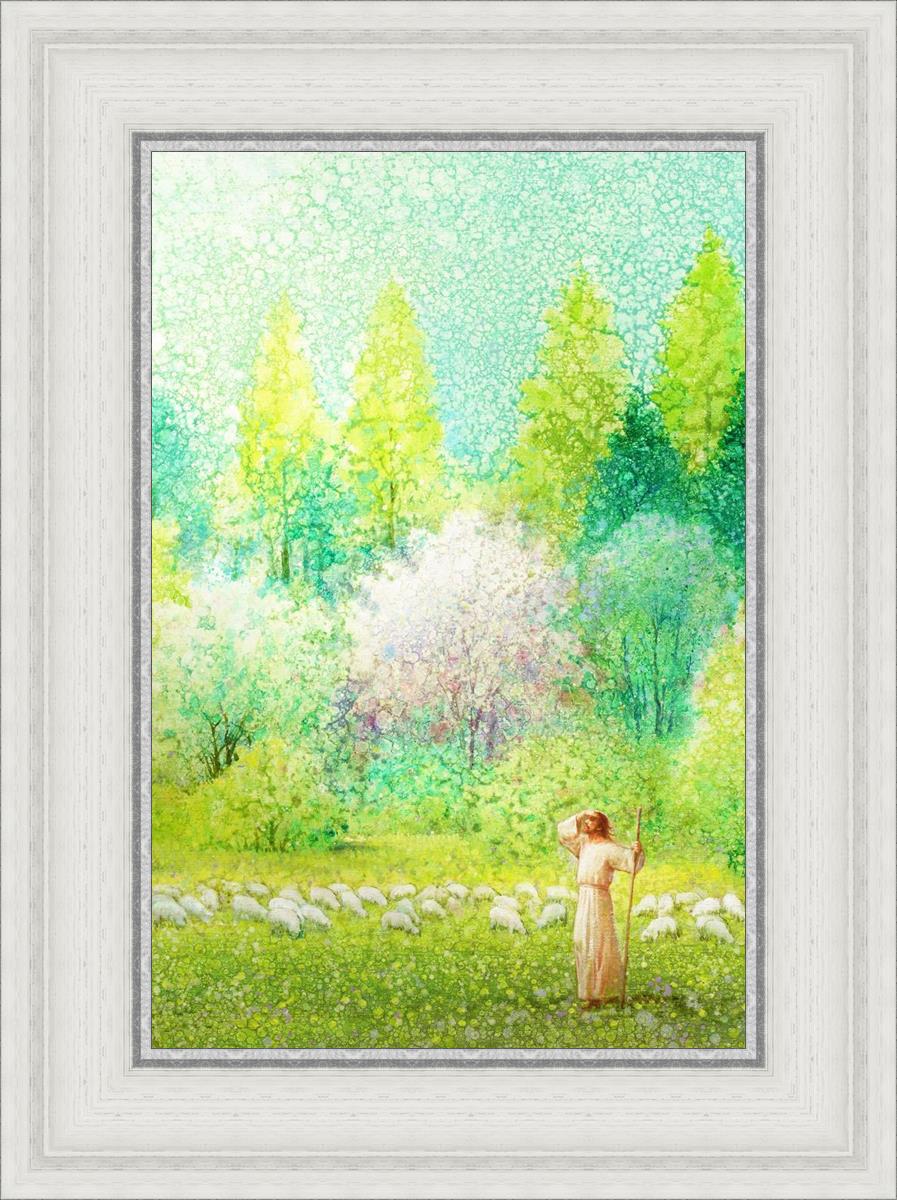 In this artwork, Jesus Christ stands tall in the midst of a lush green field, His hand shielding His eyes from the brilliance of the sun, as if carefully surveying the landscape. With His staff in hand, He exudes a sense of gentle authority and leadership, guiding those who follow Him. The surrounding flock of sheep symbolize the faithful, with the peaceful field serving as a representation of spiritual growth and the promise of safety. He Shall Find What is Lost reminds us of hope, divine care, and the unending search for what is lost, bringing a powerful sense of comfort and assurance.