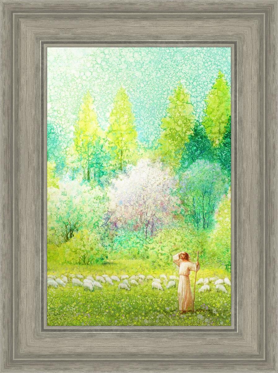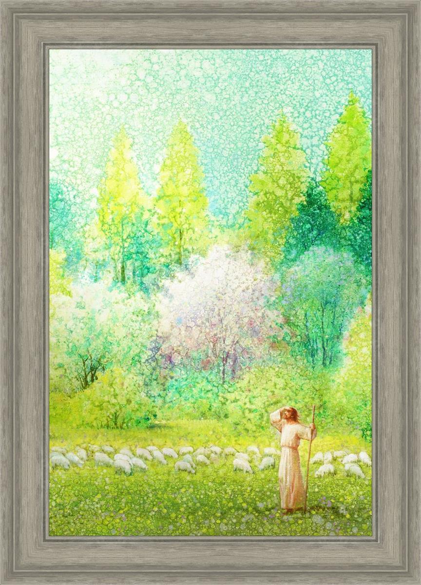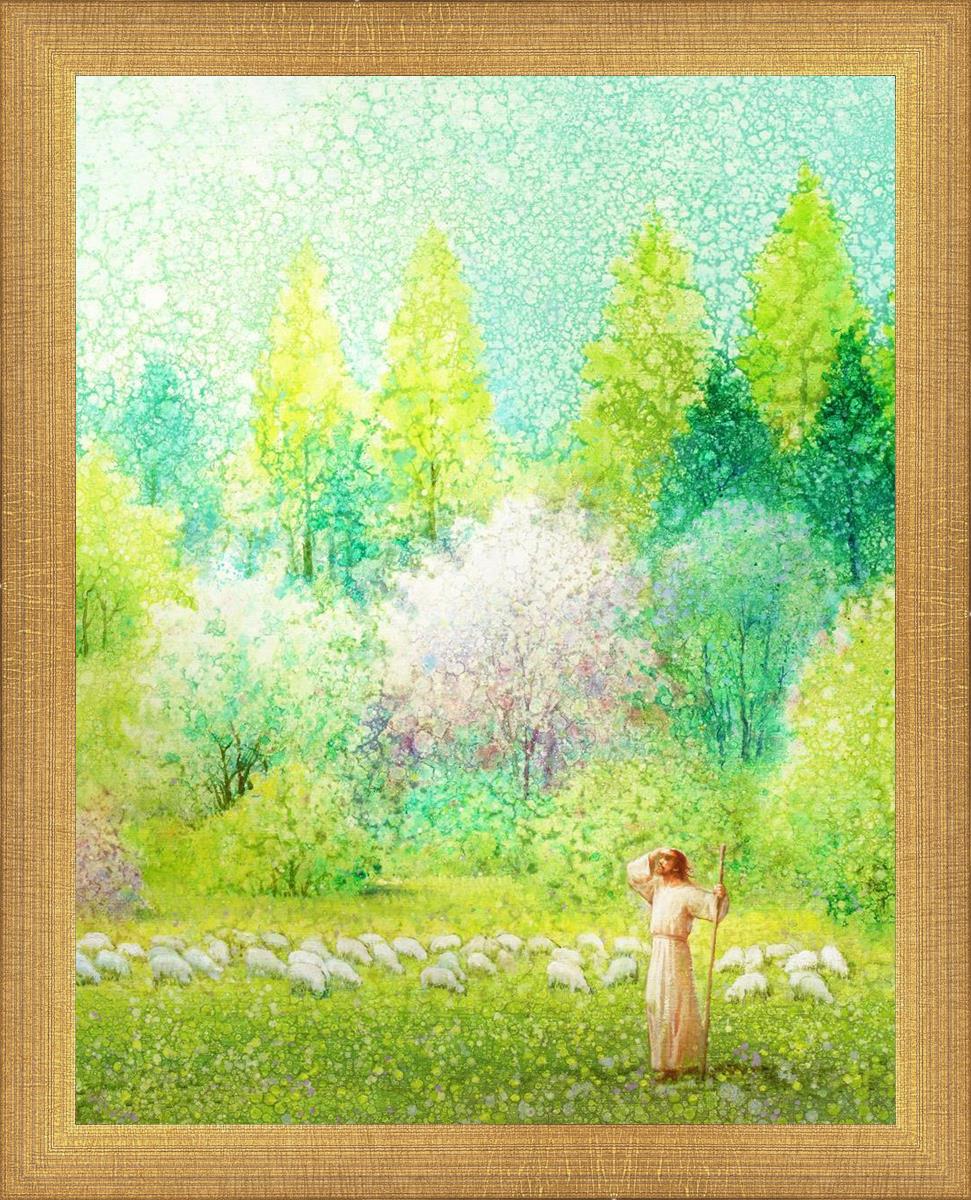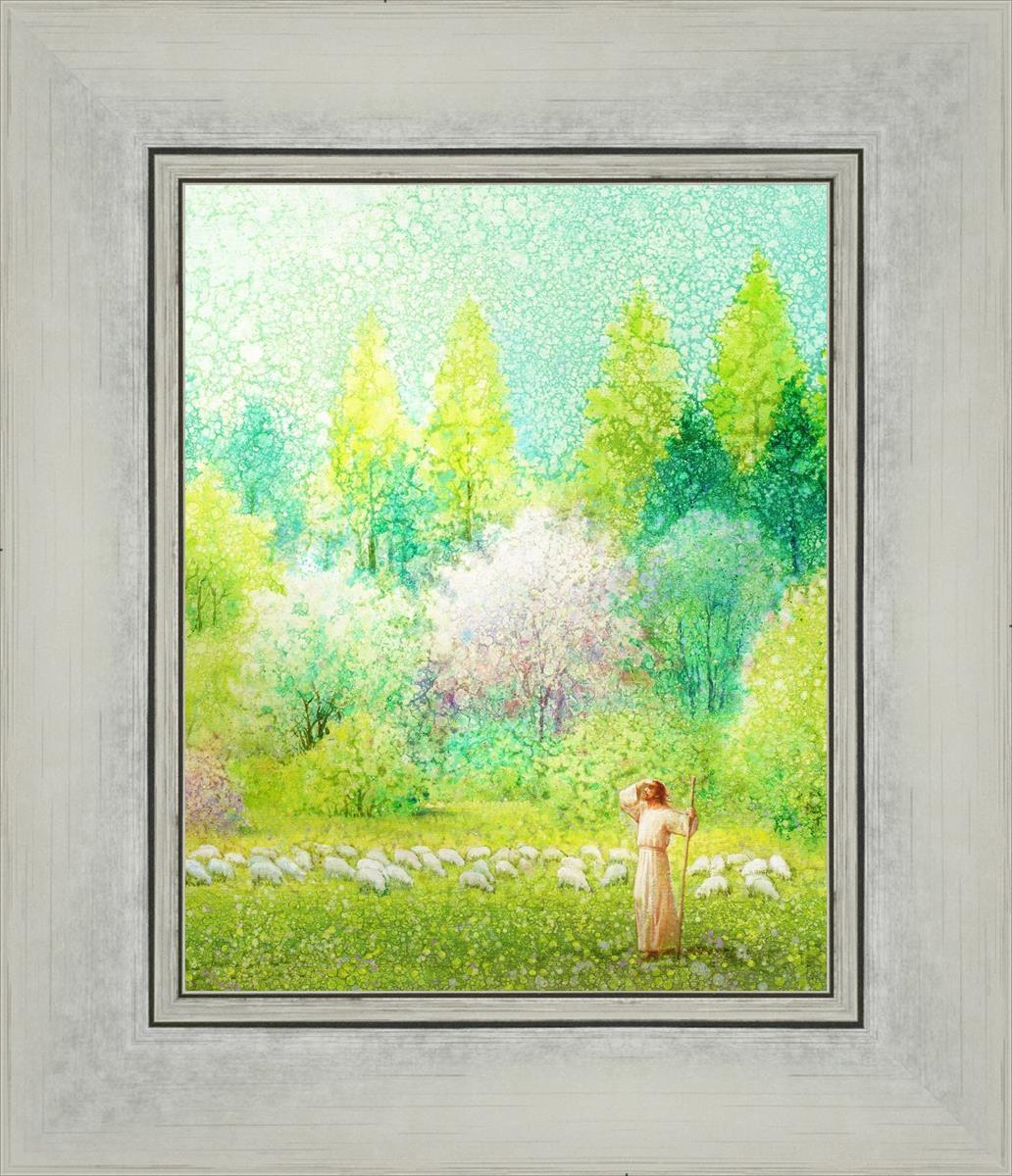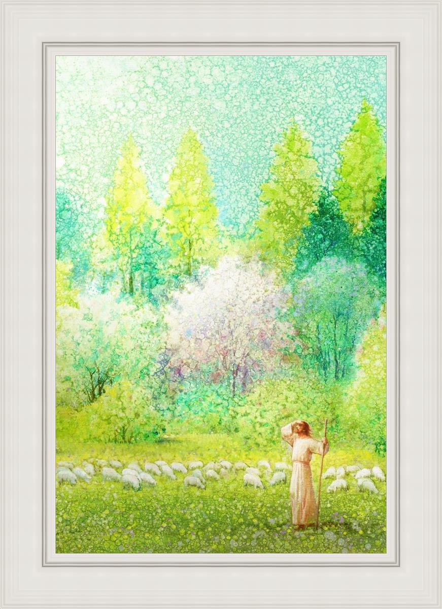 In this artwork, Jesus Christ stands tall in the midst of a lush green field, His hand shielding His eyes from the brilliance of the sun, as if carefully surveying the landscape. With His staff in hand, He exudes a sense of gentle authority and leadership, guiding those who follow Him. The surrounding flock of sheep symbolize the faithful, with the peaceful field serving as a representation of spiritual growth and the promise of safety. He Shall Find What is Lost reminds us of hope, divine care, and the unending search for what is lost, bringing a powerful sense of comfort and assurance.