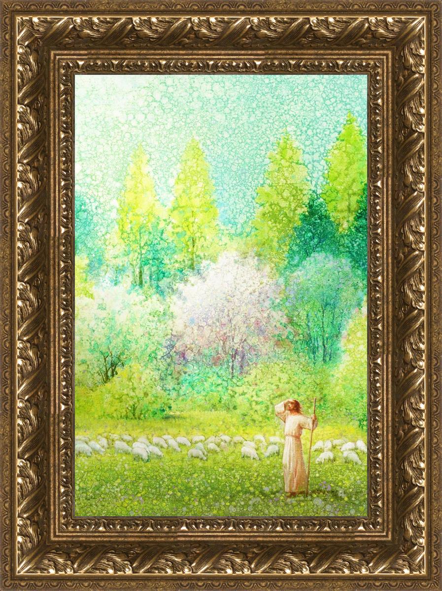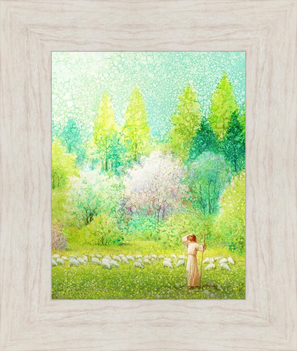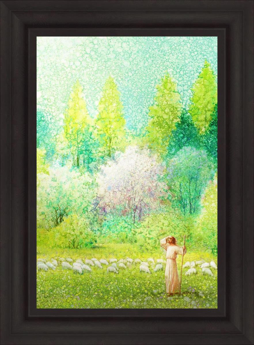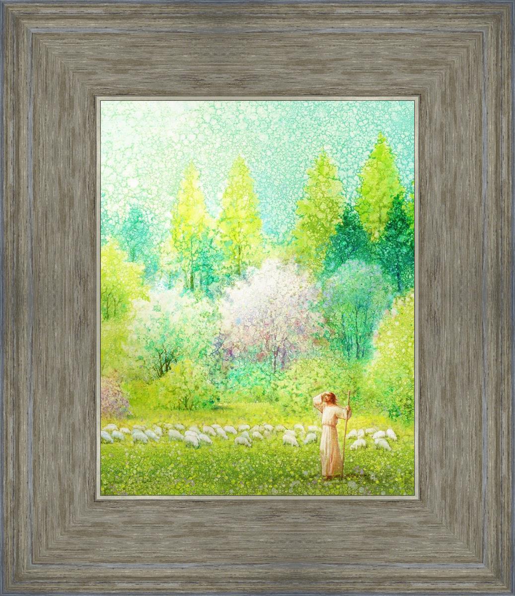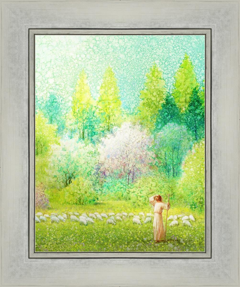 In this artwork, Jesus Christ stands tall in the midst of a lush green field, His hand shielding His eyes from the brilliance of the sun, as if carefully surveying the landscape. With His staff in hand, He exudes a sense of gentle authority and leadership, guiding those who follow Him. The surrounding flock of sheep symbolize the faithful, with the peaceful field serving as a representation of spiritual growth and the promise of safety. He Shall Find What is Lost reminds us of hope, divine care, and the unending search for what is lost, bringing a powerful sense of comfort and assurance.