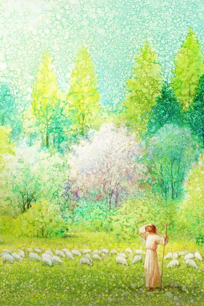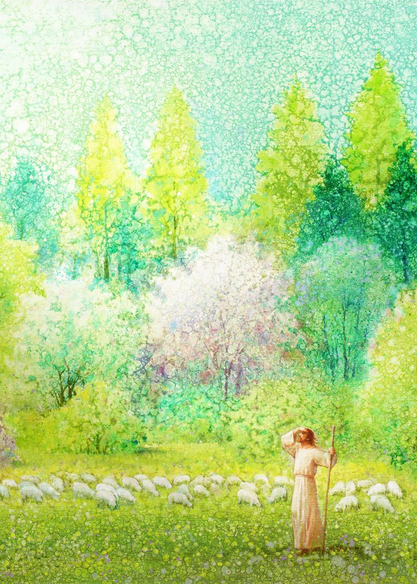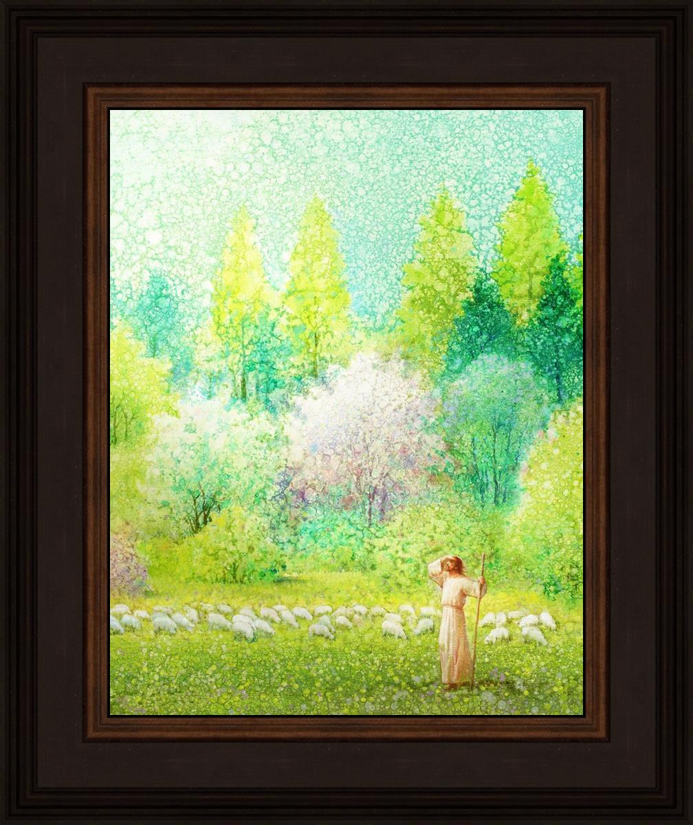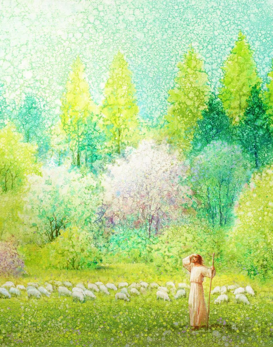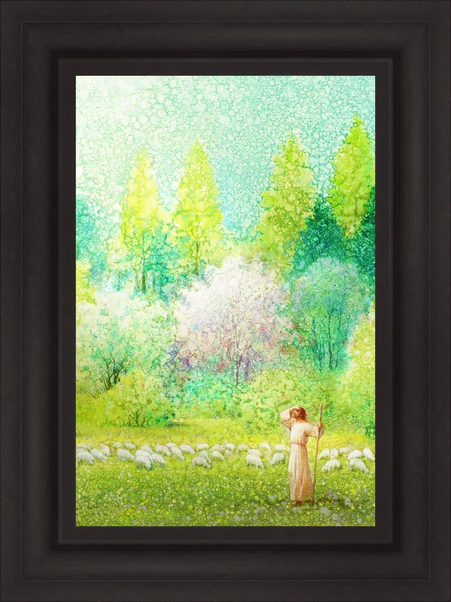 In this artwork, Jesus Christ stands tall in the midst of a lush green field, His hand shielding His eyes from the brilliance of the sun, as if carefully surveying the landscape. With His staff in hand, He exudes a sense of gentle authority and leadership, guiding those who follow Him. The surrounding flock of sheep symbolize the faithful, with the peaceful field serving as a representation of spiritual growth and the promise of safety. He Shall Find What is Lost reminds us of hope, divine care, and the unending search for what is lost, bringing a powerful sense of comfort and assurance.