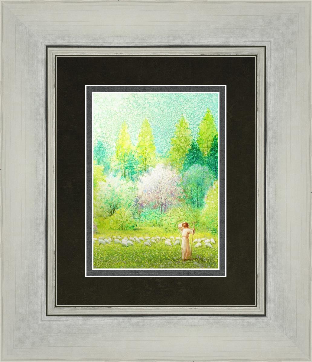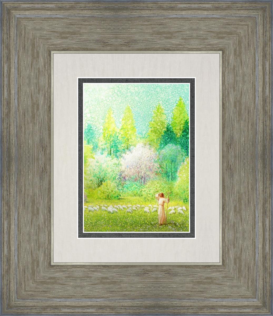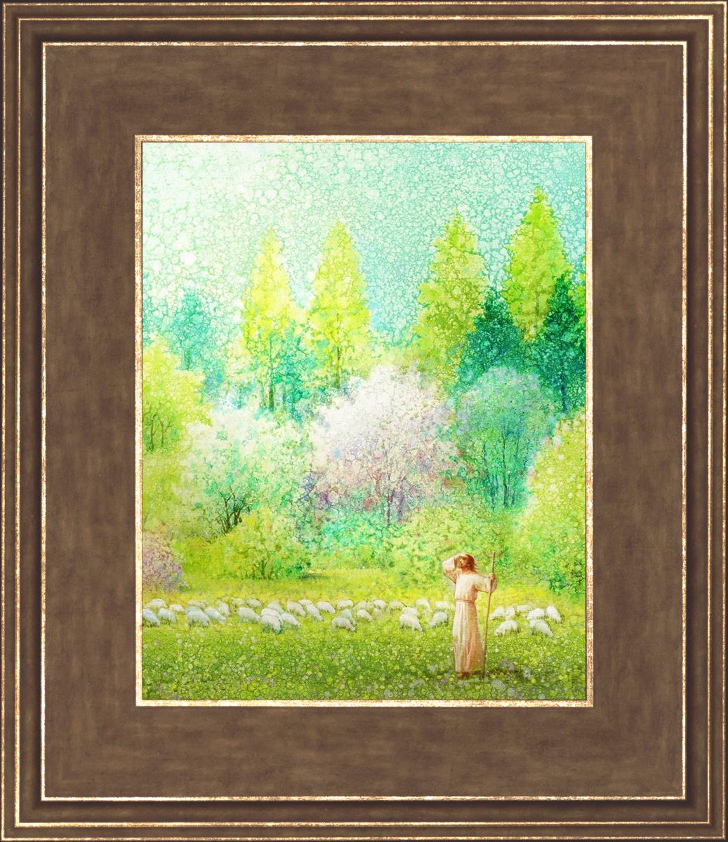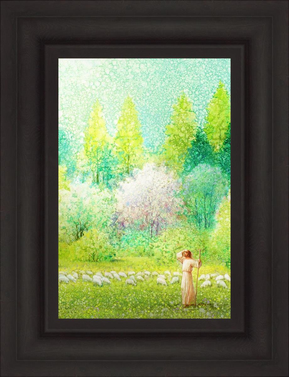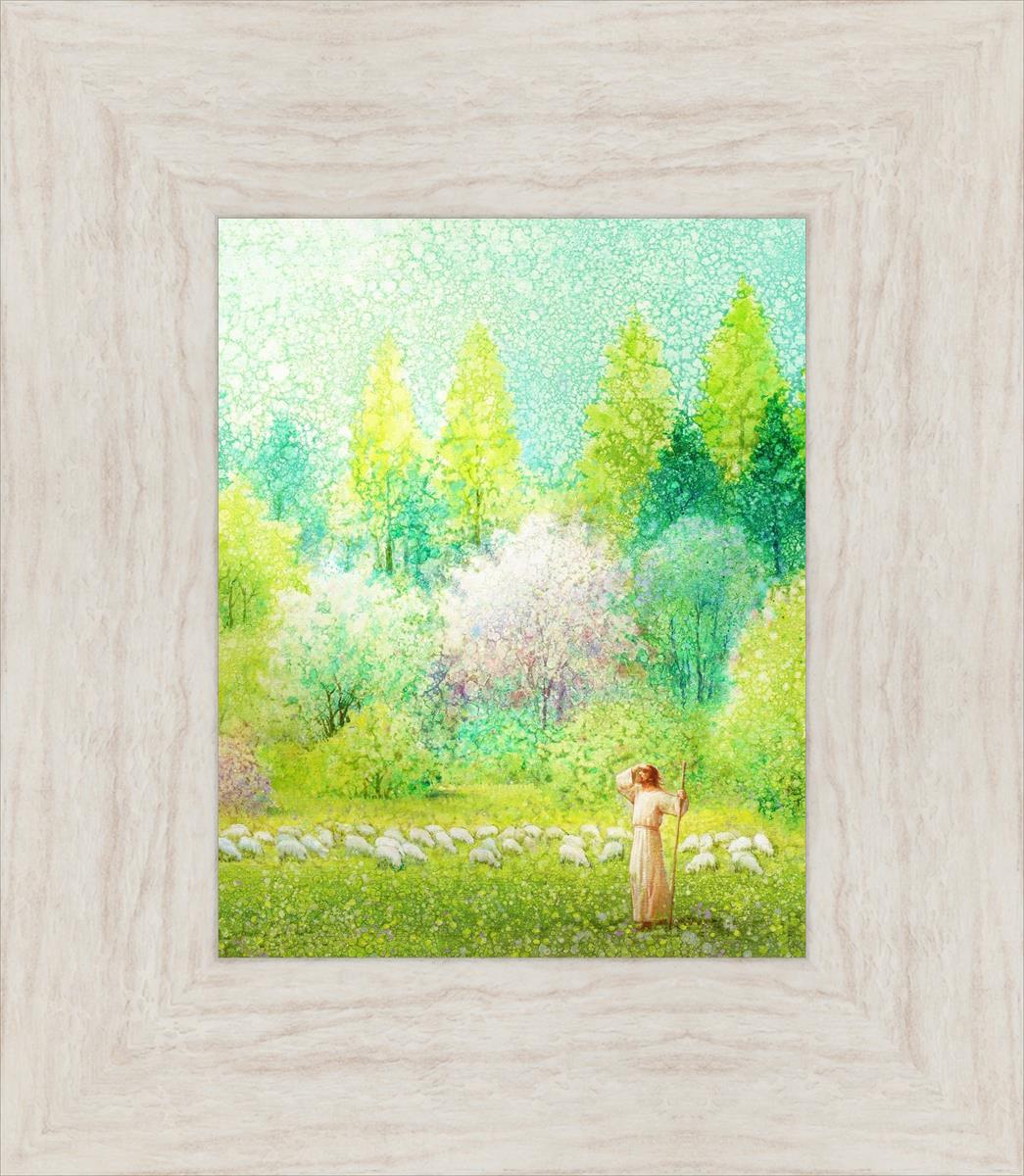 In this artwork, Jesus Christ stands tall in the midst of a lush green field, His hand shielding His eyes from the brilliance of the sun, as if carefully surveying the landscape. With His staff in hand, He exudes a sense of gentle authority and leadership, guiding those who follow Him. The surrounding flock of sheep symbolize the faithful, with the peaceful field serving as a representation of spiritual growth and the promise of safety. He Shall Find What is Lost reminds us of hope, divine care, and the unending search for what is lost, bringing a powerful sense of comfort and assurance.