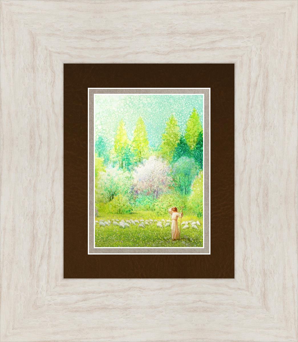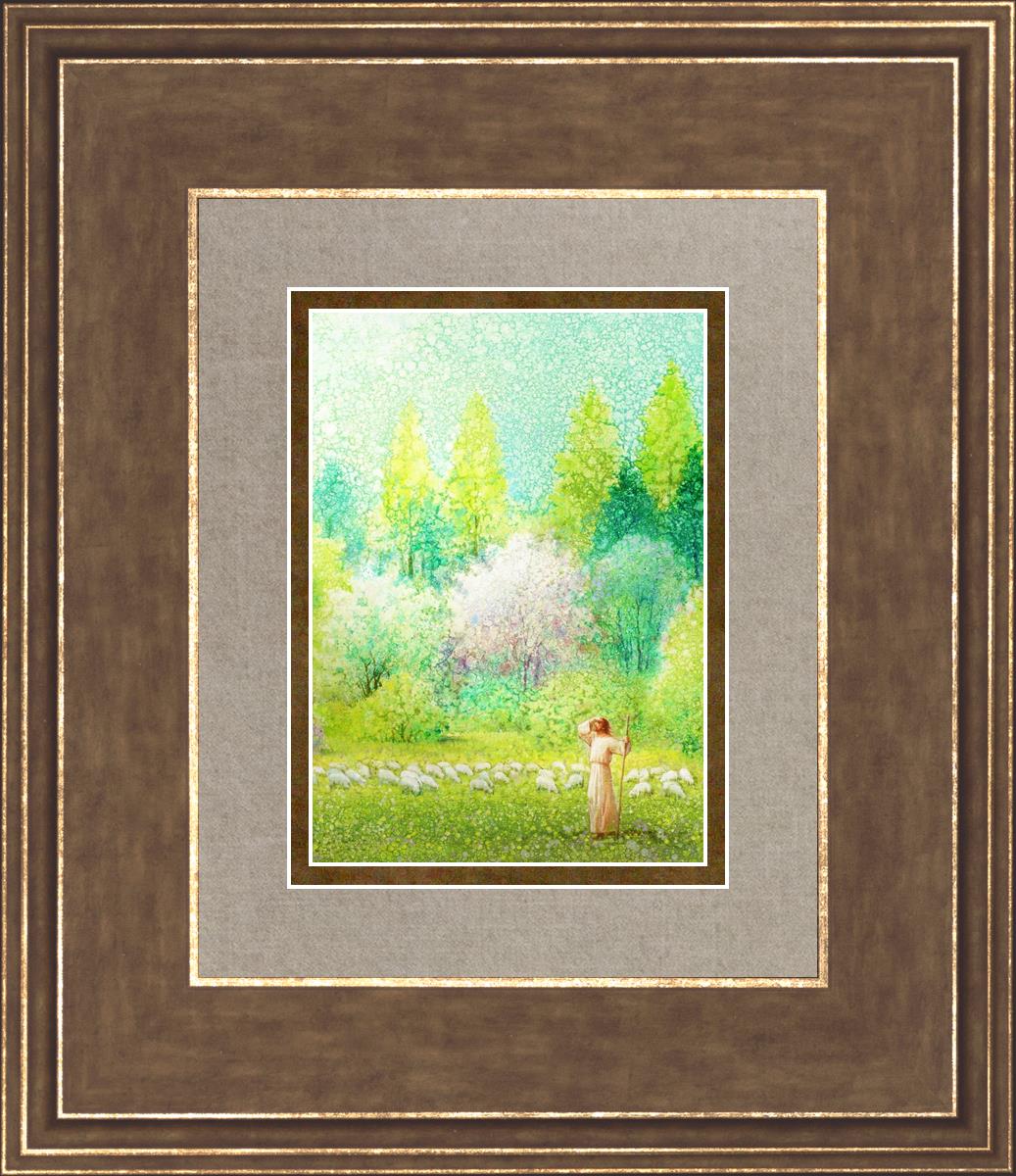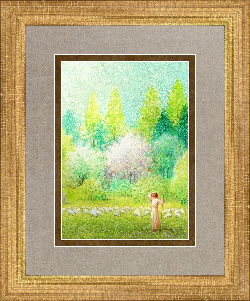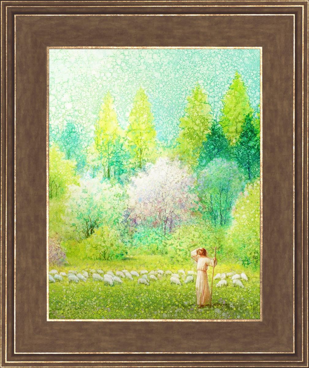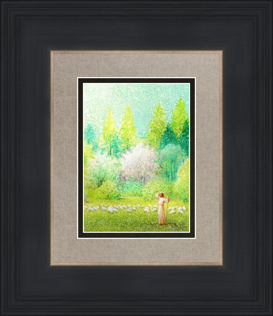 In this artwork, Jesus Christ stands tall in the midst of a lush green field, His hand shielding His eyes from the brilliance of the sun, as if carefully surveying the landscape. With His staff in hand, He exudes a sense of gentle authority and leadership, guiding those who follow Him. The surrounding flock of sheep symbolize the faithful, with the peaceful field serving as a representation of spiritual growth and the promise of safety. He Shall Find What is Lost reminds us of hope, divine care, and the unending search for what is lost, bringing a powerful sense of comfort and assurance.