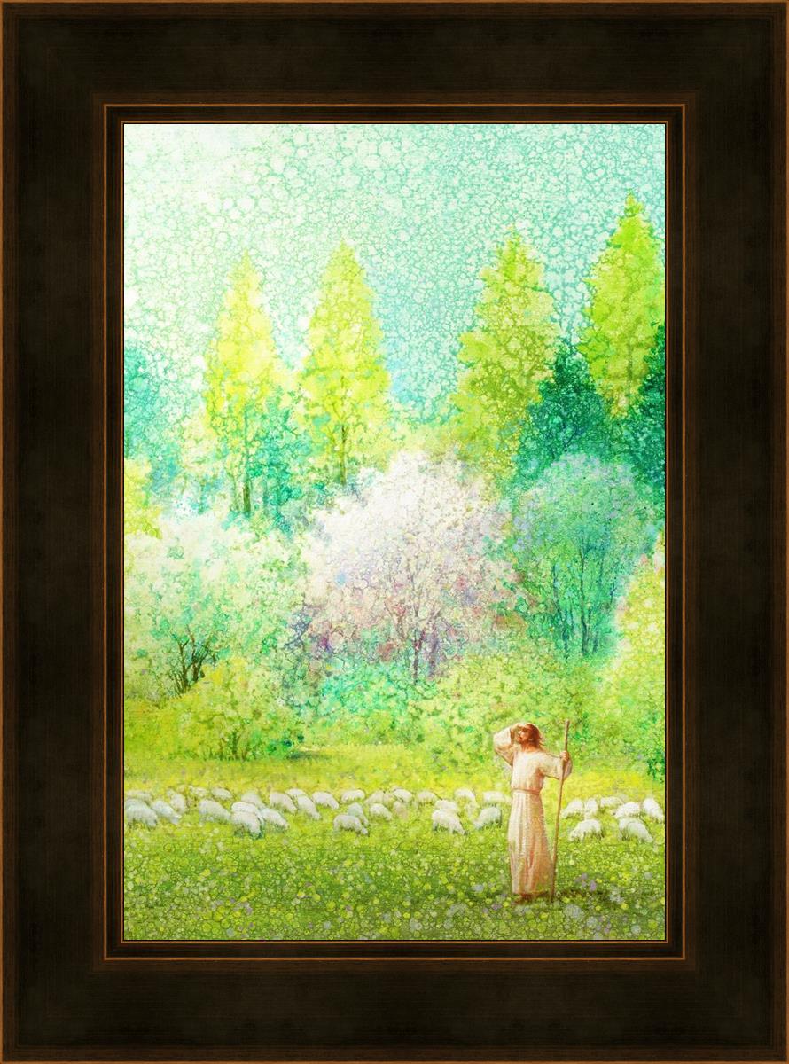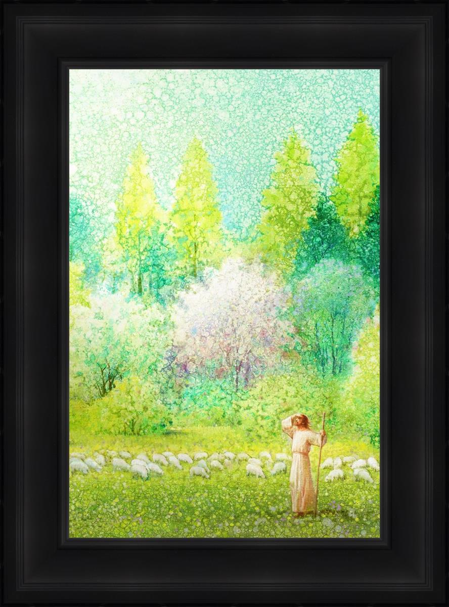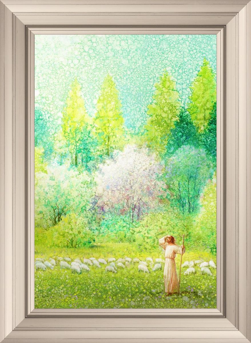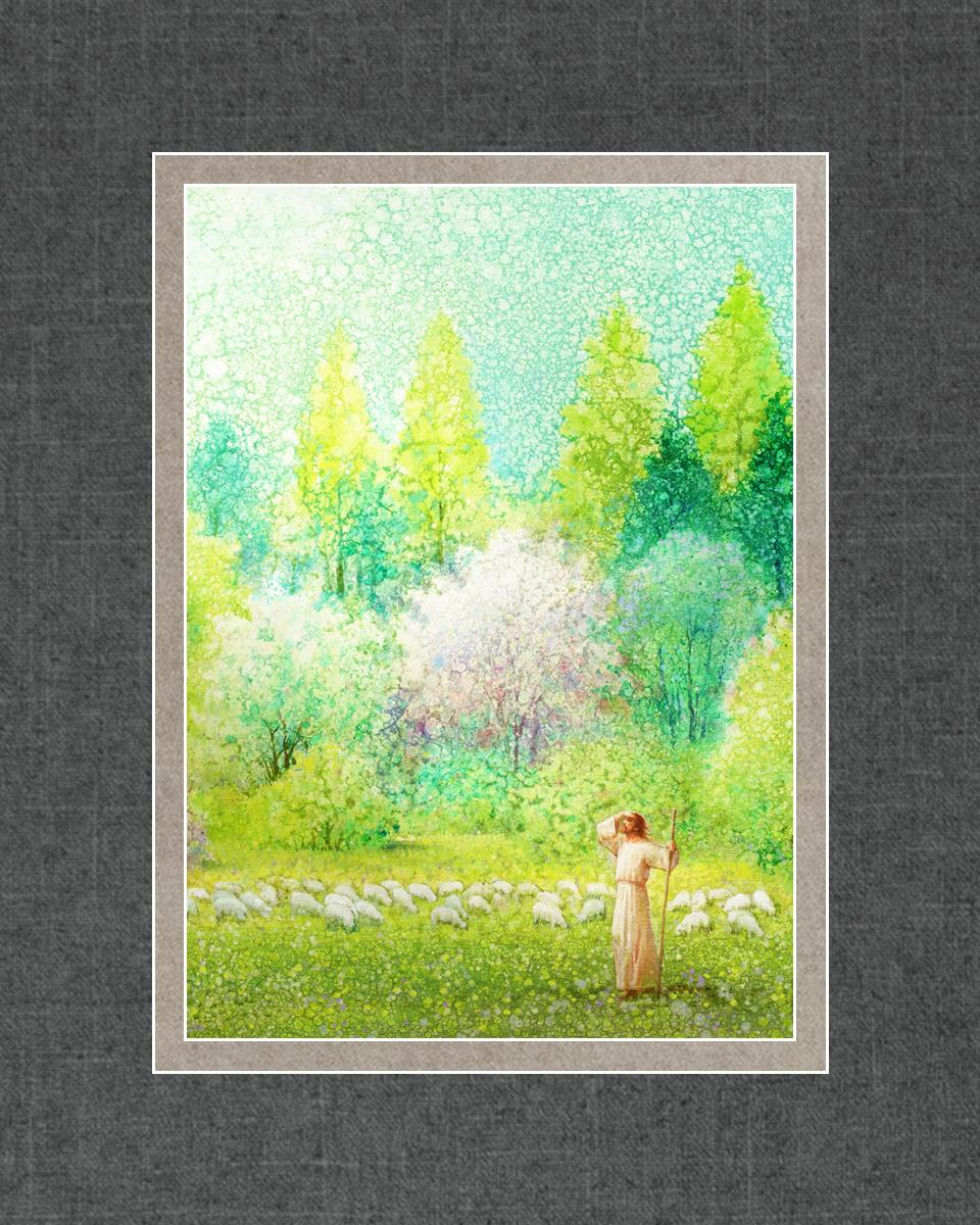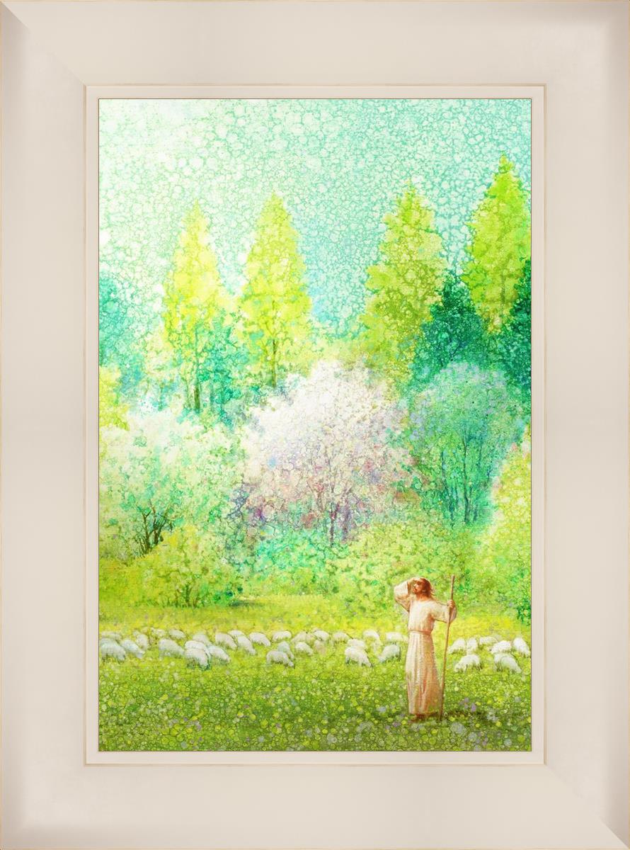 In this artwork, Jesus Christ stands tall in the midst of a lush green field, His hand shielding His eyes from the brilliance of the sun, as if carefully surveying the landscape. With His staff in hand, He exudes a sense of gentle authority and leadership, guiding those who follow Him. The surrounding flock of sheep symbolize the faithful, with the peaceful field serving as a representation of spiritual growth and the promise of safety. He Shall Find What is Lost reminds us of hope, divine care, and the unending search for what is lost, bringing a powerful sense of comfort and assurance.