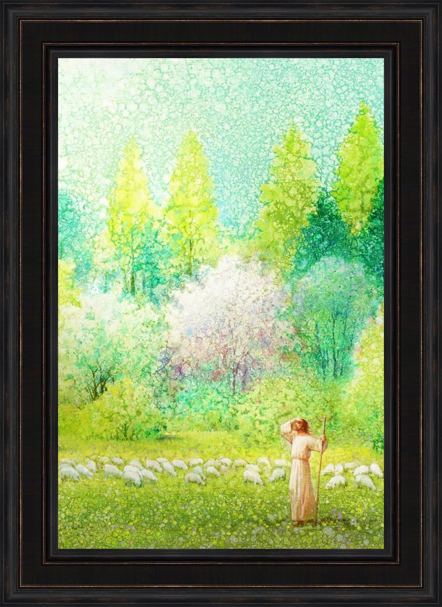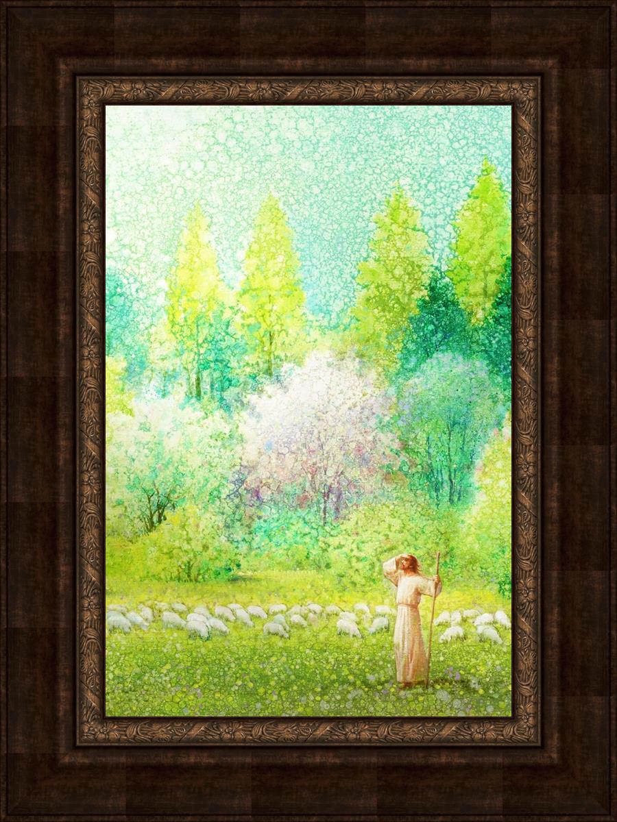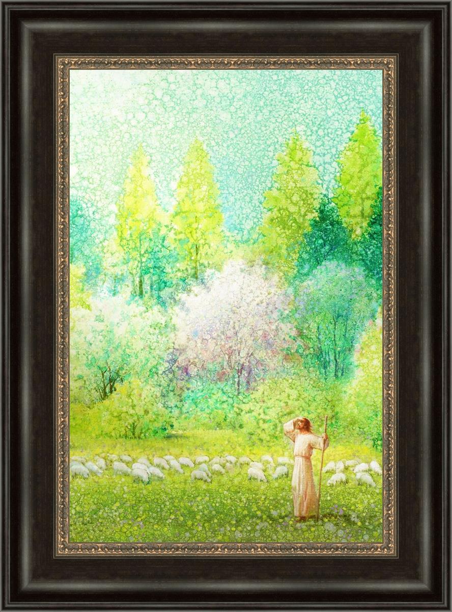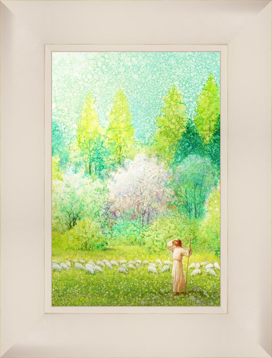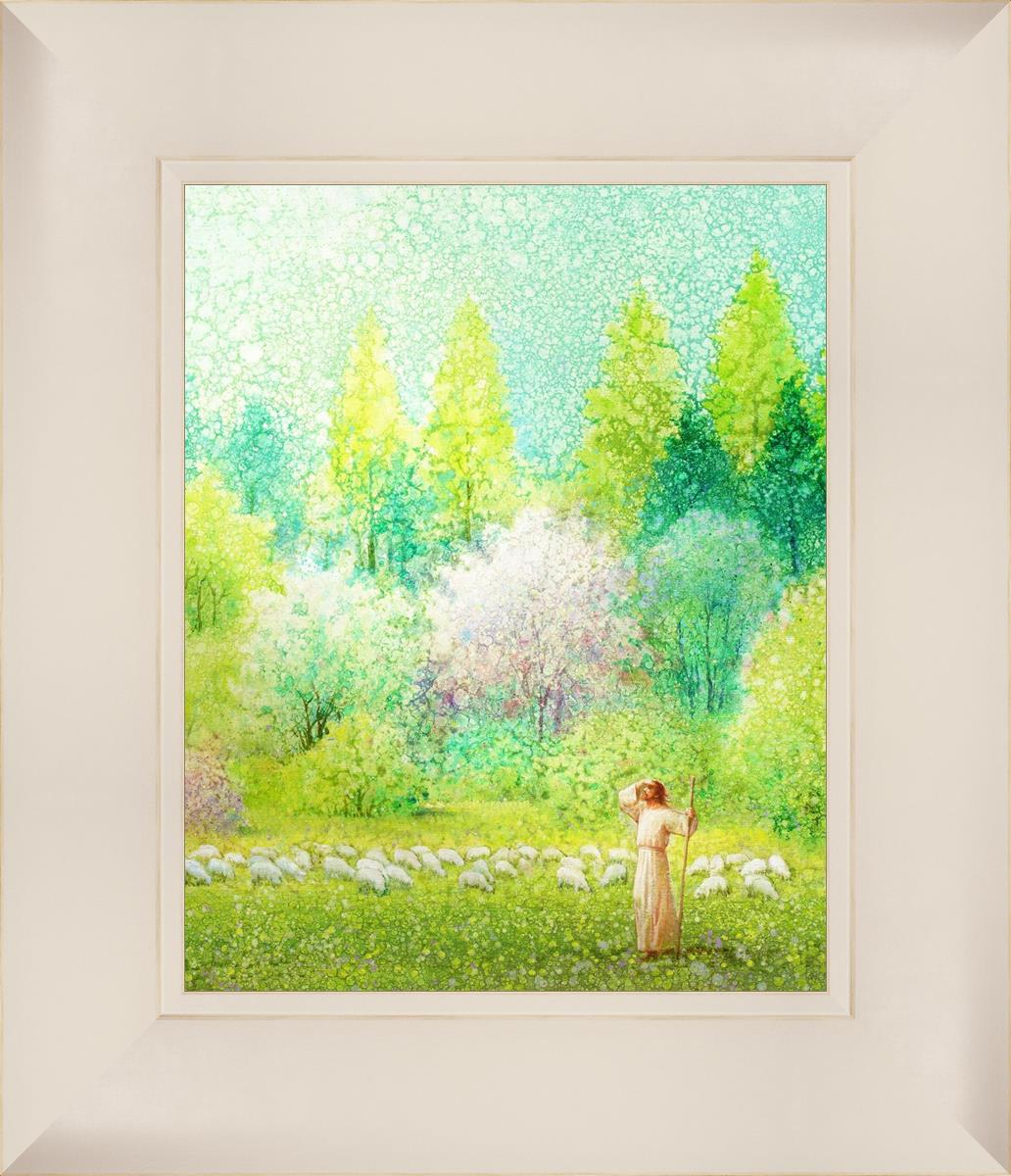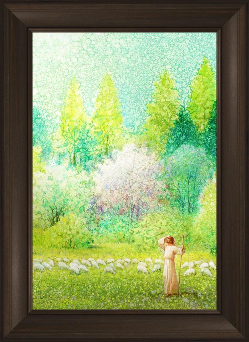 In this artwork, Jesus Christ stands tall in the midst of a lush green field, His hand shielding His eyes from the brilliance of the sun, as if carefully surveying the landscape. With His staff in hand, He exudes a sense of gentle authority and leadership, guiding those who follow Him. The surrounding flock of sheep symbolize the faithful, with the peaceful field serving as a representation of spiritual growth and the promise of safety. He Shall Find What is Lost reminds us of hope, divine care, and the unending search for what is lost, bringing a powerful sense of comfort and assurance.