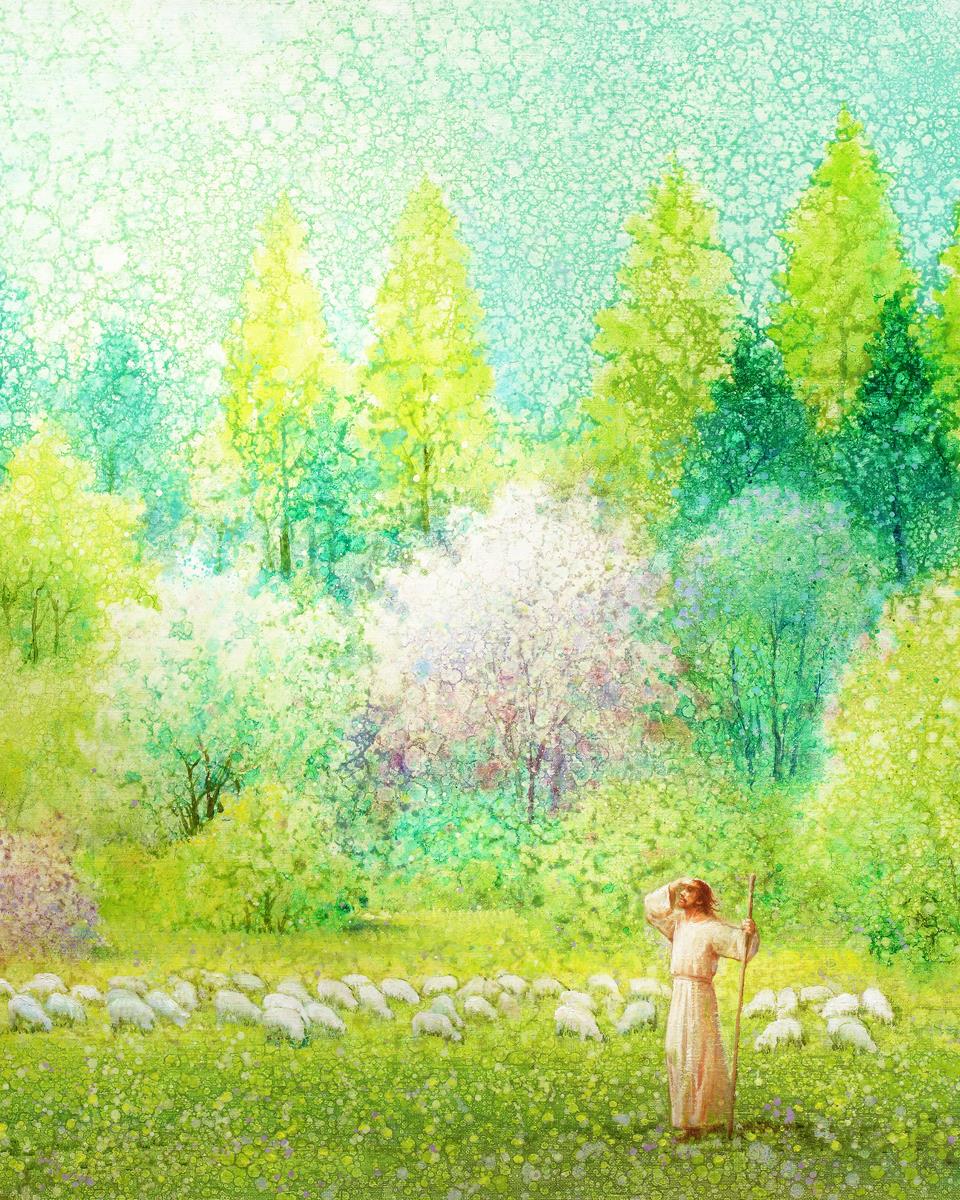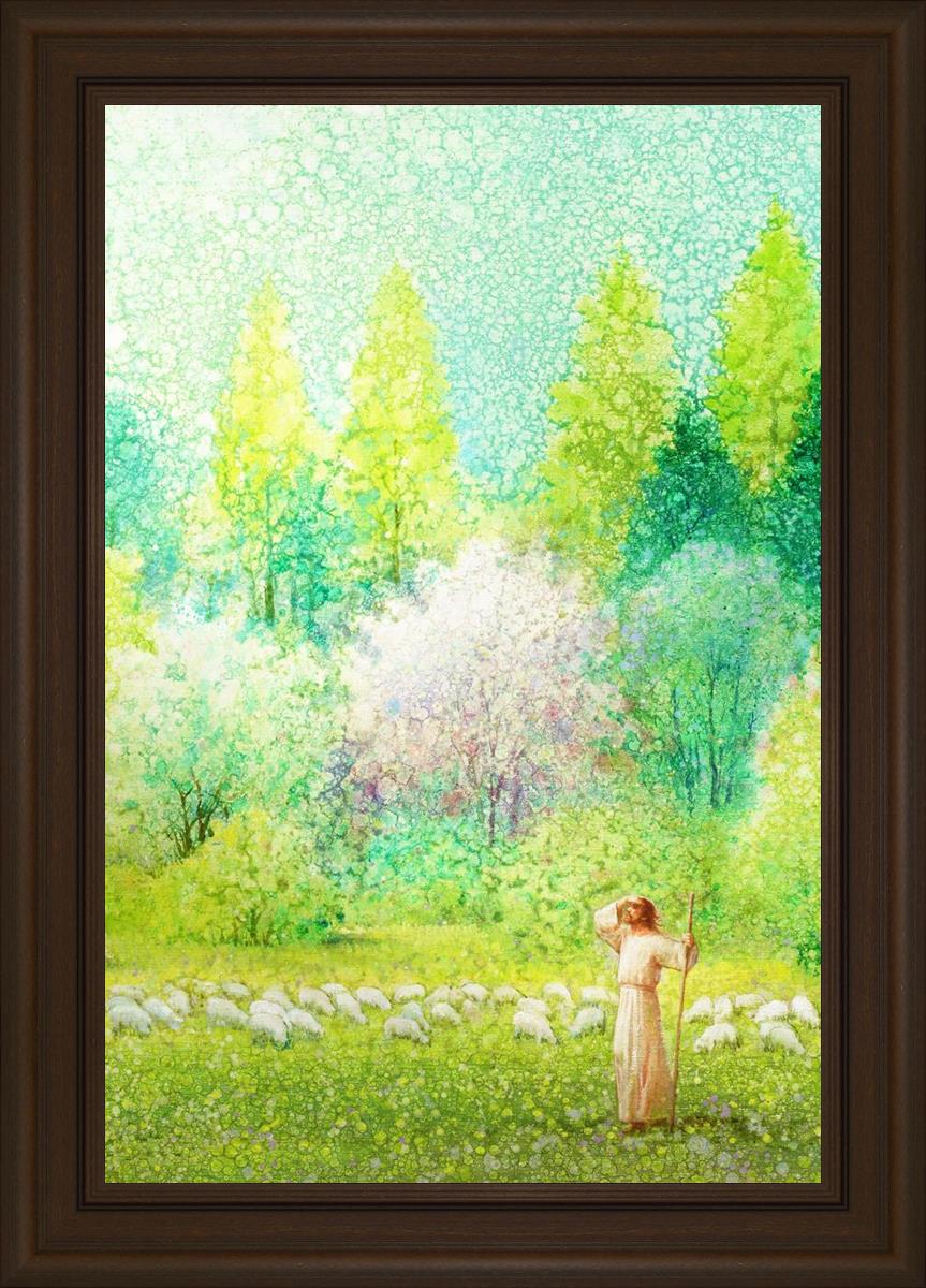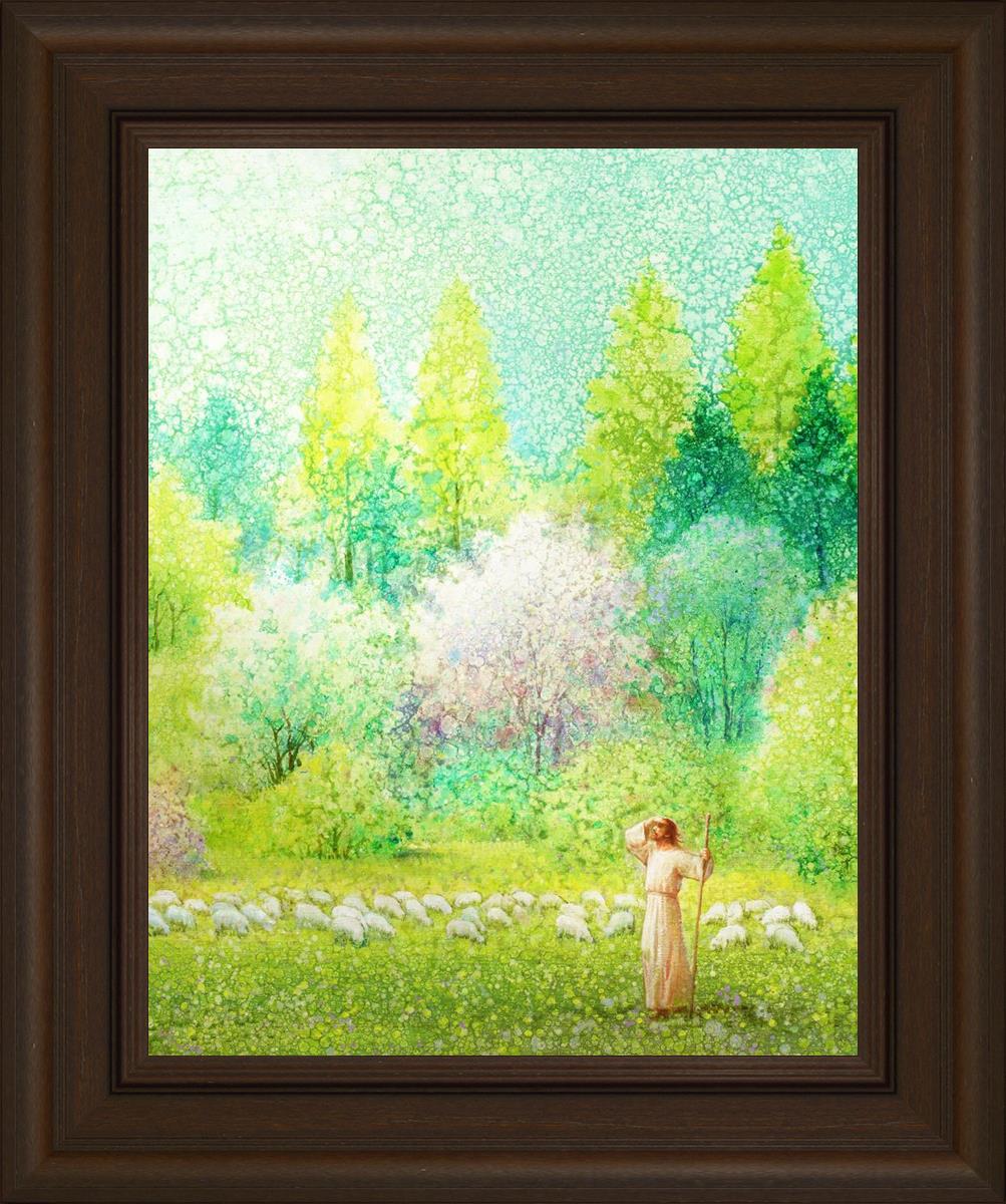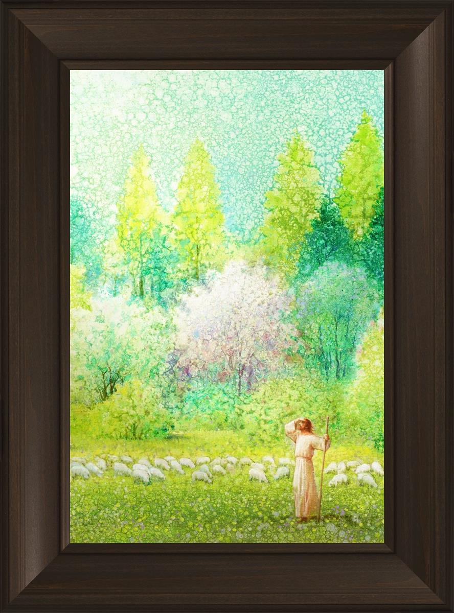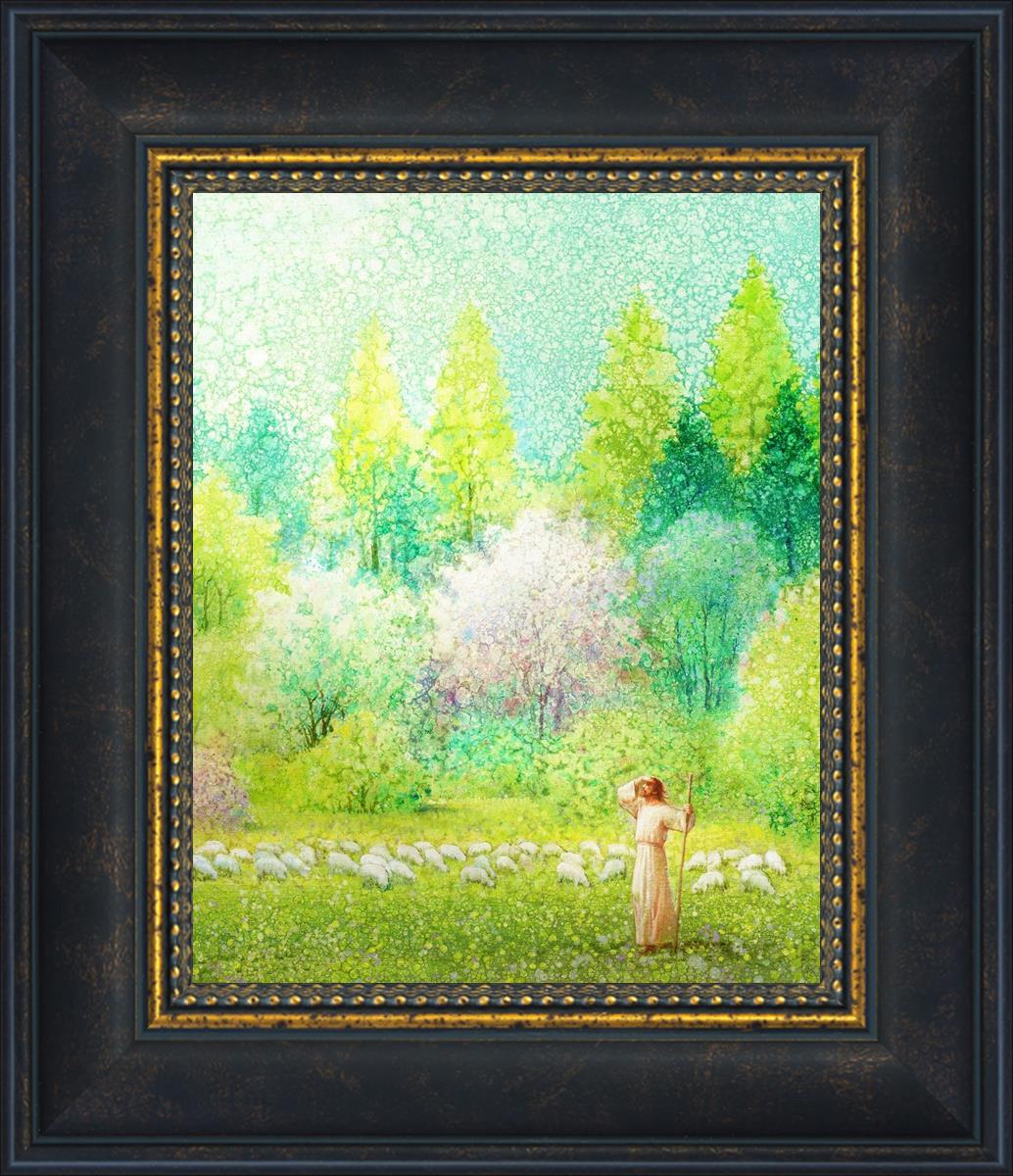 In this artwork, Jesus Christ stands tall in the midst of a lush green field, His hand shielding His eyes from the brilliance of the sun, as if carefully surveying the landscape. With His staff in hand, He exudes a sense of gentle authority and leadership, guiding those who follow Him. The surrounding flock of sheep symbolize the faithful, with the peaceful field serving as a representation of spiritual growth and the promise of safety. He Shall Find What is Lost reminds us of hope, divine care, and the unending search for what is lost, bringing a powerful sense of comfort and assurance.